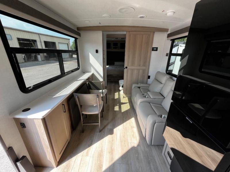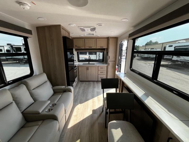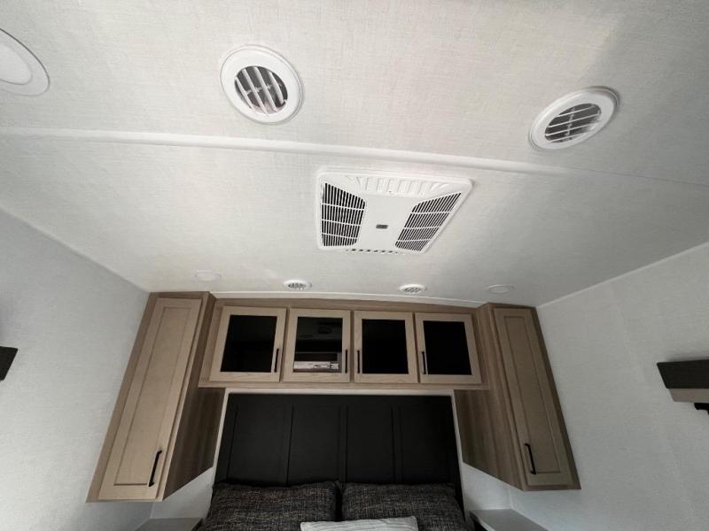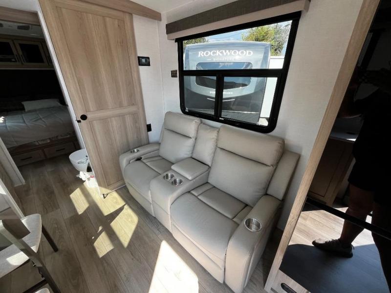 This Rockwood Ultra Lite 301FKT is fit for a cook! As soon as you step inside, you're greeted by the spacious front kitchen. Designed for convenience and style, it has long solid surface countertops that provide ample space for meal prep and organizing utensils. The overhead cabinets offer plenty of room to store dishes and ingredients for all your favorite recipes. After cooking, you can unwind on the 67" theater seat facing a TV with a lift, perfect for movie nights or catching up on your favorite shows. For meals, enjoy dining at the flip-up table with folding chairs, ideal for sharing breakfast, lunch, or dinner with your partner. And when it's time to relax, a full bathroom leads to the rear bedroom, where a king-sized bed awaits to give you a restful night's sleep.