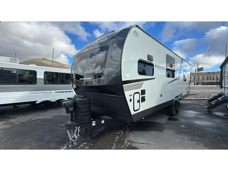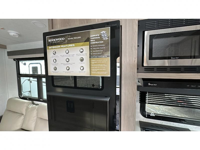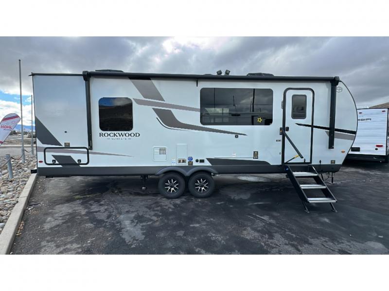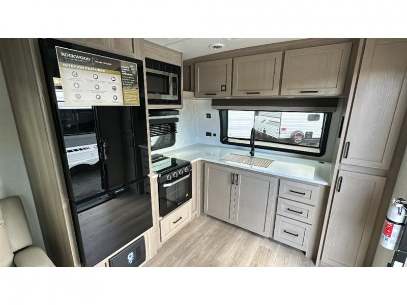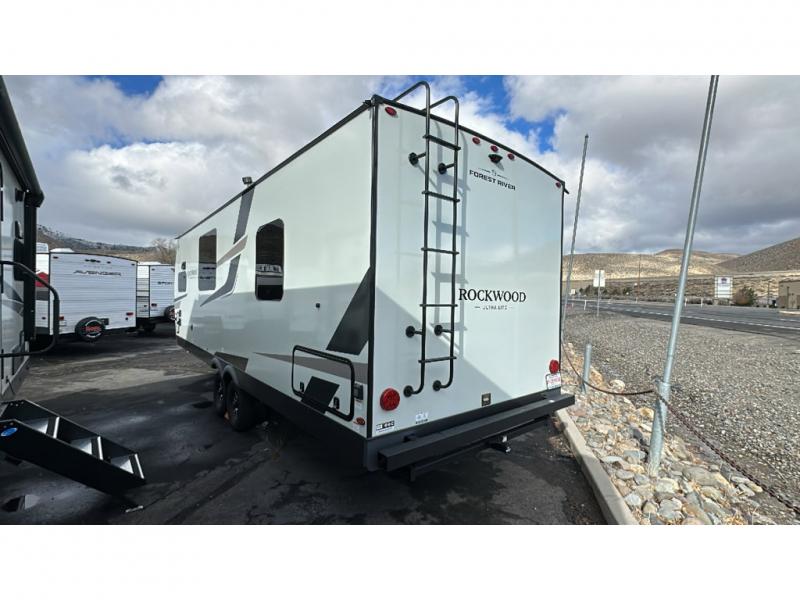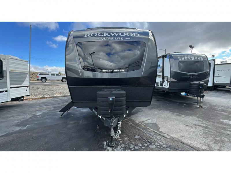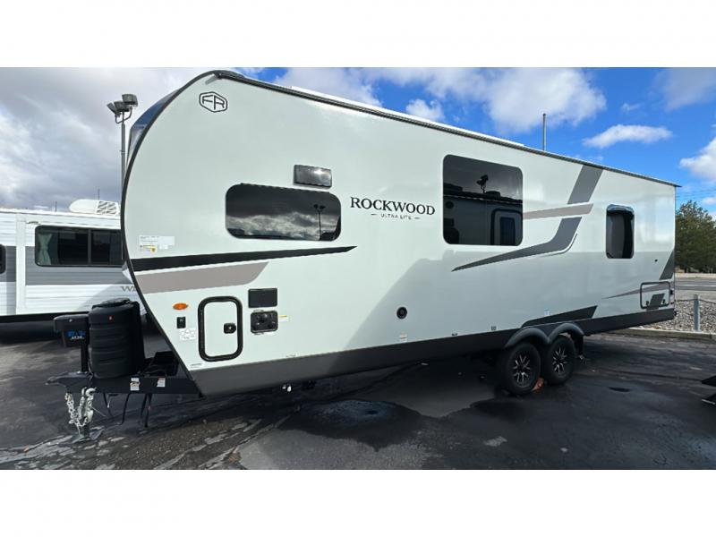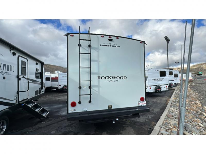 Each Rockwood Ultra Lite travel trailer by Forest River includes superior construction with a high gloss fiberglass cap, aluminum cage construction, and a power awning with LED lighting for a cozy and functional outdoor space. The torsion axle, power tongue jack will make towing smooth and hassle-free, along with the nitrogen filled, Goodyear Endurance tires and the tire pressure monitor system. Interior comforts include kitchen sink with high rise faucet, hidden hinge cabinet doors, and roller shades to name a few. Choose a Rockwood Ultra Lite travel trailer today!