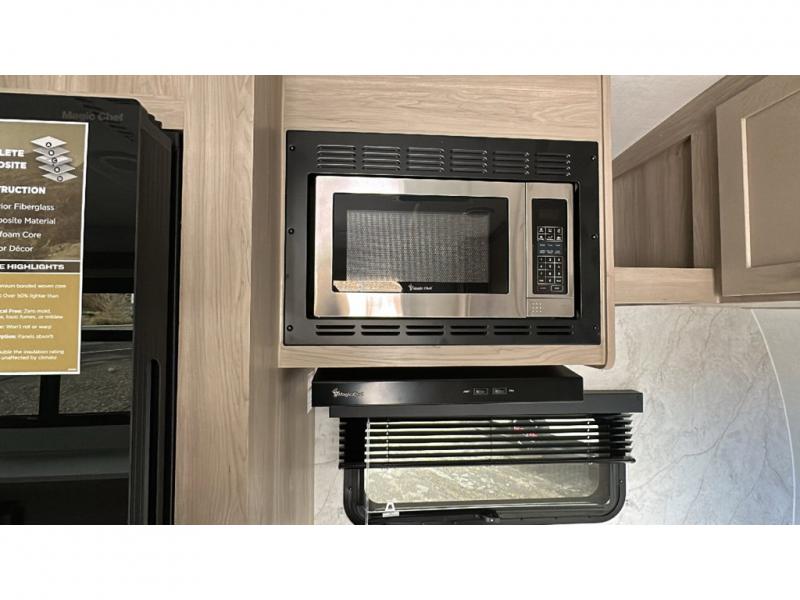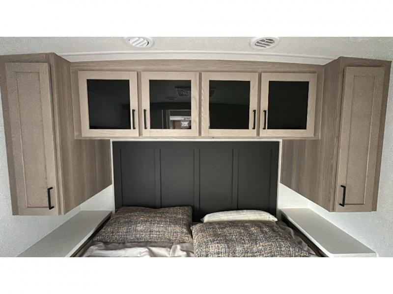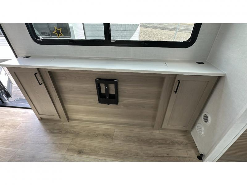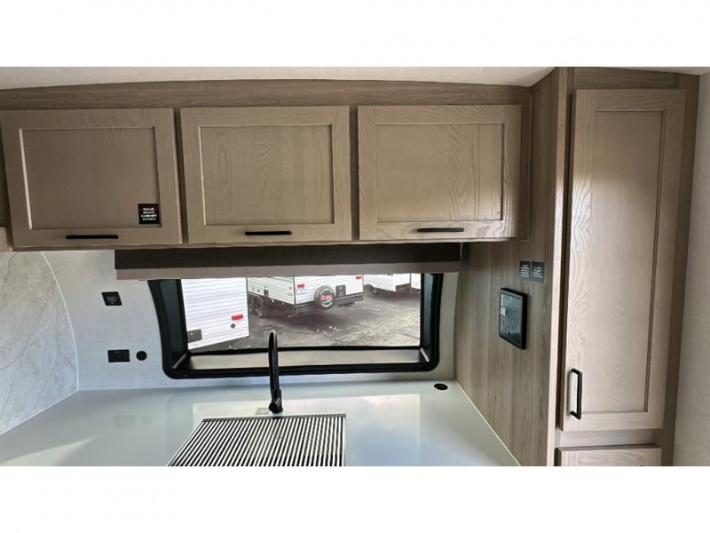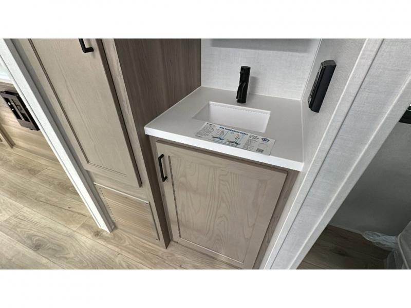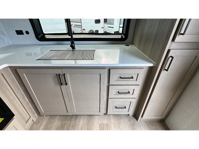 This Rockwood Ultra Lite 301FKT is fit for a cook! As soon as you step inside, you're greeted by the spacious front kitchen. Designed for convenience and style, it has long solid surface countertops that provide ample space for meal prep and organizing utensils. The overhead cabinets offer plenty of room to store dishes and ingredients for all your favorite recipes. After cooking, you can unwind on the 67" theater seat facing a TV with a lift, perfect for movie nights or catching up on your favorite shows. For meals, enjoy dining at the flip-up table with folding chairs, ideal for sharing breakfast, lunch, or dinner with your partner. And when it's time to relax, a full bathroom leads to the rear bedroom, where a king-sized bed awaits to give you a restful night's sleep.