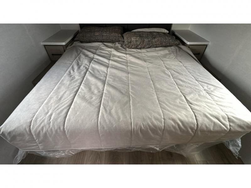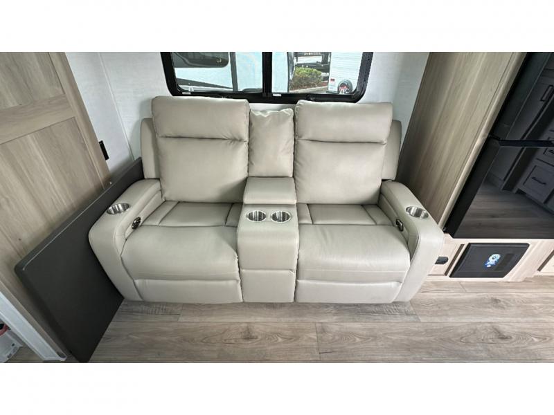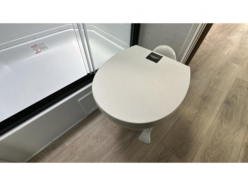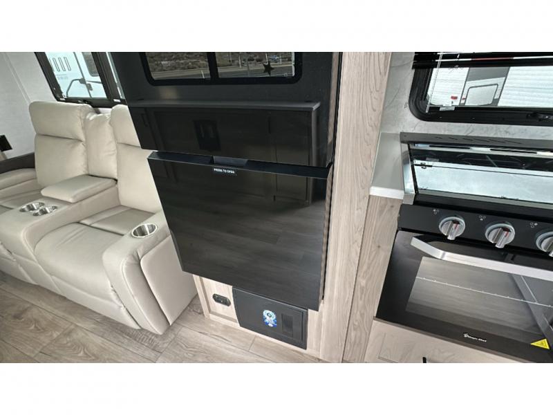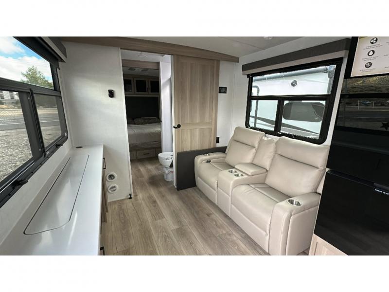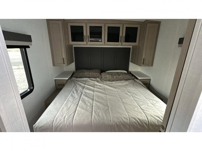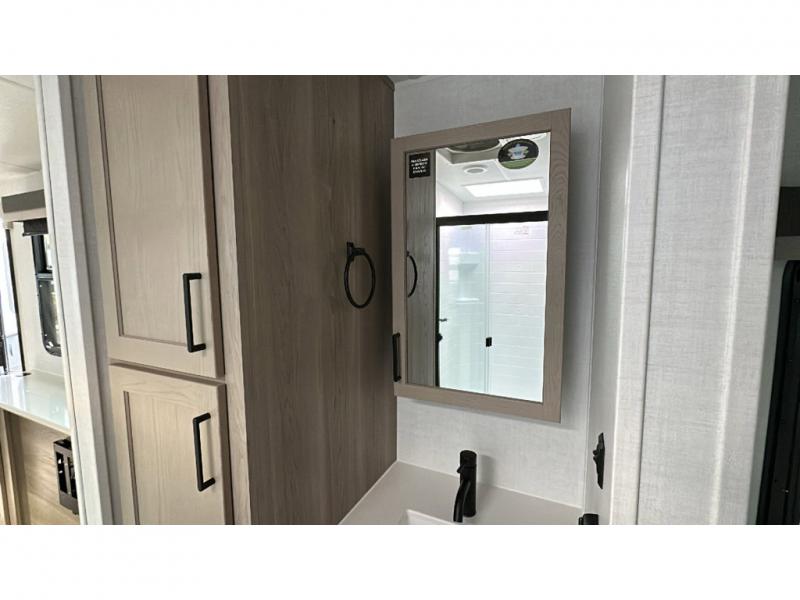 This Rockwood Ultra Lite 301FKT is fit for a cook! As soon as you step inside, you're greeted by the spacious front kitchen. Designed for convenience and style, it has long solid surface countertops that provide ample space for meal prep and organizing utensils. The overhead cabinets offer plenty of room to store dishes and ingredients for all your favorite recipes. After cooking, you can unwind on the 67" theater seat facing a TV with a lift, perfect for movie nights or catching up on your favorite shows. For meals, enjoy dining at the flip-up table with folding chairs, ideal for sharing breakfast, lunch, or dinner with your partner. And when it's time to relax, a full bathroom leads to the rear bedroom, where a king-sized bed awaits to give you a restful night's sleep.