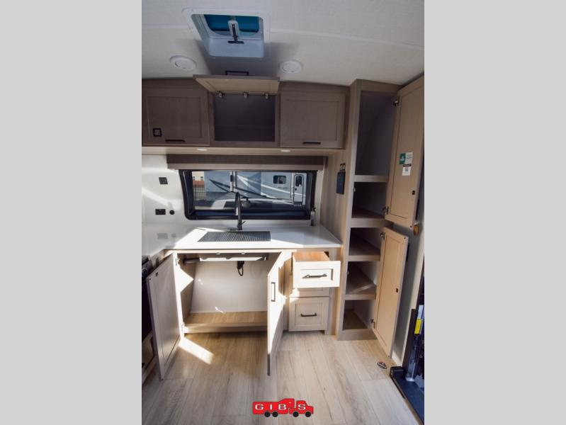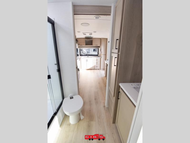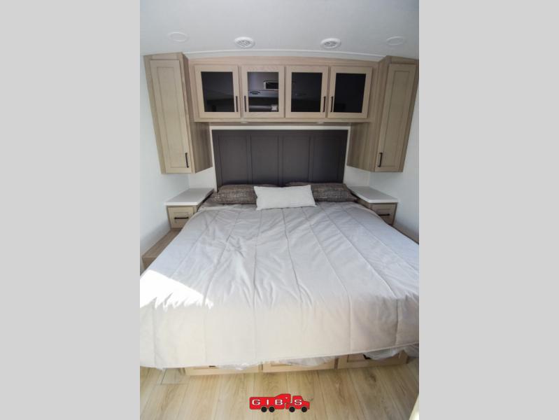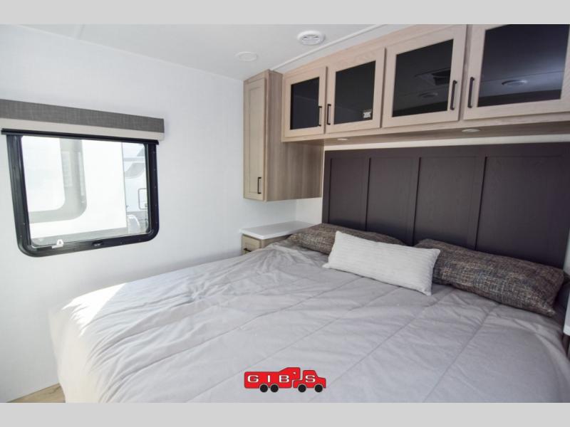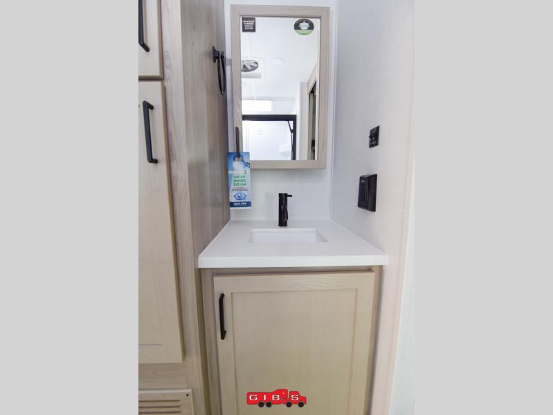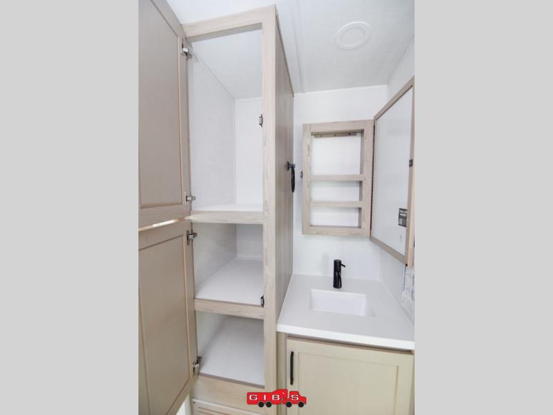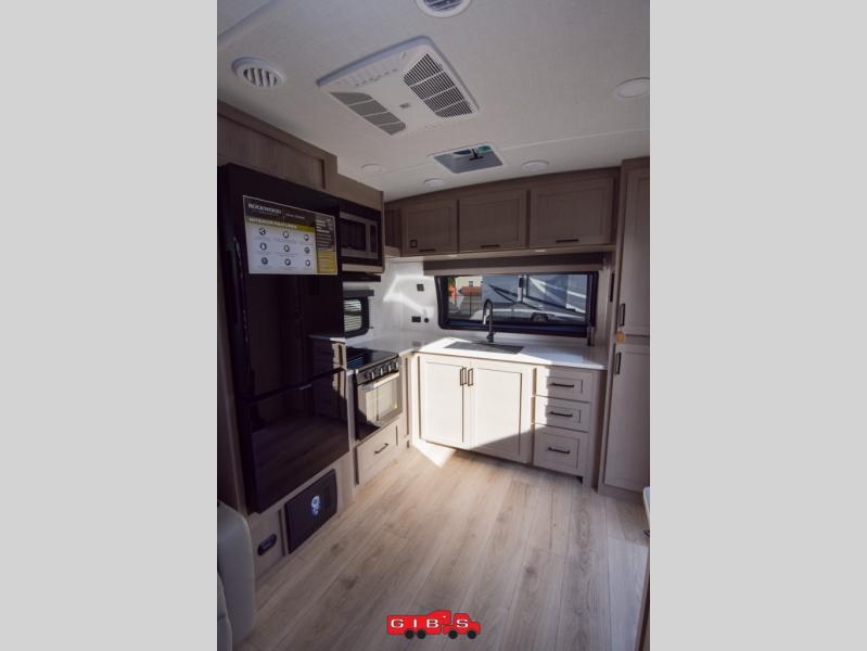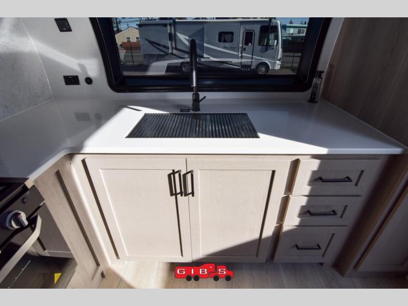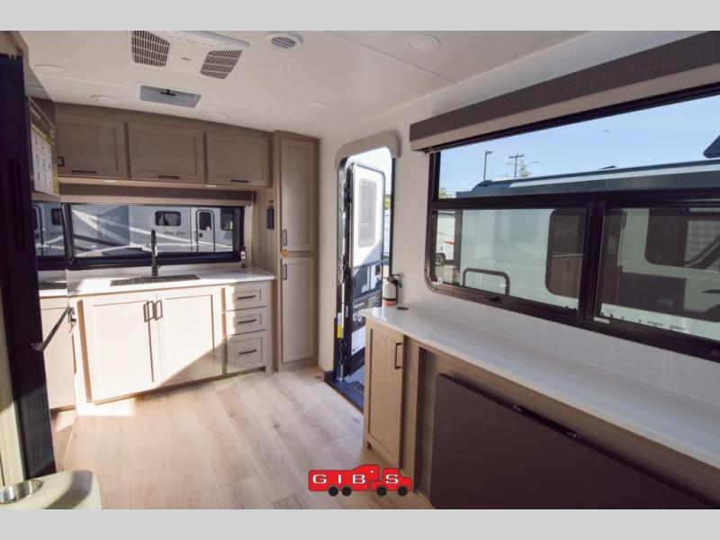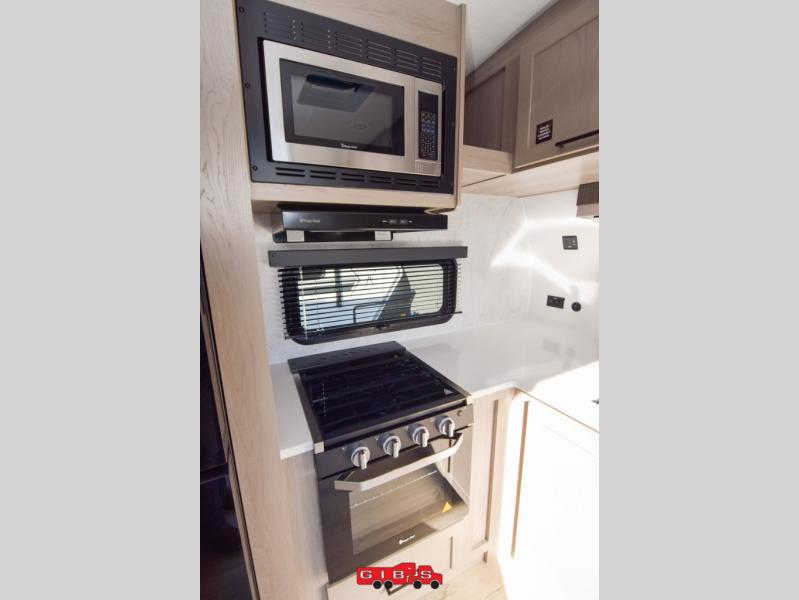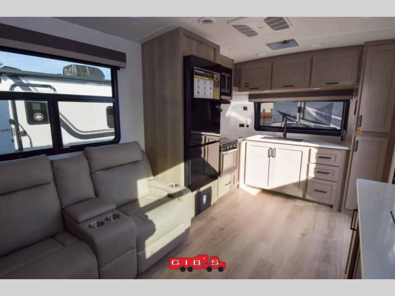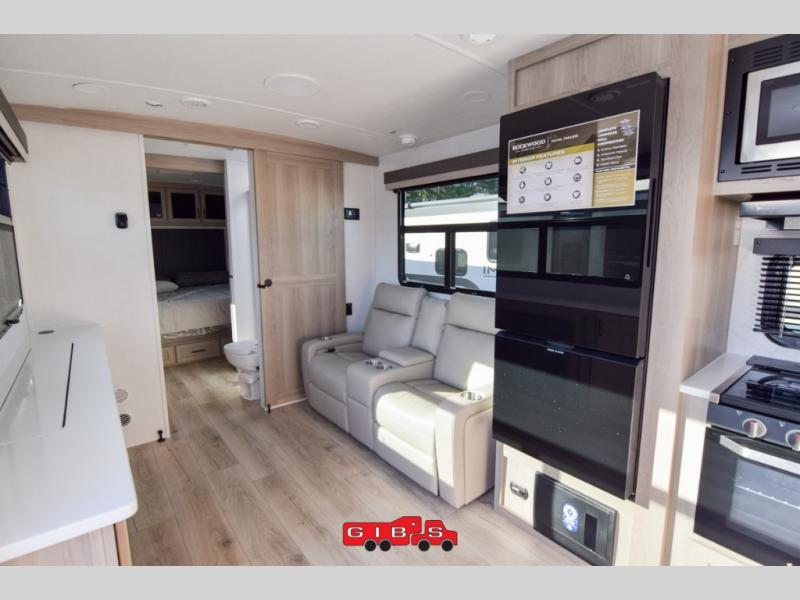 This Rockwood Ultra Lite 301FKT is fit for a cook! As soon as you step inside, you're greeted by the spacious front kitchen. Designed for convenience and style, it has long solid surface countertops that provide ample space for meal prep and organizing utensils. The overhead cabinets offer plenty of room to store dishes and ingredients for all your favorite recipes. After cooking, you can unwind on the 67" theater seat facing a TV with a lift, perfect for movie nights or catching up on your favorite shows. For meals, enjoy dining at the flip-up table with folding chairs, ideal for sharing breakfast, lunch, or dinner with your partner. And when it's time to relax, a full bathroom leads to the rear bedroom, where a king-sized bed awaits to give you a restful night's sleep.