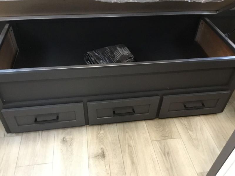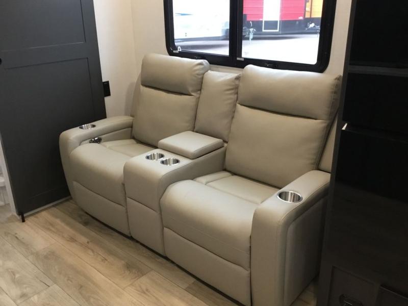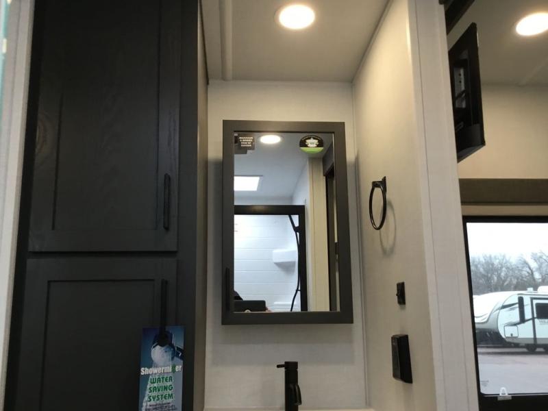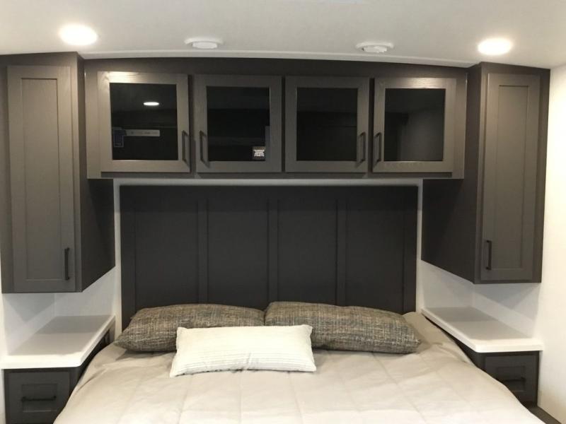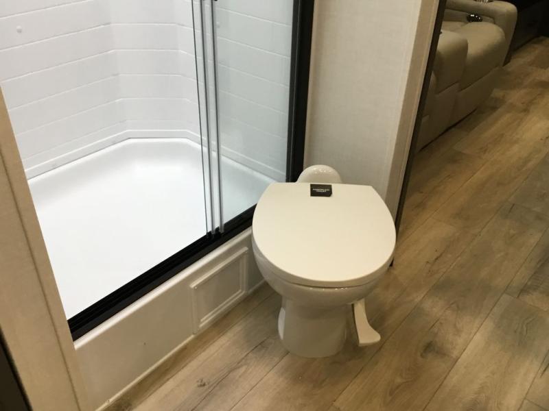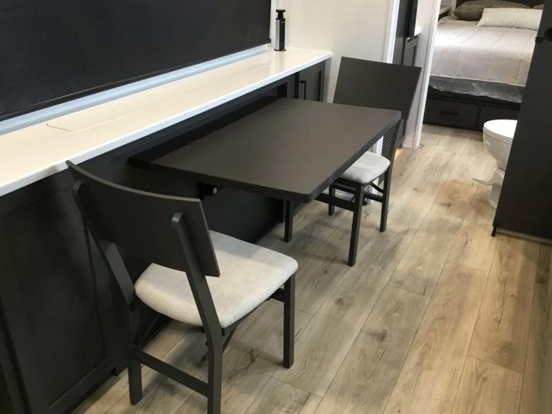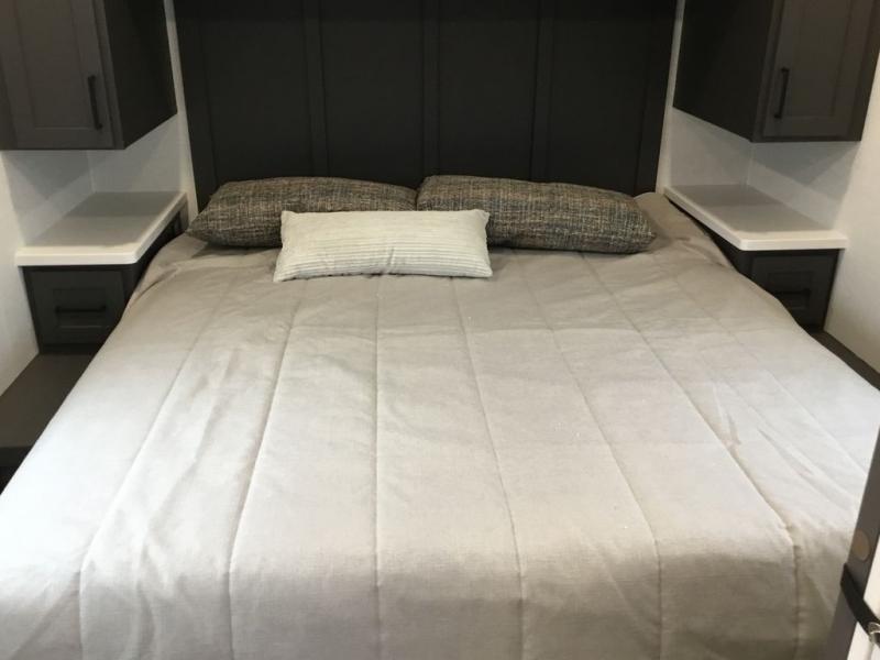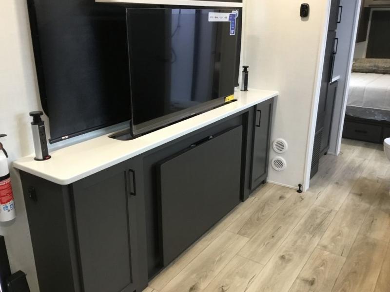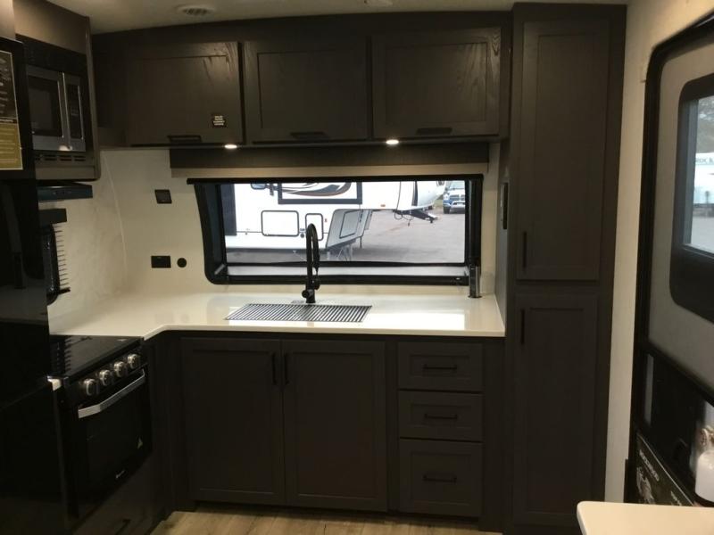 This Rockwood Ultra Lite 301FKT is fit for a cook! As soon as you step inside, you're greeted by the spacious front kitchen. Designed for convenience and style, it has long solid surface countertops that provide ample space for meal prep and organizing utensils. The overhead cabinets offer plenty of room to store dishes and ingredients for all your favorite recipes. After cooking, you can unwind on the 67" theater seat facing a TV with a lift, perfect for movie nights or catching up on your favorite shows. For meals, enjoy dining at the flip-up table with folding chairs, ideal for sharing breakfast, lunch, or dinner with your partner. And when it's time to relax, a full bathroom leads to the rear bedroom, where a king-sized bed awaits to give you a restful night's sleep.