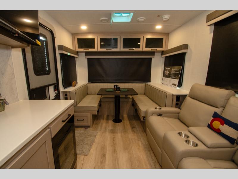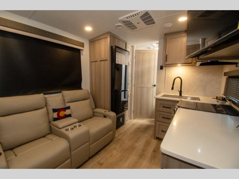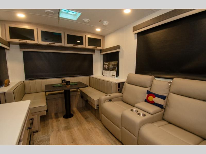 At the rear of the trailer, the U-shaped dinette becomes the central gathering space, offering plenty of room for big family meals, game nights, or spreading out laptops and snacks on a rainy day. Across from the dinette, theater seating is positioned directly in front of the entertainment center and fireplace, creating a comfortable, home-like setup for relaxing in the evenings.