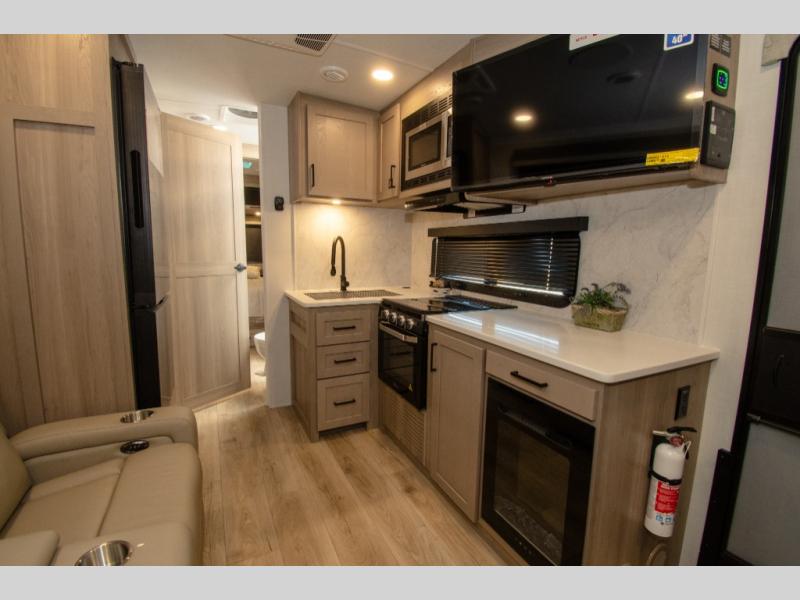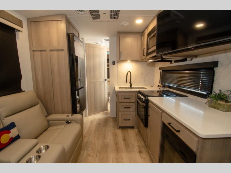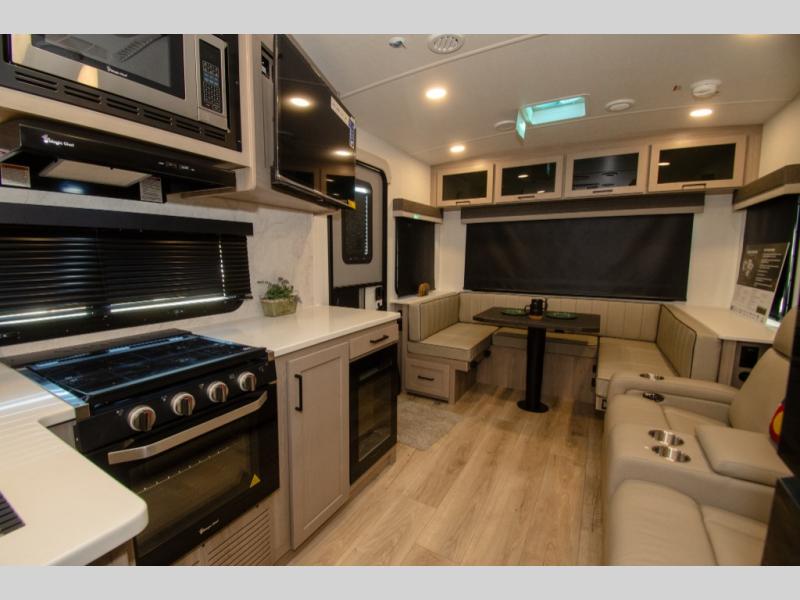 The kitchen is finished with solid surface countertops, along with thoughtful storage and prep space that make everyday cooking easy whether you’re staying a night or a week. Large windows throughout the living area keep the space bright and open, reinforcing the wide body feel of the floorplan.