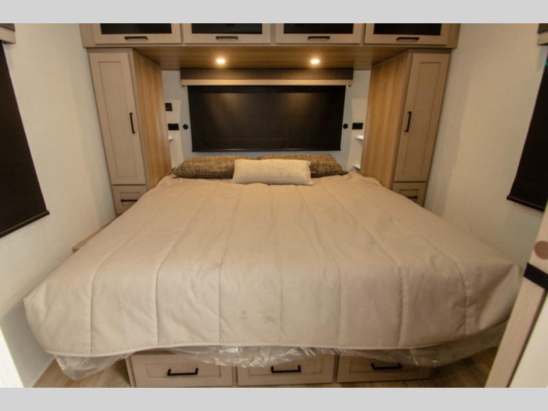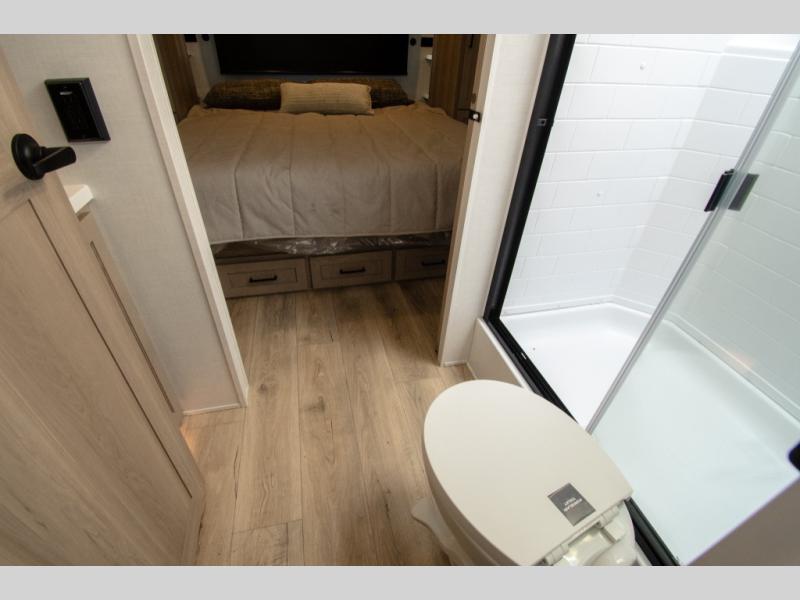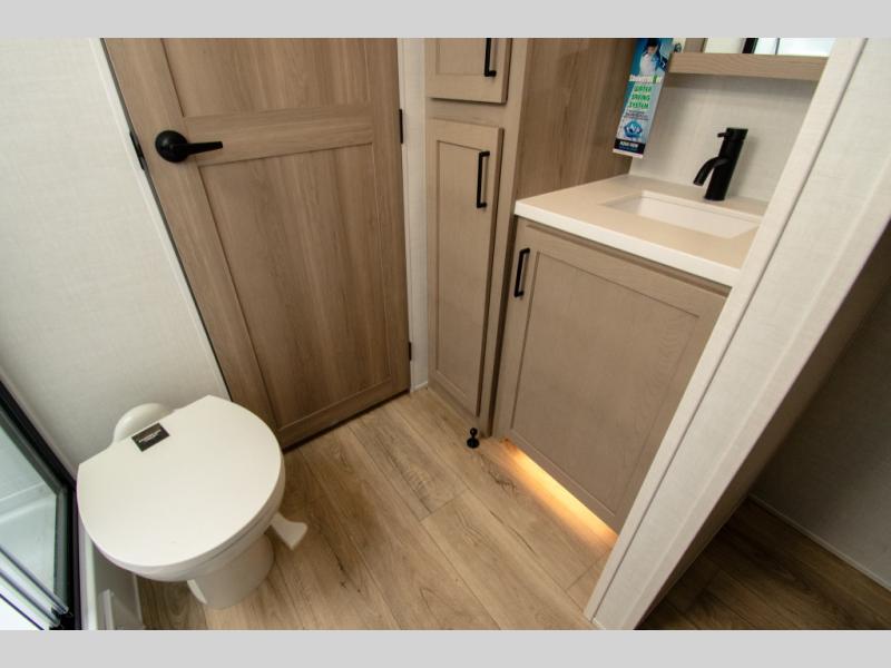 Up front, the private bedroom features a 72" x 80" king bed, giving you true residential sleeping comfort without compromise. Dual wardrobes on each side of the bed provide proper hanging space for both campers, eliminating the usual storage squeeze found in smaller trailers. This bedroom layout feels intentional and comfortable, not like an afterthought.
