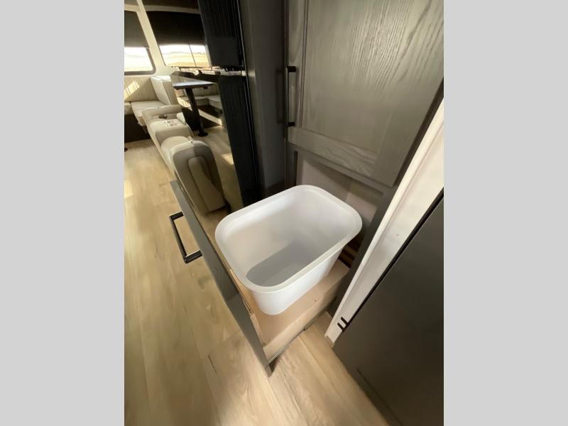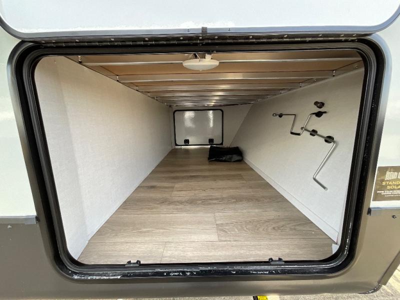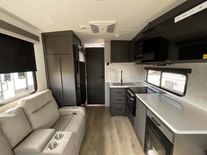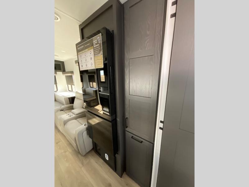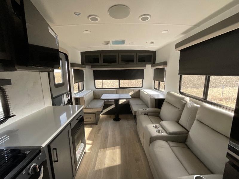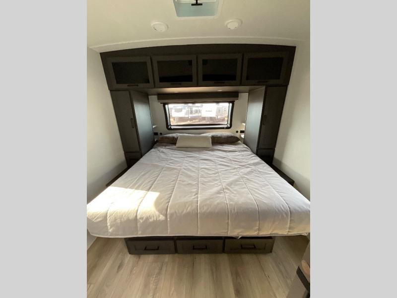 This is built for people who actually want to hang out in their camper, not just sleep in it. The rear U-shaped dinette becomes the heart of the trailer, giving you a legit spot for big family meals, card games, or spreading out laptops and snacks on a rainy day. Right across, the theater seating lines you up perfectly with the entertainment center and fireplace, so you get that cozy “evening at home” vibe instead of just staring at a tiny TV from a weird angle. When it is finally time to crash, the front bedroom steps it up with a king bed so you are not sacrificing real sleep to go camping. On either side you will find two wardrobes, giving both people proper hanging space instead of fighting over one tiny closet. Altogether, this floorplan feels like a comfy little apartment on wheels, with real lounge space, real dining space, and a real bedroom that does not feel like an afterthought.