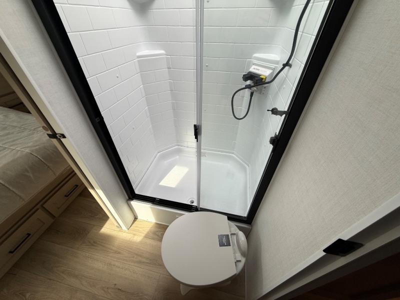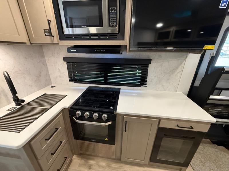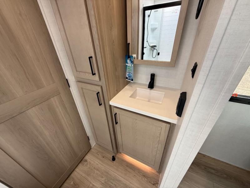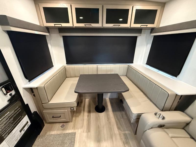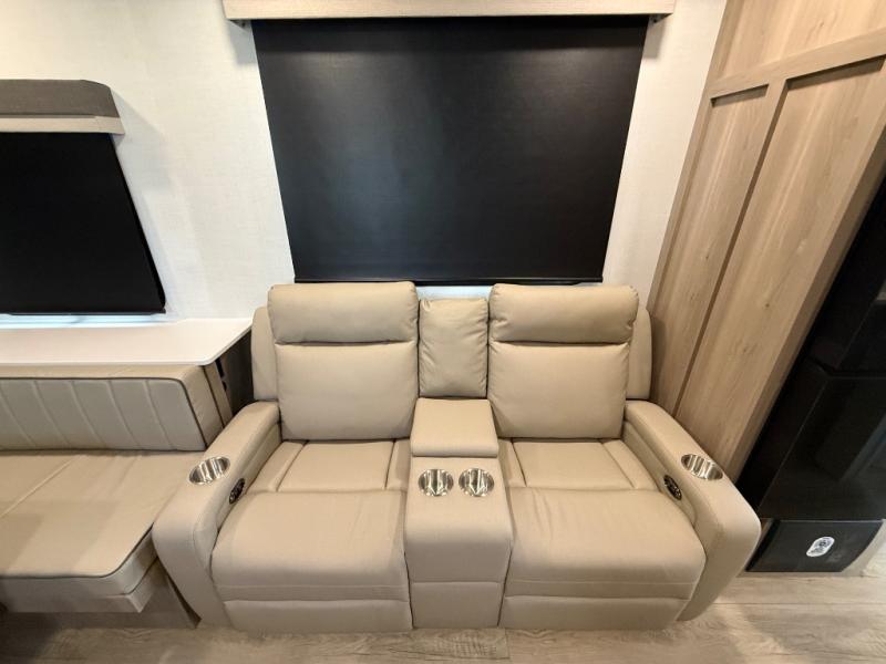 This is built for people who actually want to hang out in their camper, not just sleep in it. The rear U-shaped dinette becomes the heart of the trailer, giving you a legit spot for big family meals, card games, or spreading out laptops and snacks on a rainy day. Right across, the theater seating lines you up perfectly with the entertainment center and fireplace, so you get that cozy “evening at home” vibe instead of just staring at a tiny TV from a weird angle. When it is finally time to crash, the front bedroom steps it up with a king bed so you are not sacrificing real sleep to go camping. On either side you will find two wardrobes, giving both people proper hanging space instead of fighting over one tiny closet. Altogether, this floorplan feels like a comfy little apartment on wheels, with real lounge space, real dining space, and a real bedroom that does not feel like an afterthought.