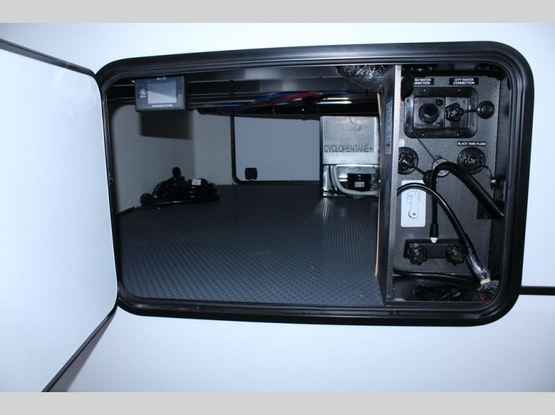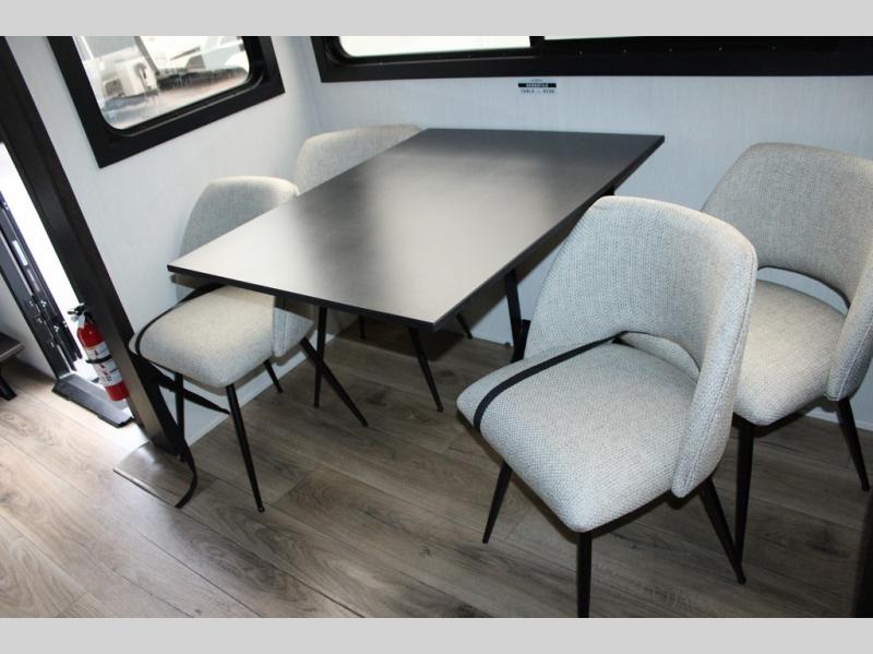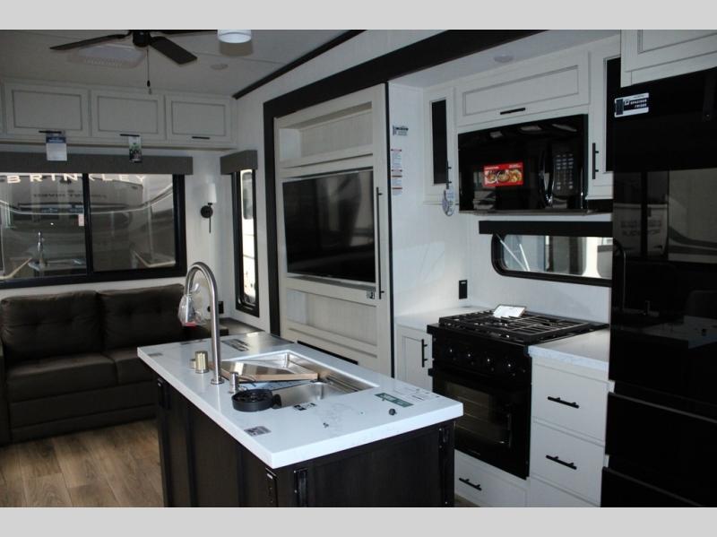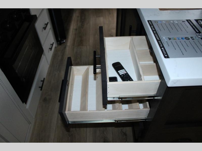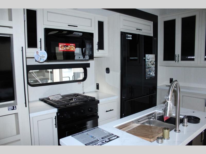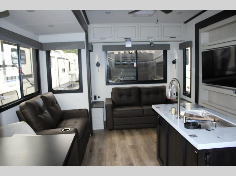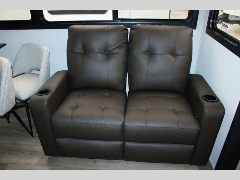 You will feel right at home in this fifth wheel! The rear living area includes a tri-fold sofa, a TV with a fireplace below, and theater seating for two making this space a second bedroom at night for guests. In the morning, you can prepare breakfast on the kitchen island and cooktop, then dine together at the versatile dinette/desk. There is plenty of storage space here, including a hidden pantry, a hutch, and overhead cabinets. The full bath will allow you to stay clean throughout your trip, and you'll feel right at home in the front private bedroom with a king bed. This model also includes an outside refrigerator for snacks, plus pass-thru storage for all your gear!