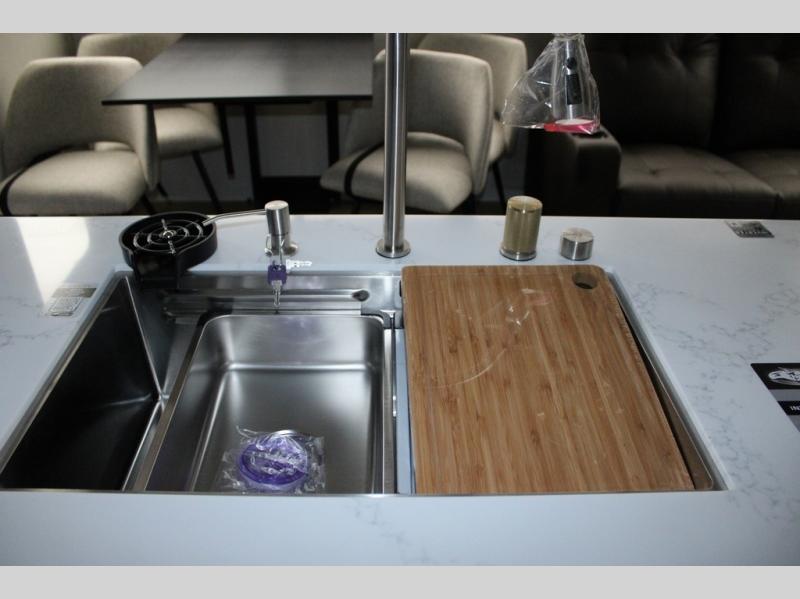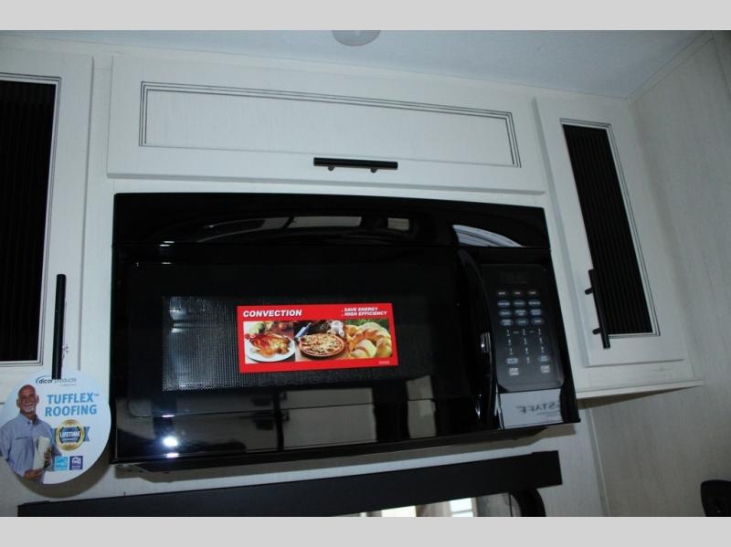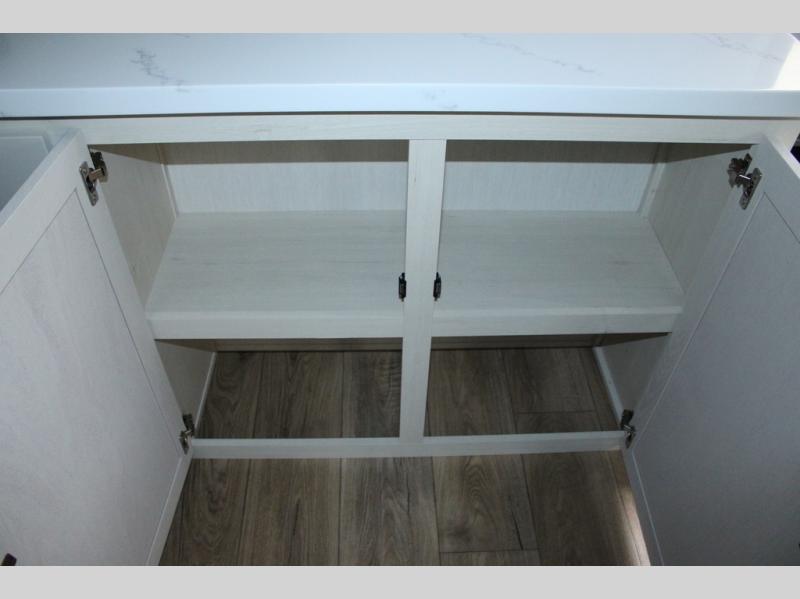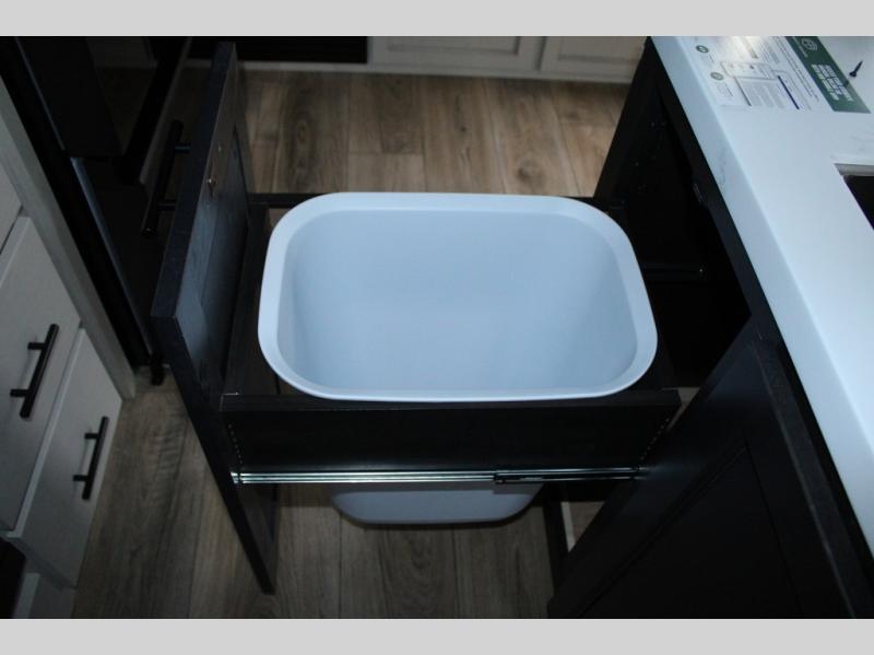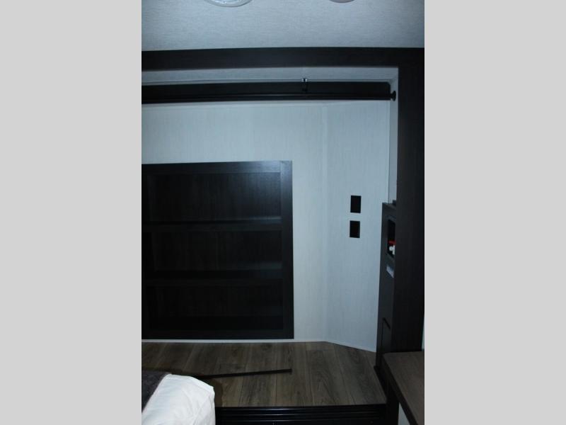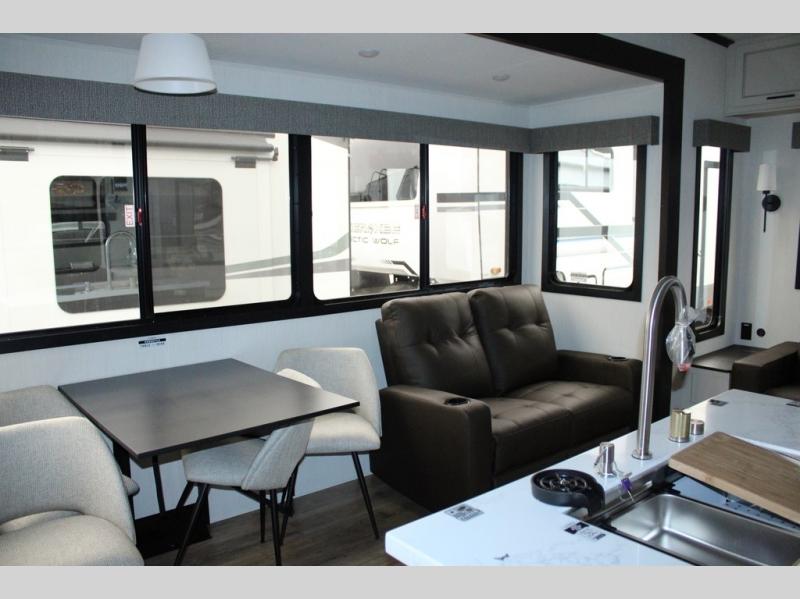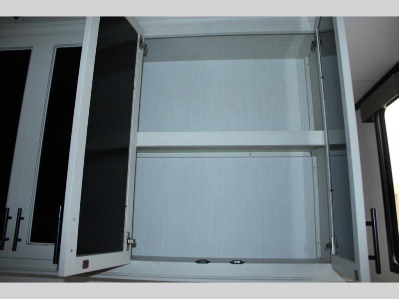 You will feel right at home in this fifth wheel! The rear living area includes a tri-fold sofa, a TV with a fireplace below, and theater seating for two making this space a second bedroom at night for guests. In the morning, you can prepare breakfast on the kitchen island and cooktop, then dine together at the versatile dinette/desk. There is plenty of storage space here, including a hidden pantry, a hutch, and overhead cabinets. The full bath will allow you to stay clean throughout your trip, and you'll feel right at home in the front private bedroom with a king bed. This model also includes an outside refrigerator for snacks, plus pass-thru storage for all your gear!