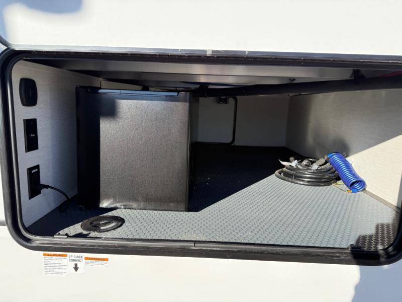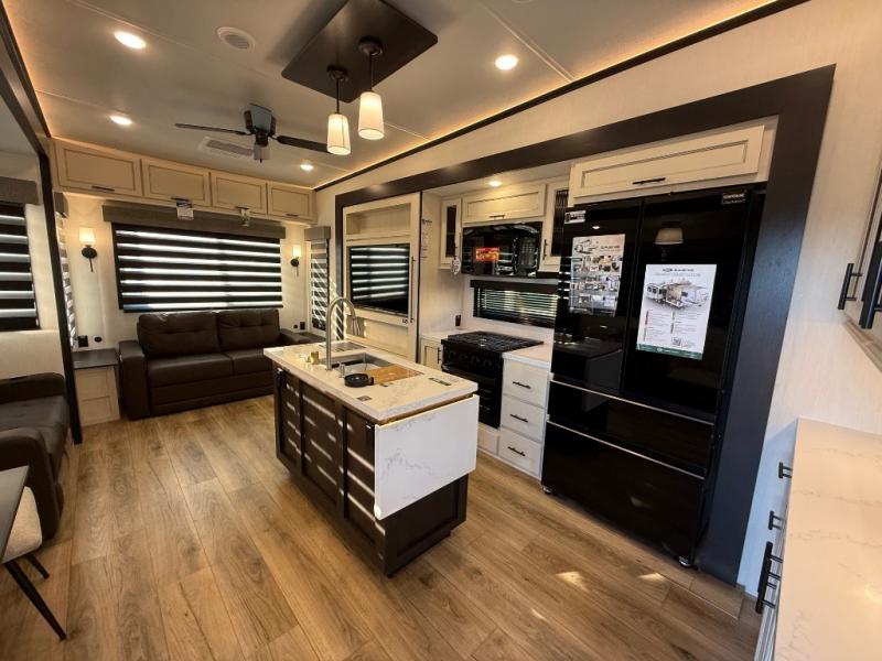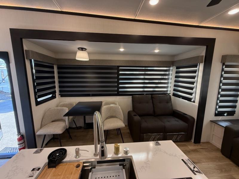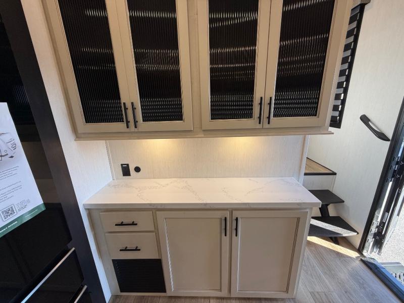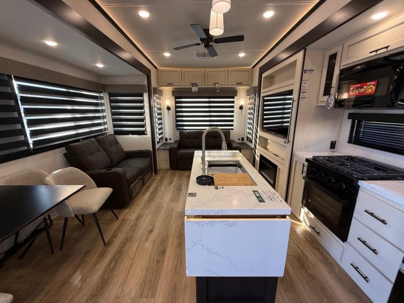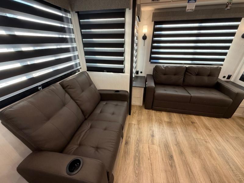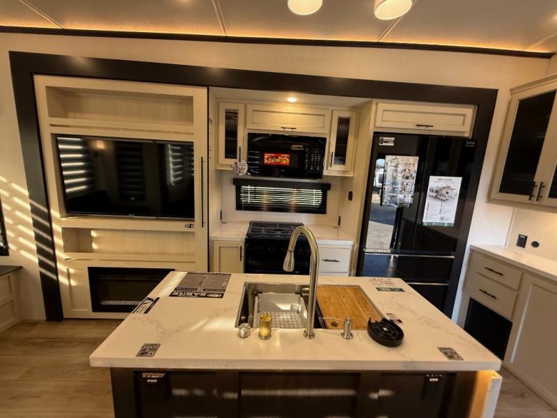 You will feel right at home in this fifth wheel! The rear living area includes a tri-fold sofa, a TV with a fireplace below, and theater seating for two making this space a second bedroom at night for guests. In the morning, you can prepare breakfast on the kitchen island and cooktop, then dine together at the versatile dinette/desk. There is plenty of storage space here, including a hidden pantry, a hutch, and overhead cabinets. The full bath will allow you to stay clean throughout your trip, and you'll feel right at home in the front private bedroom with a king bed. This model also includes an outside refrigerator for snacks, plus pass-thru storage for all your gear!