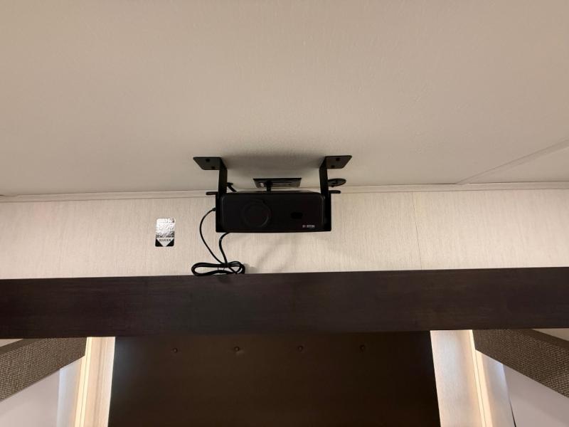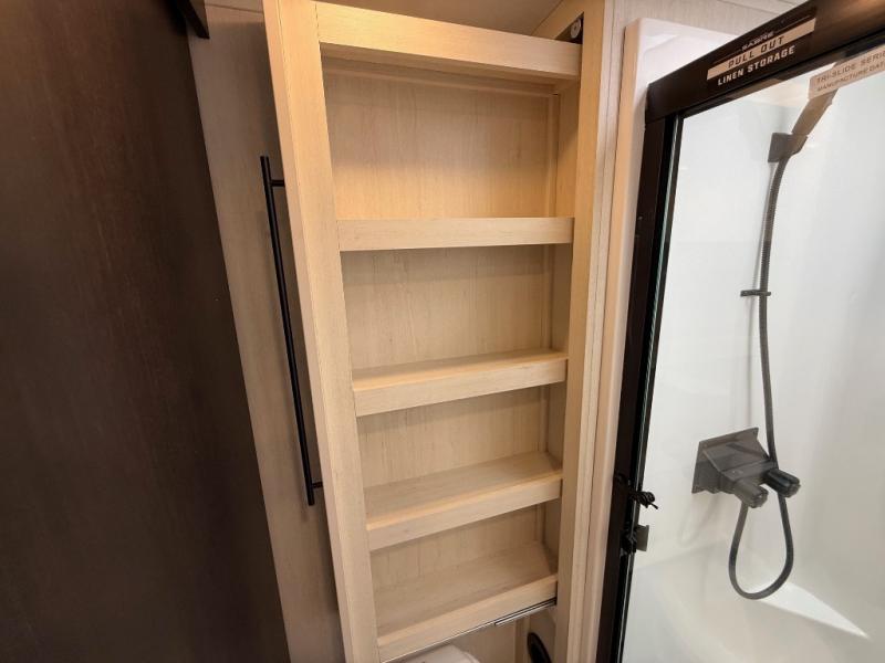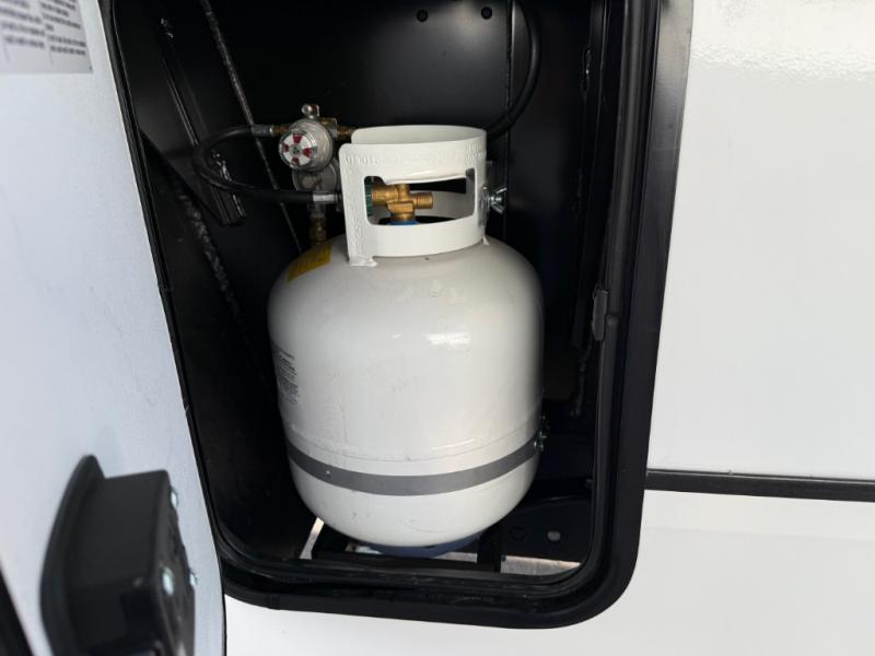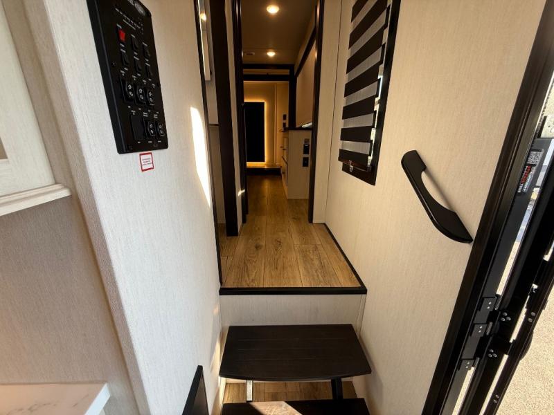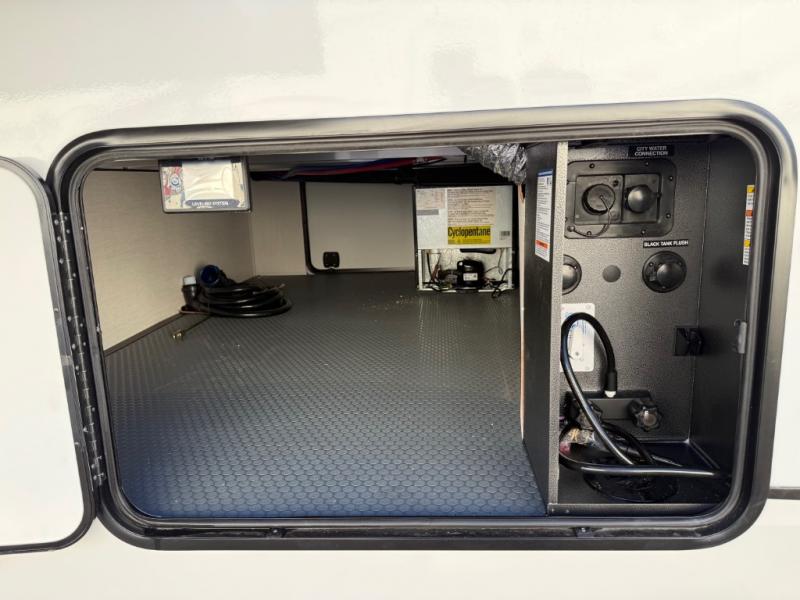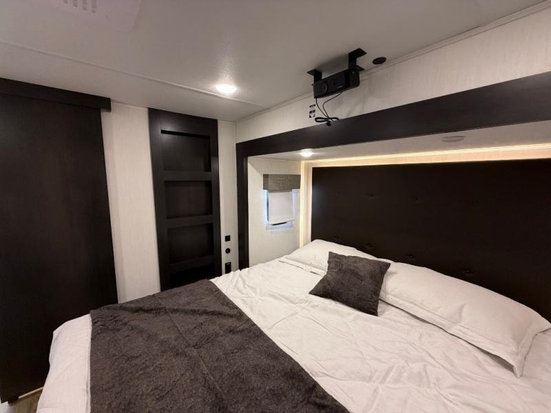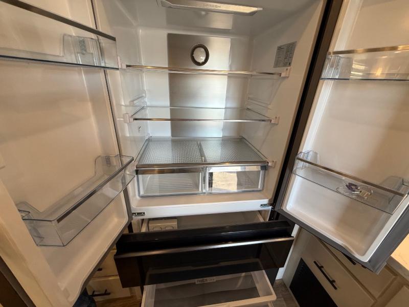 You will feel right at home in this fifth wheel! The rear living area includes a tri-fold sofa, a TV with a fireplace below, and theater seating for two making this space a second bedroom at night for guests. In the morning, you can prepare breakfast on the kitchen island and cooktop, then dine together at the versatile dinette/desk. There is plenty of storage space here, including a hidden pantry, a hutch, and overhead cabinets. The full bath will allow you to stay clean throughout your trip, and you'll feel right at home in the front private bedroom with a king bed. This model also includes an outside refrigerator for snacks, plus pass-thru storage for all your gear!