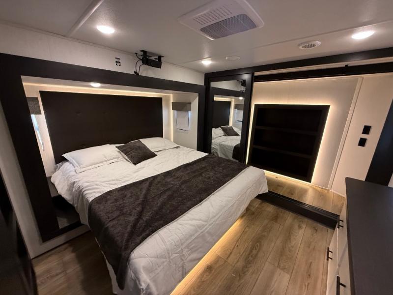 You will experience luxurious camping trips at an affordable price with any one of these Forest River Sabre fifth wheels! These models are durable and ready to travel anytime of the year thanks to features like the high-gloss gel-coat front cap with LED lighting, the PVC roof membrane, and the forced air underbelly with enclosed gate valves. The electric auto-leveling system makes setting up easy and safe, and the adjustable power awning with LED lighting will create an inviting outdoor living space. Each model includes a universal docking station which includes a black tank flush and an outside shower, and adjustable stable steps for you to enter and exit the unit safely. Inside, you will love the design of the ambient accent lighting in the living area, the real wood lumbercore cabinetry, and the linoleum flooring!