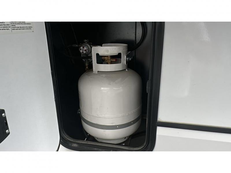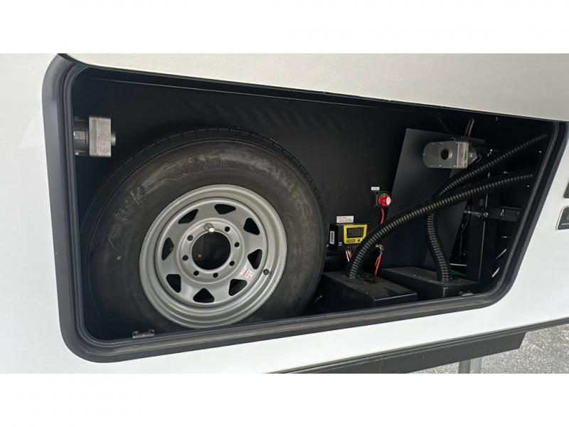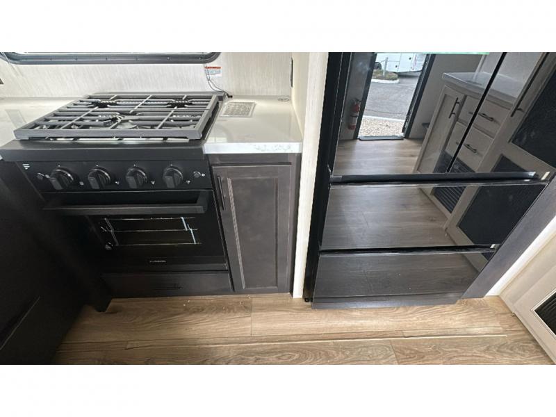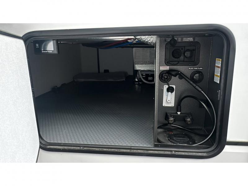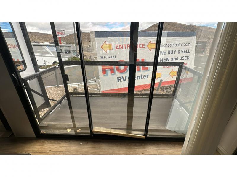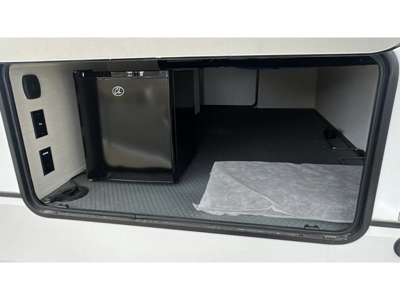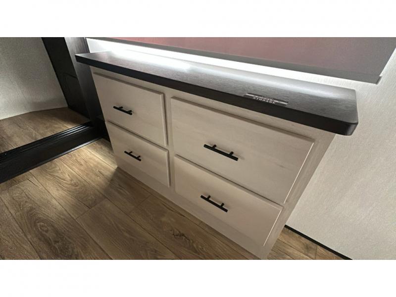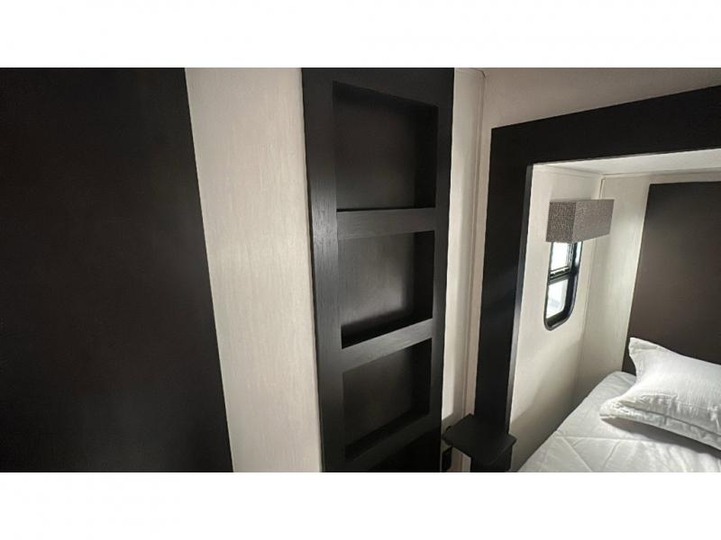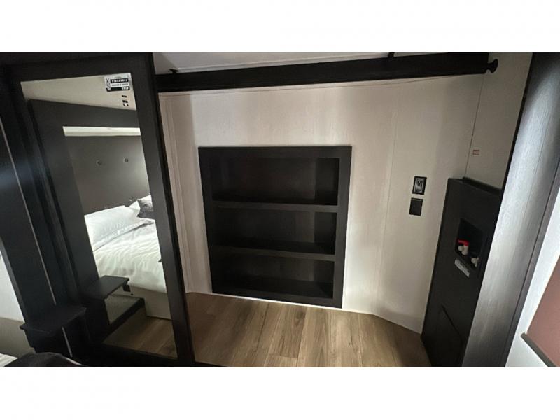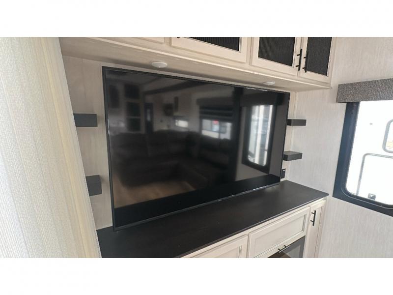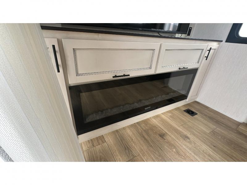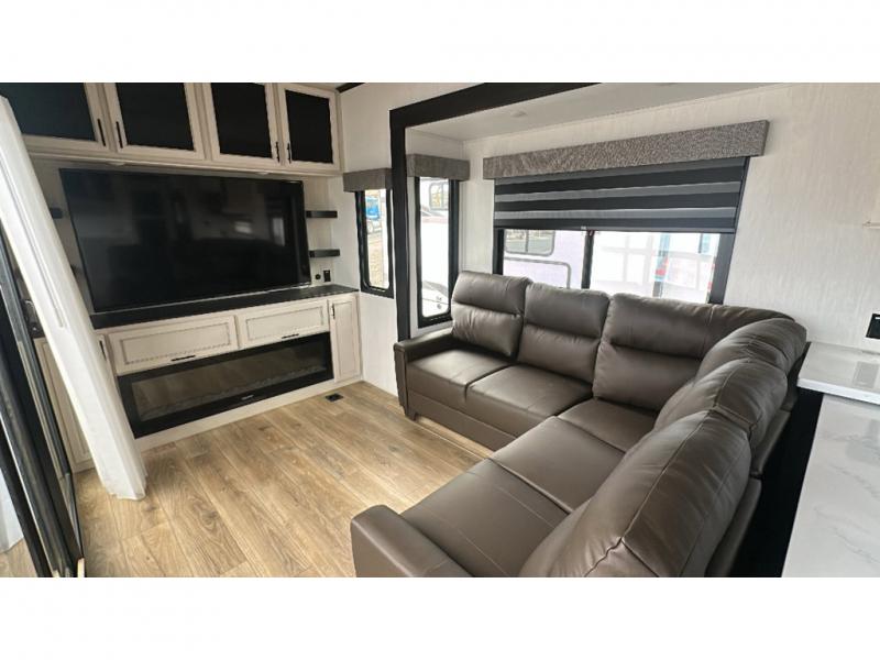 This fifth wheel is sure to have you feeling right at home, wherever you choose to roam! The rear living room is inviting with its sectional sofa with an ottoman, an entertainment center, and a fireplace, plus this room includes sliding patio doors that lead to the patio deck! The chef of your group can prepare home cooked meals in the middle kitchen that includes generous counter space, along with a hutch, pantry, and residential refrigerator. A full bath includes a spacious shower with a seat for added comfort, and the camper king bed slide in the front bedroom is sure to provide a great night's rest. There is also a dresser and a front wardrobe with washer and dryer prep if you want to add those appliances.
