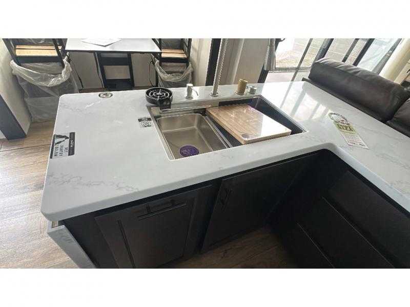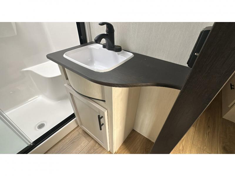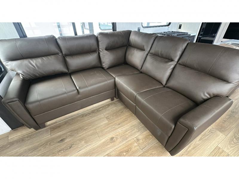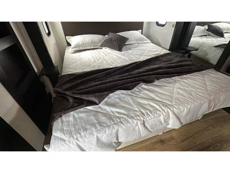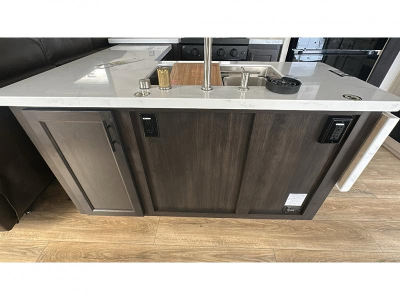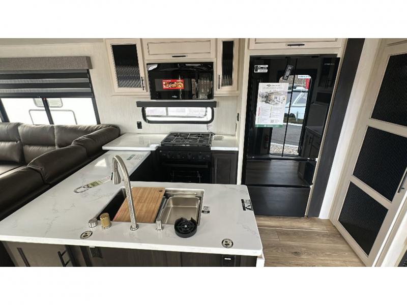 You will experience luxurious camping trips at an affordable price with any one of these Forest River Sabre fifth wheels! These models are durable and ready to travel anytime of the year thanks to features like the high-gloss gel-coat front cap with LED lighting, the PVC roof membrane, and the forced air underbelly with enclosed gate valves. The electric auto-leveling system makes setting up easy and safe, and the adjustable power awning with LED lighting will create an inviting outdoor living space. Each model includes a universal docking station which includes a black tank flush and an outside shower, and detachable and adjustable stable steps for you to enter and exit the unit safely. Inside, you will love the design of the ambient accent lighting in the living area, the real wood lumbercore cabinetry, and the linoleum flooring!