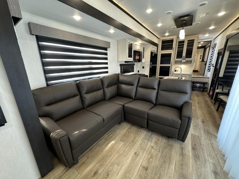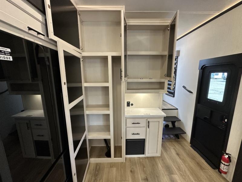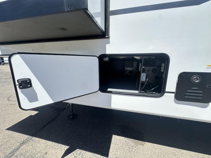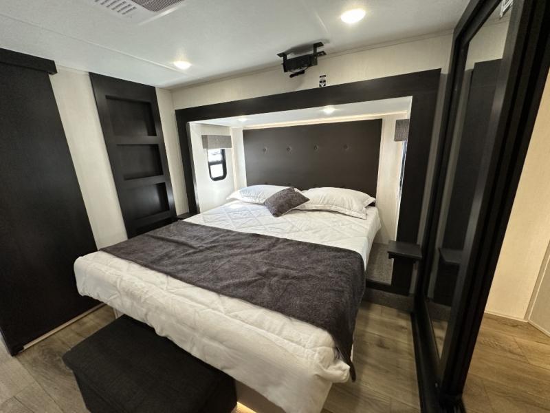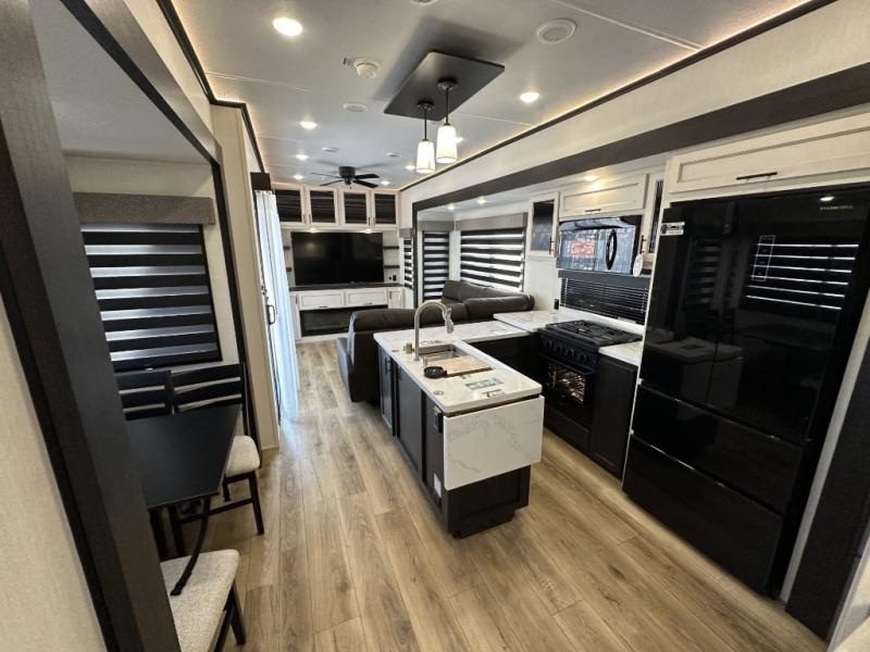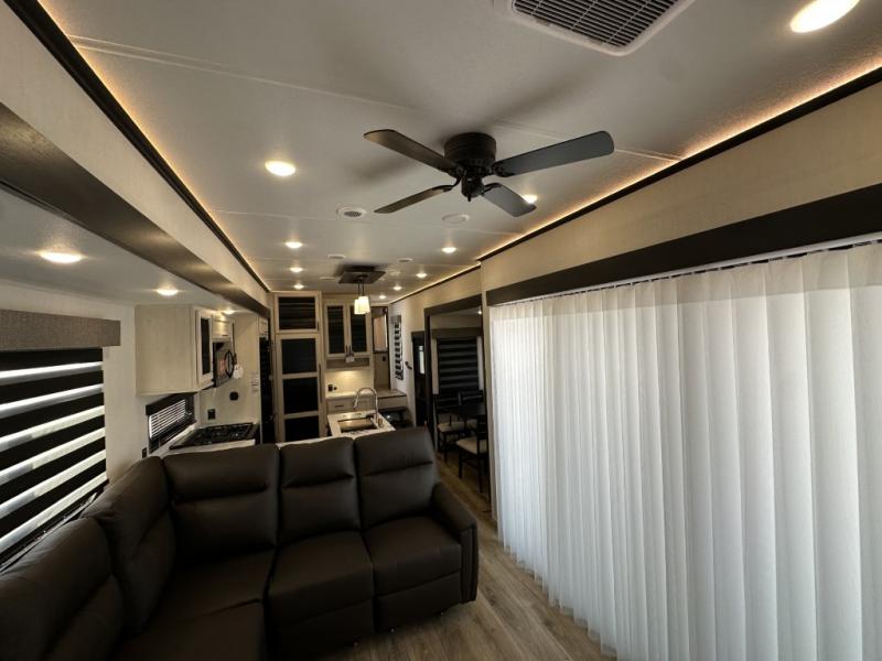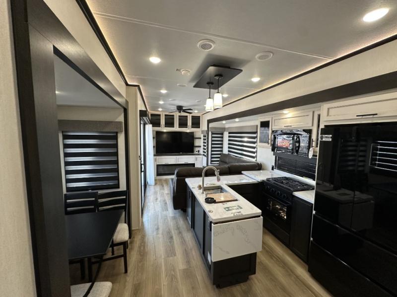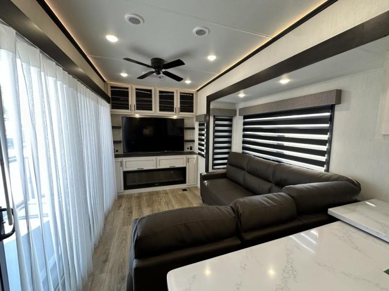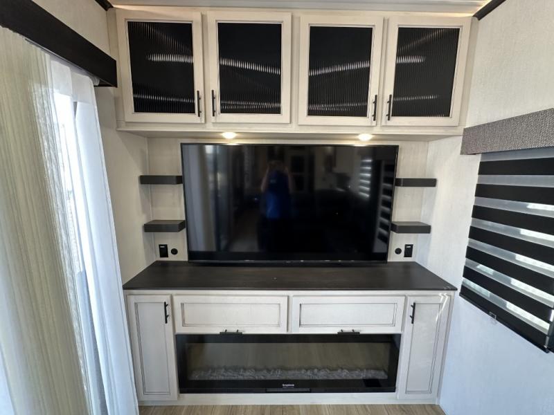 This fifth wheel is sure to have you feeling right at home, wherever you choose to roam! The rear living room is inviting with its sectional sofa, an entertainment center, and a fireplace, plus this room includes sliding patio doors that lead to the patio deck! The chef of your group can prepare home cooked meals in the middle kitchen that includes generous counter space, along with a hutch, pantry, and residential size refrigerator. A full bath includes a spacious shower with a seat for added comfort, and the camper king bed slide in the front bedroom is sure to provide a great night's rest. There is also a dresser and a front wardrobe with washer and dryer prep if you want to add those appliances.