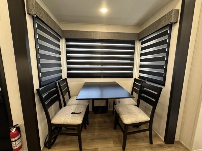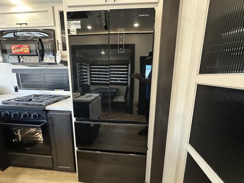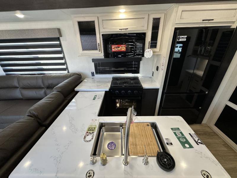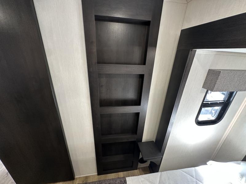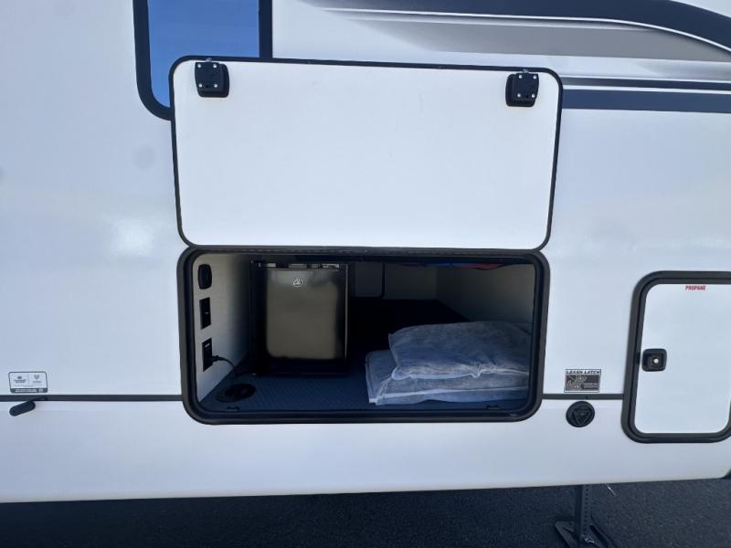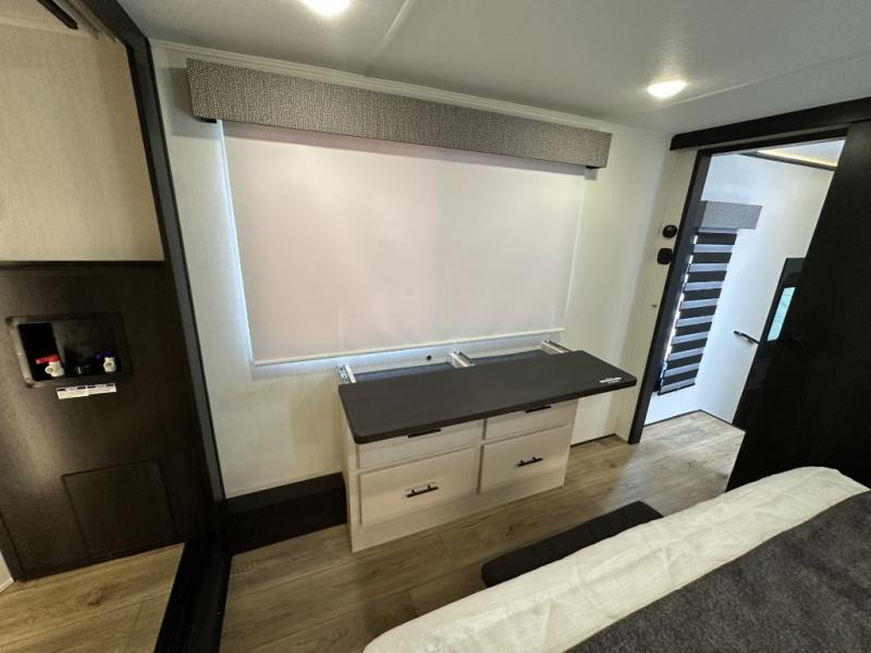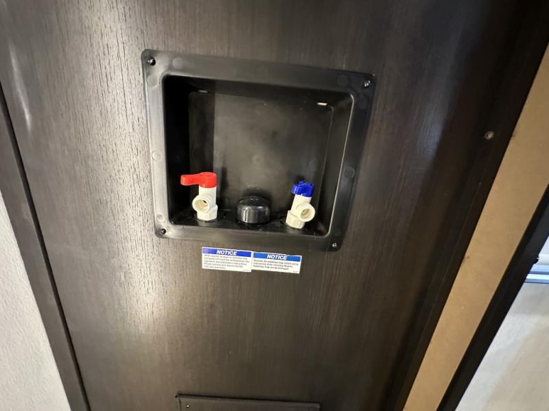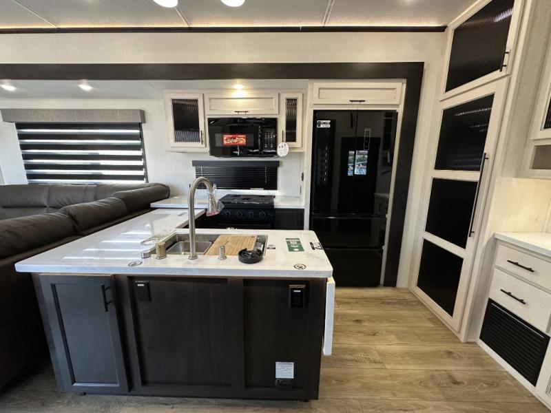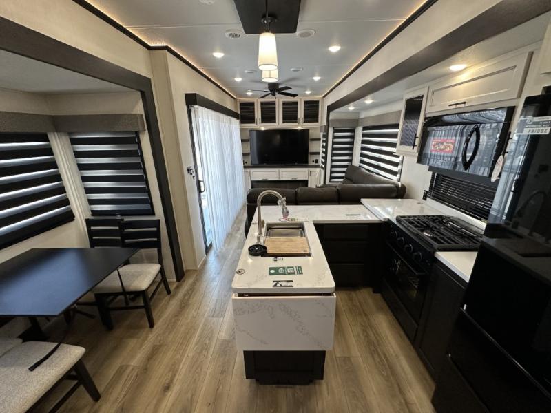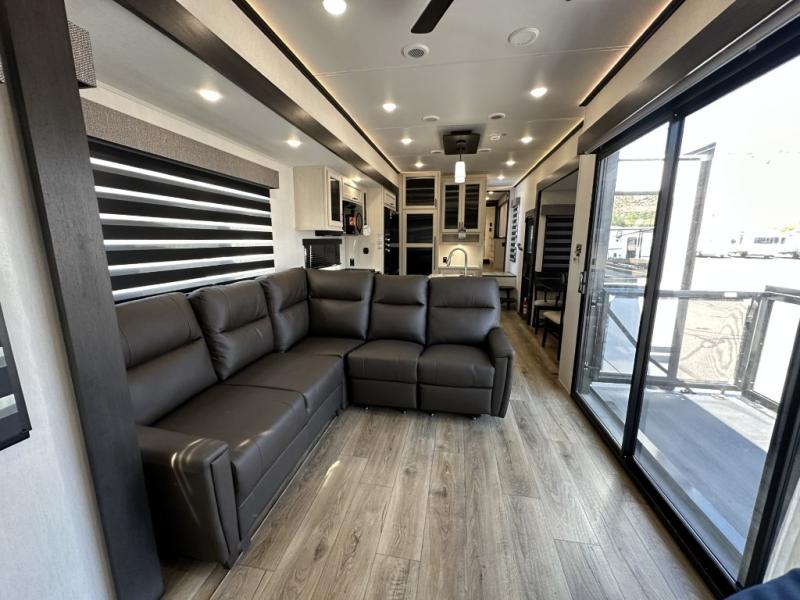 This fifth wheel is sure to have you feeling right at home, wherever you choose to roam! The rear living room is inviting with its sectional sofa, an entertainment center, and a fireplace, plus this room includes sliding patio doors that lead to the patio deck! The chef of your group can prepare home cooked meals in the middle kitchen that includes generous counter space, along with a hutch, pantry, and residential size refrigerator. A full bath includes a spacious shower with a seat for added comfort, and the camper king bed slide in the front bedroom is sure to provide a great night's rest. There is also a dresser and a front wardrobe with washer and dryer prep if you want to add those appliances.