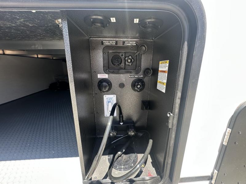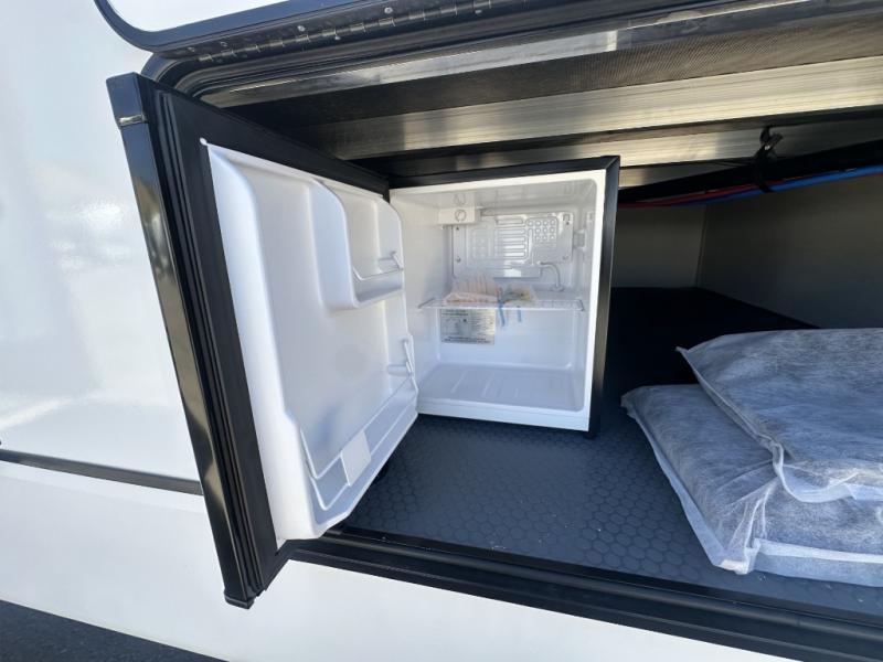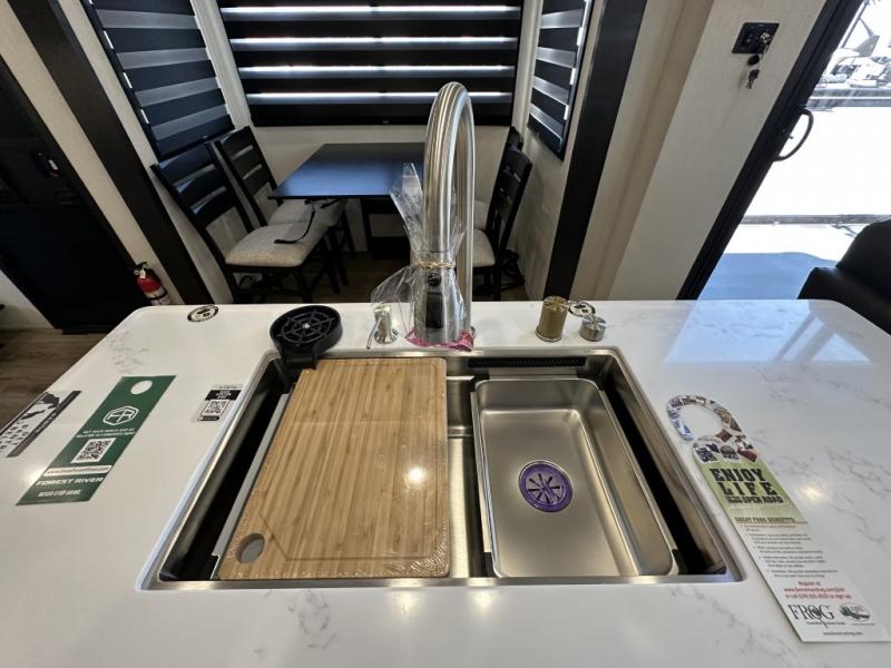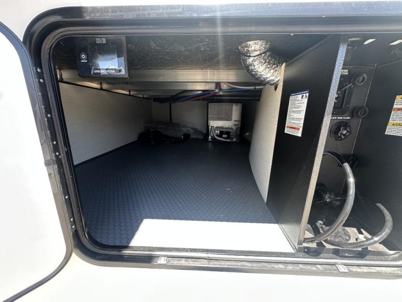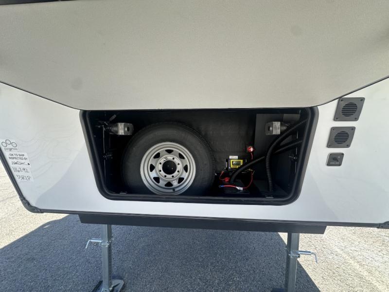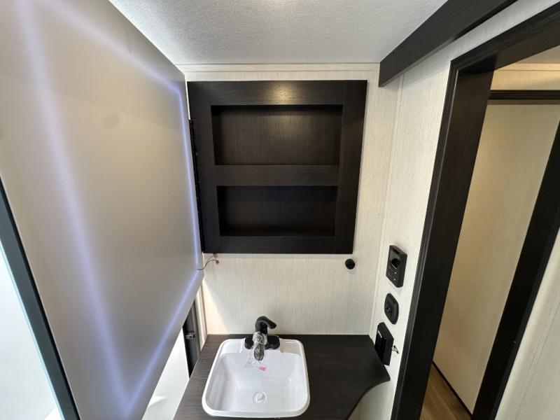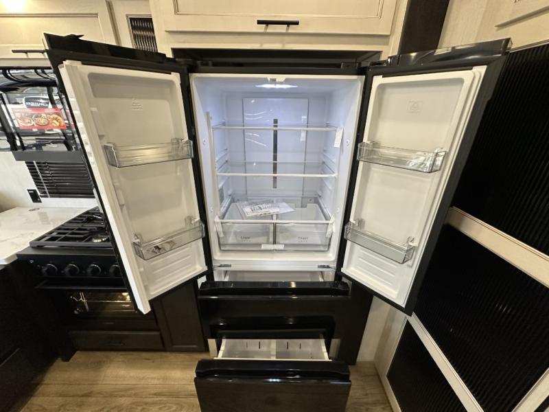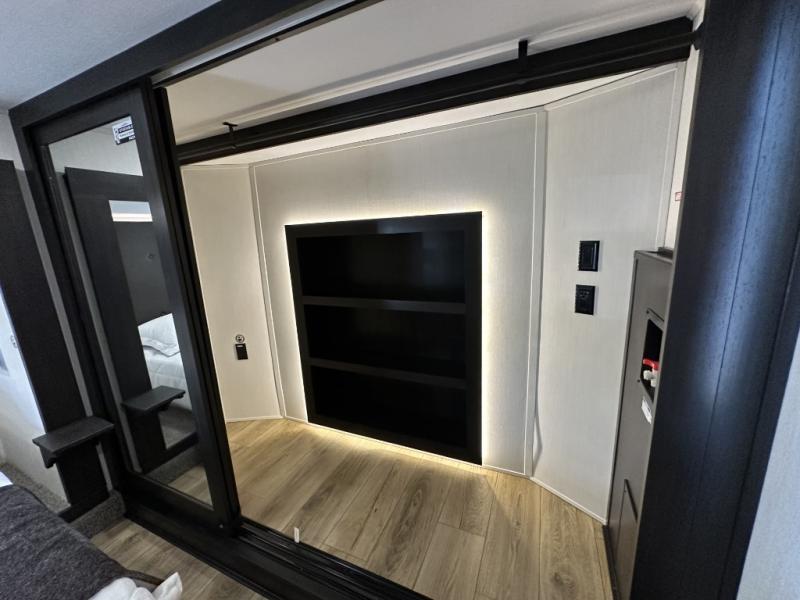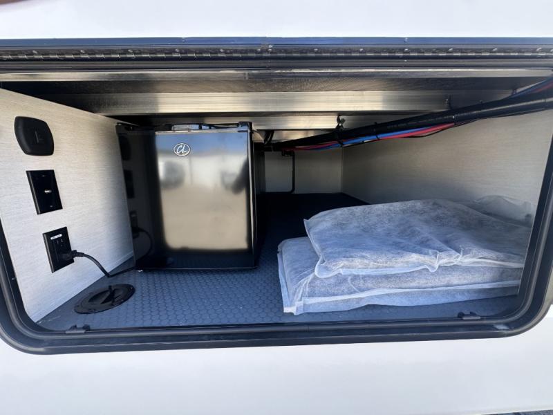 This fifth wheel is sure to have you feeling right at home, wherever you choose to roam! The rear living room is inviting with its sectional sofa, an entertainment center, and a fireplace, plus this room includes sliding patio doors that lead to the patio deck! The chef of your group can prepare home cooked meals in the middle kitchen that includes generous counter space, along with a hutch, pantry, and residential size refrigerator. A full bath includes a spacious shower with a seat for added comfort, and the camper king bed slide in the front bedroom is sure to provide a great night's rest. There is also a dresser and a front wardrobe with washer and dryer prep if you want to add those appliances.
