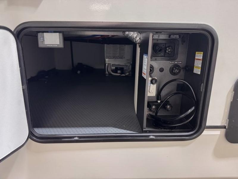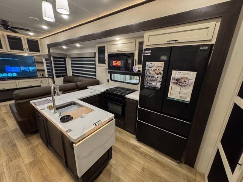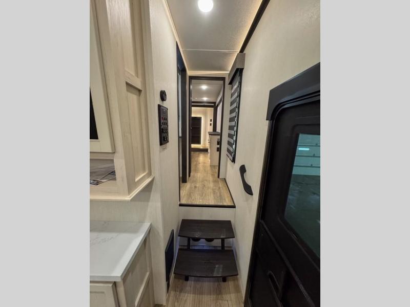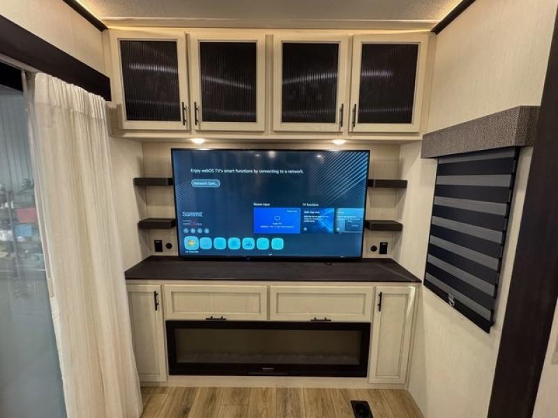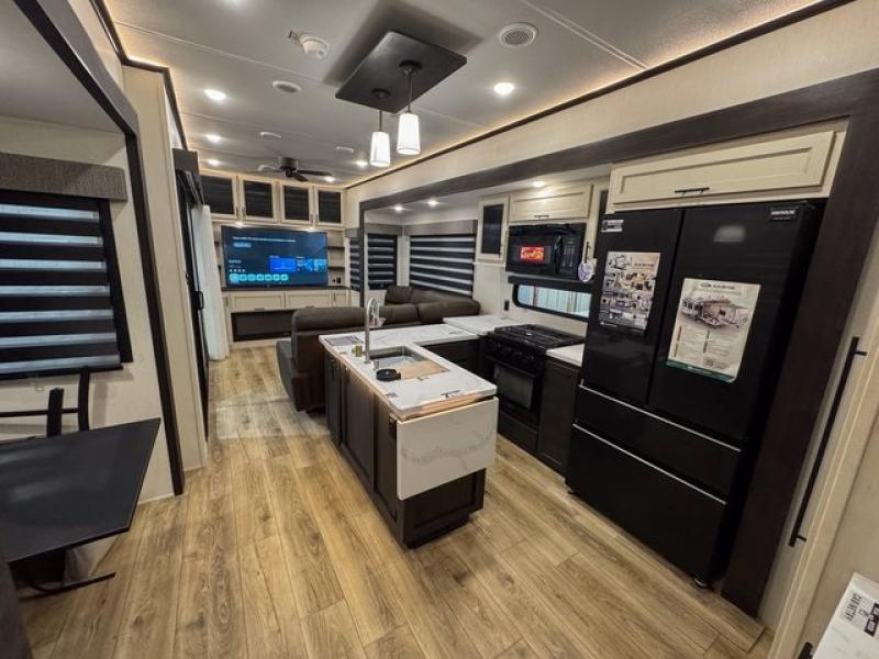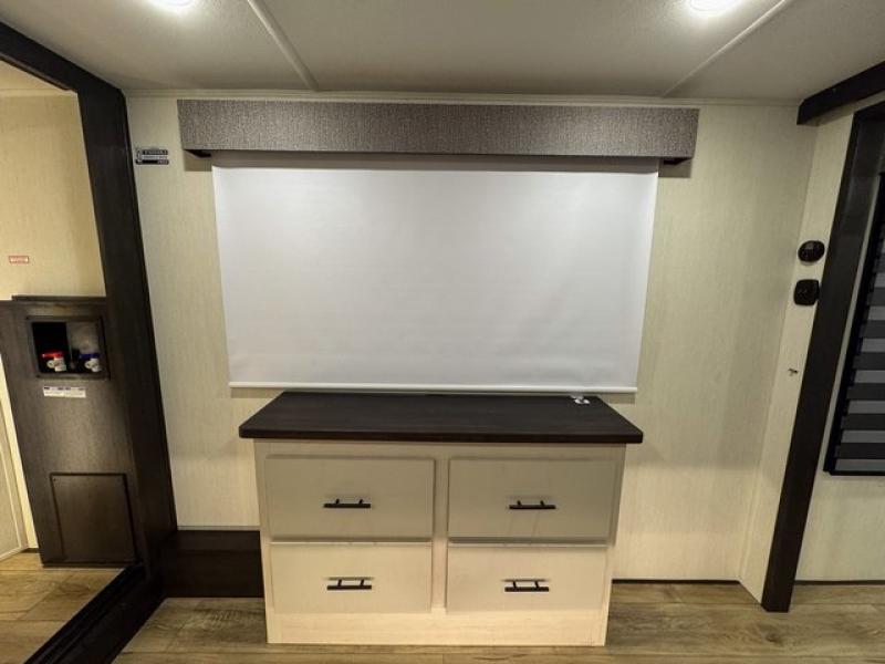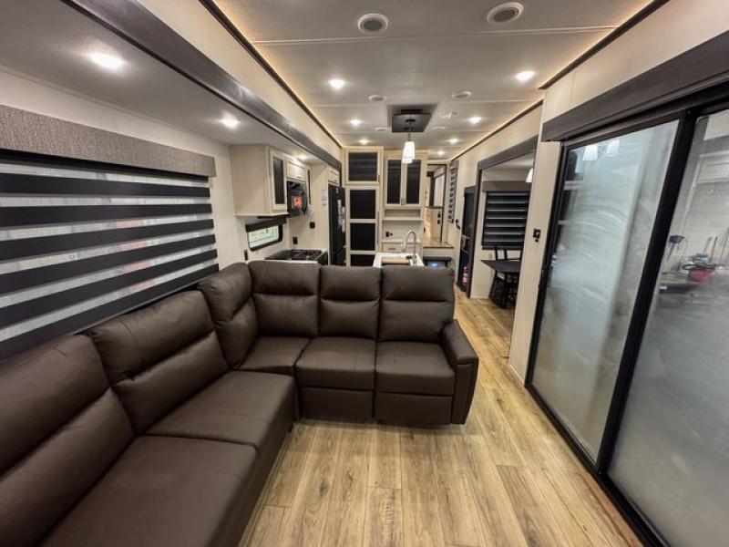This fifth wheel is sure to have you feeling right at home, wherever you choose to roam! The rear living room is inviting with its sectional sofa, an entertainment center, and a fireplace, plus this room includes sliding patio doors that lead to the patio deck! The chef of your group can prepare home cooked meals in the middle kitchen that includes generous counter space, along with a hutch, pantry, and residential size refrigerator. A full bath includes a spacious shower with a seat for added comfort, and the camper king bed slide in the front bedroom is sure to provide a great night's rest. There is also a dresser and a front wardrobe with washer and dryer prep if you want to add those appliances.