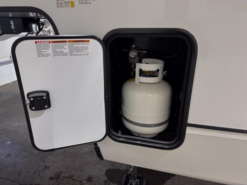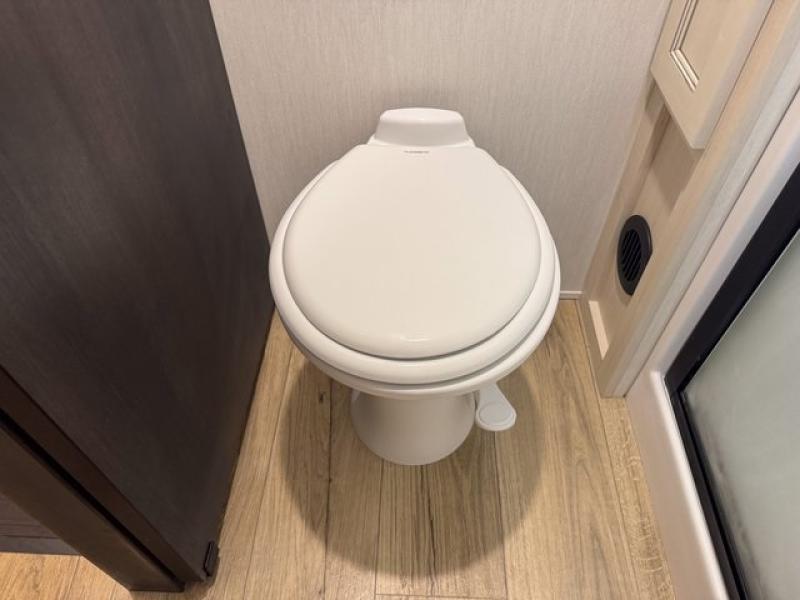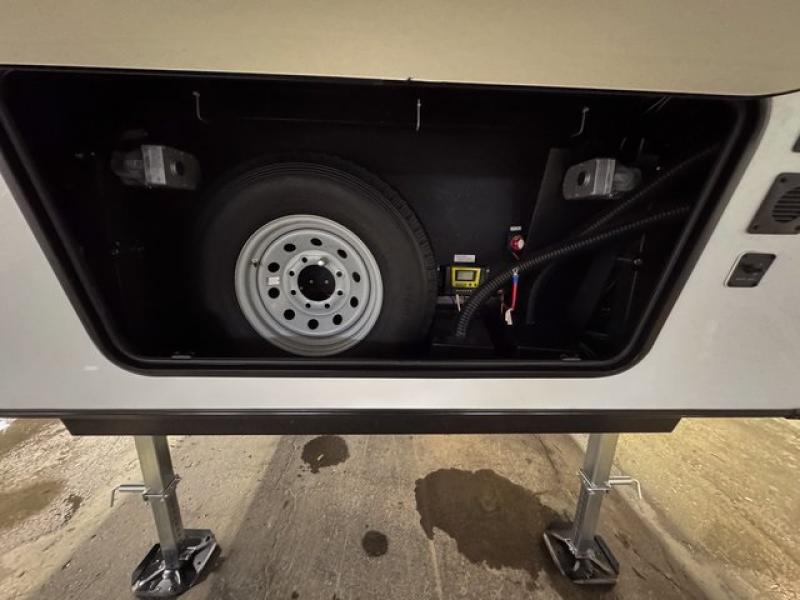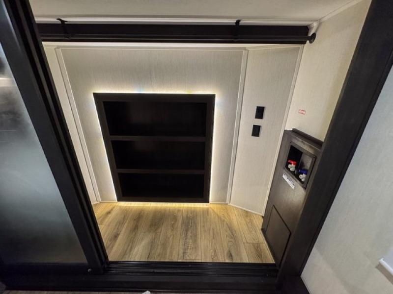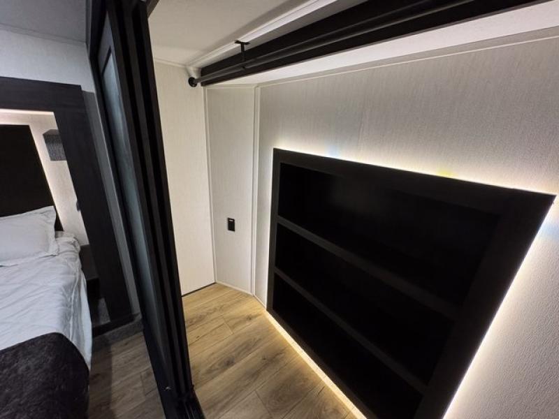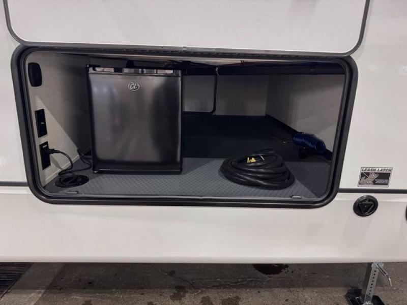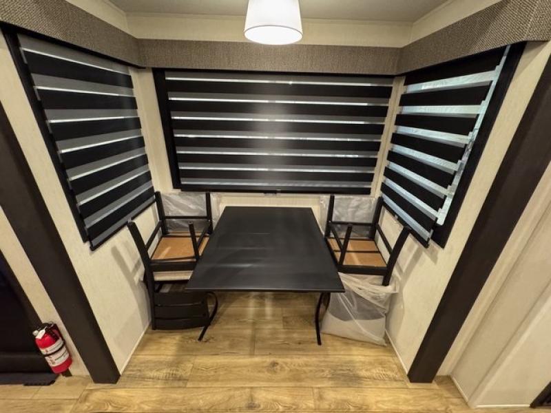 This fifth wheel is sure to have you feeling right at home, wherever you choose to roam! The rear living room is inviting with its sectional sofa, an entertainment center, and a fireplace, plus this room includes sliding patio doors that lead to the patio deck! The chef of your group can prepare home cooked meals in the middle kitchen that includes generous counter space, along with a hutch, pantry, and residential size refrigerator. A full bath includes a spacious shower with a seat for added comfort, and the camper king bed slide in the front bedroom is sure to provide a great night's rest. There is also a dresser and a front wardrobe with washer and dryer prep if you want to add those appliances.