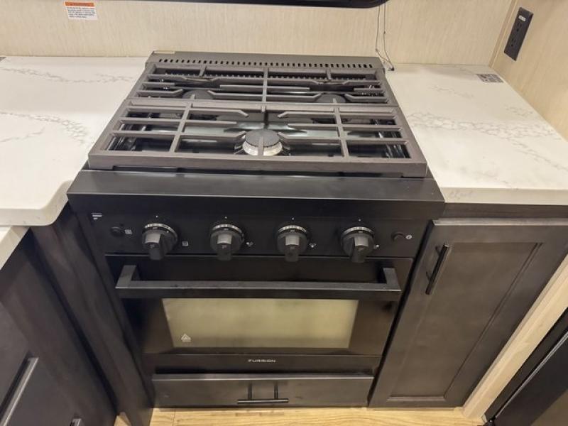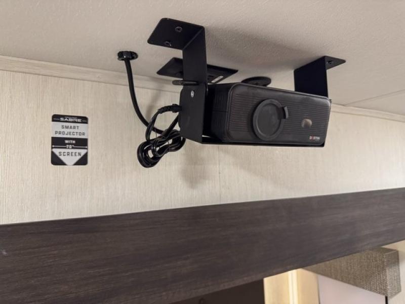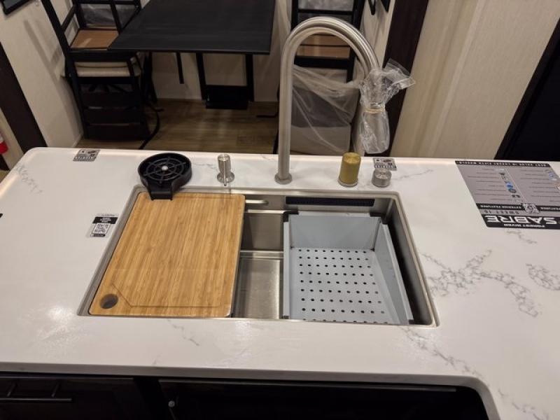 You will experience luxurious camping trips at an affordable price with any one of these Forest River Sabre fifth wheels! These models are durable and ready to travel anytime of the year thanks to features like the high-gloss gel-coat front cap with LED lighting, the PVC roof membrane, and the forced air underbelly with enclosed gate valves. The electric auto-leveling system makes setting up easy and safe, and the adjustable power awning with LED lighting will create an inviting outdoor living space. Each model includes a universal docking station which includes a black tank flush and an outside shower, and adjustable stable steps for you to enter and exit the unit safely. Inside, you will love the design of the ambient accent lighting in the living area, the real wood lumbercore cabinetry, and the linoleum flooring!