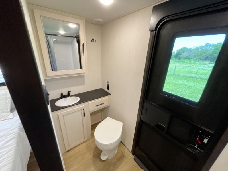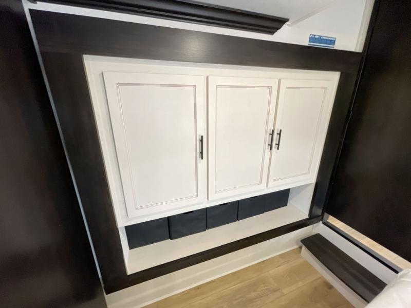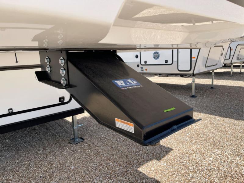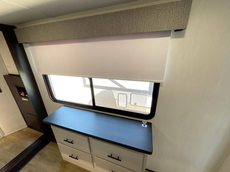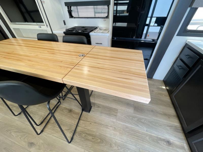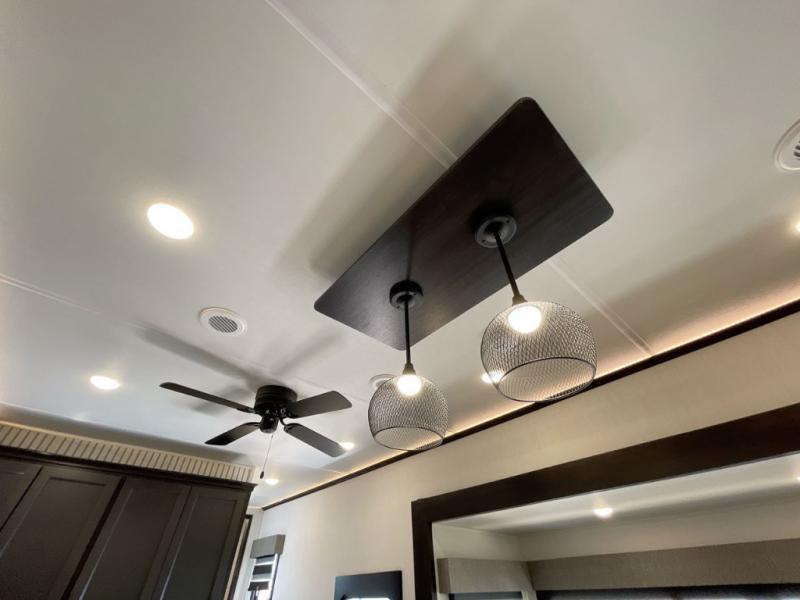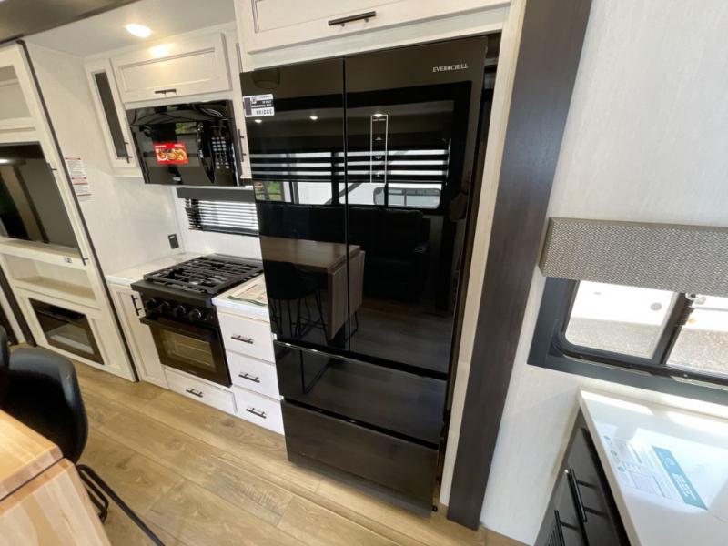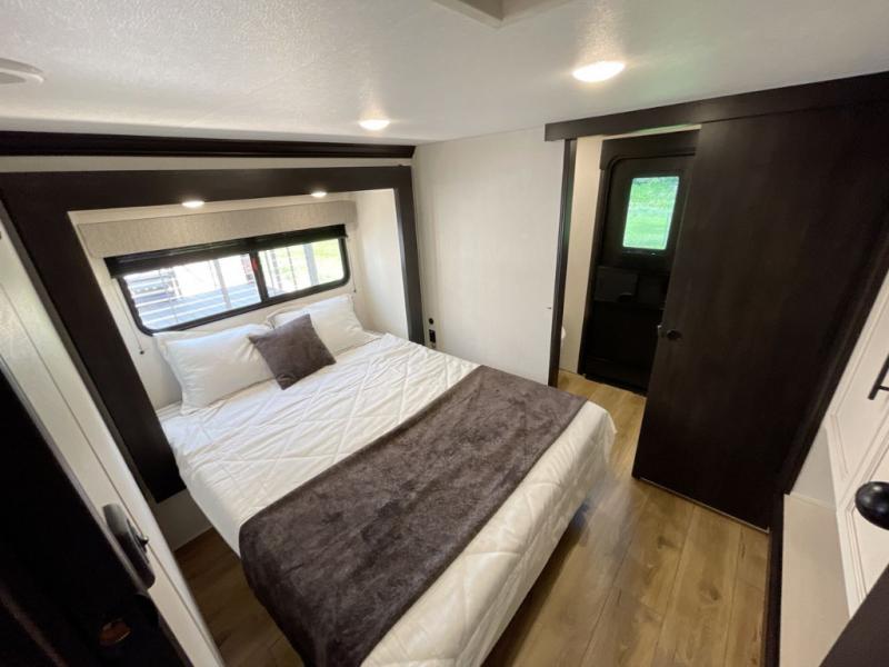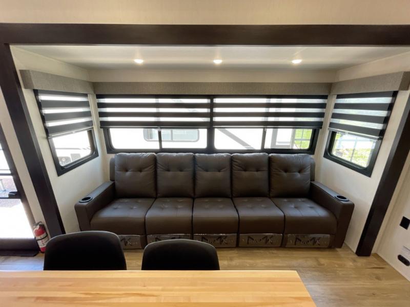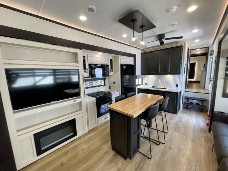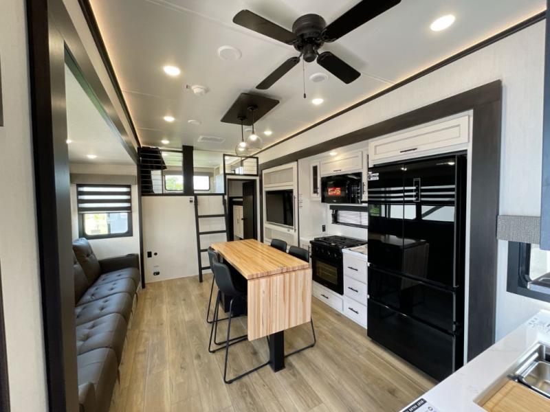 Are you looking for a fifth wheel where you can bring along your neighbor friends? You can do just that since there are two bedrooms in this unit, one of which includes a master bath with its own exterior entry door! The front bedroom is right next to the second full bath for convenience, and includes a camper king bed slide, a dresser, and front wardrobe. The rear master bedroom has a queen bed slide out across from a second slide for more floor space, and there is a loft above this room for more sleeping or storage space. Everyone can meet in the middle kitchen and living room since there are recliners, a ceiling fan, and kitchen island with four chairs. There is also storage below the island for kitchen necessities, and the hidden pantry behind the TV will be perfect for snacks, board games and more!