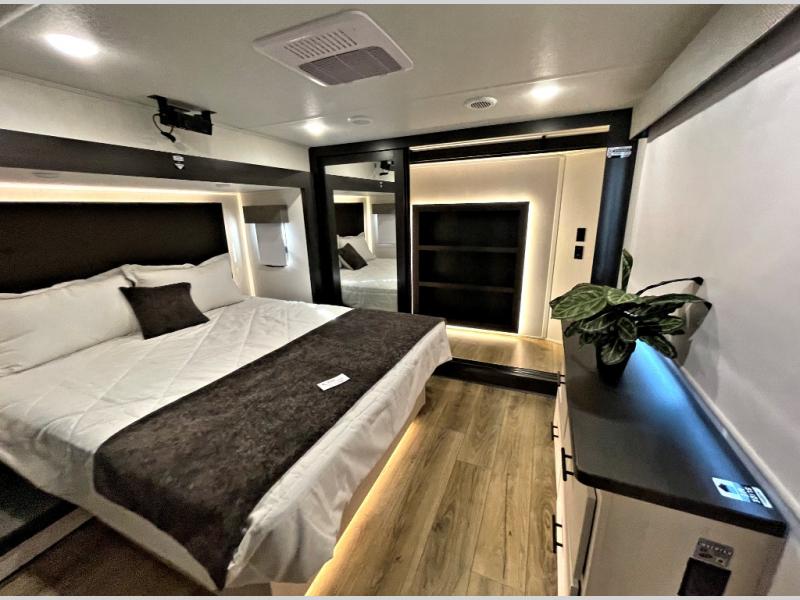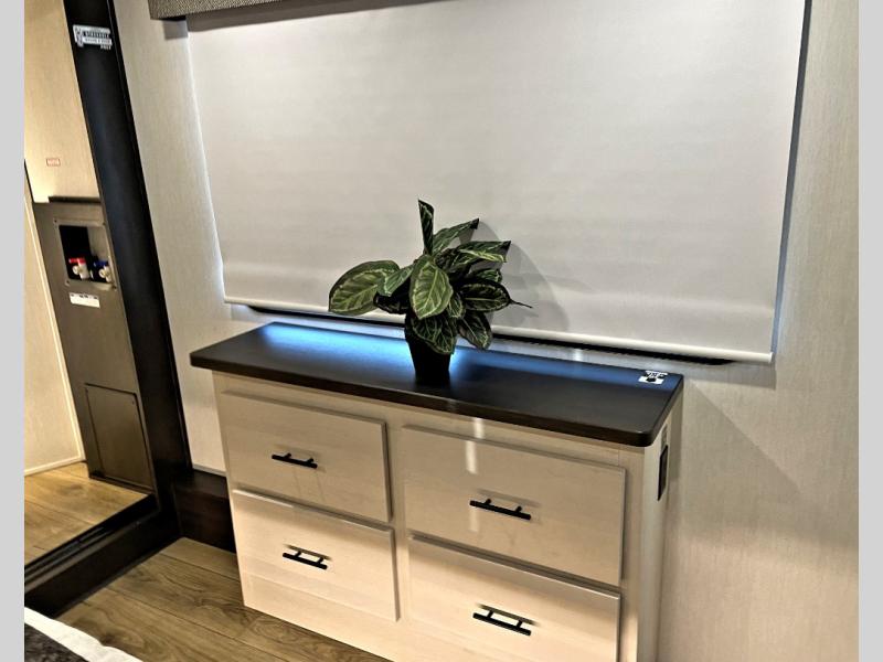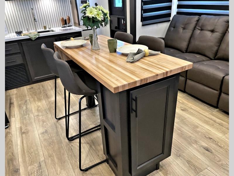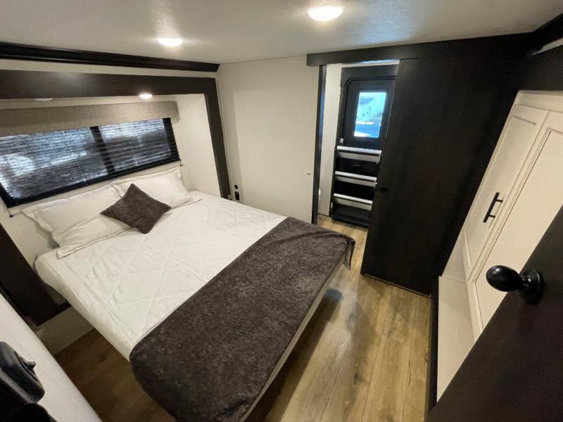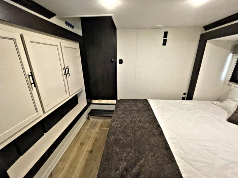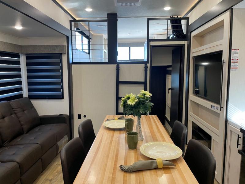 Are you looking for a fifth wheel where you can bring along your neighbor friends? You can do just that since there are two bedrooms in this unit, one of which includes a master bath with its own exterior entry door! The front bedroom is right next to the second full bath for convenience, and includes a camper king bed slide, a dresser, and front wardrobe. The rear master bedroom has a queen bed slide out across from a second slide for more floor space, and there is a loft above this room for more sleeping or storage space. Everyone can meet in the middle kitchen and living room since there are recliners, a ceiling fan, and kitchen island with four chairs. There is also storage below the island for kitchen necessities, and the hidden pantry behind the TV will be perfect for snacks, board games and more!