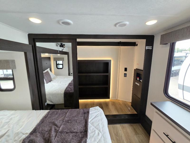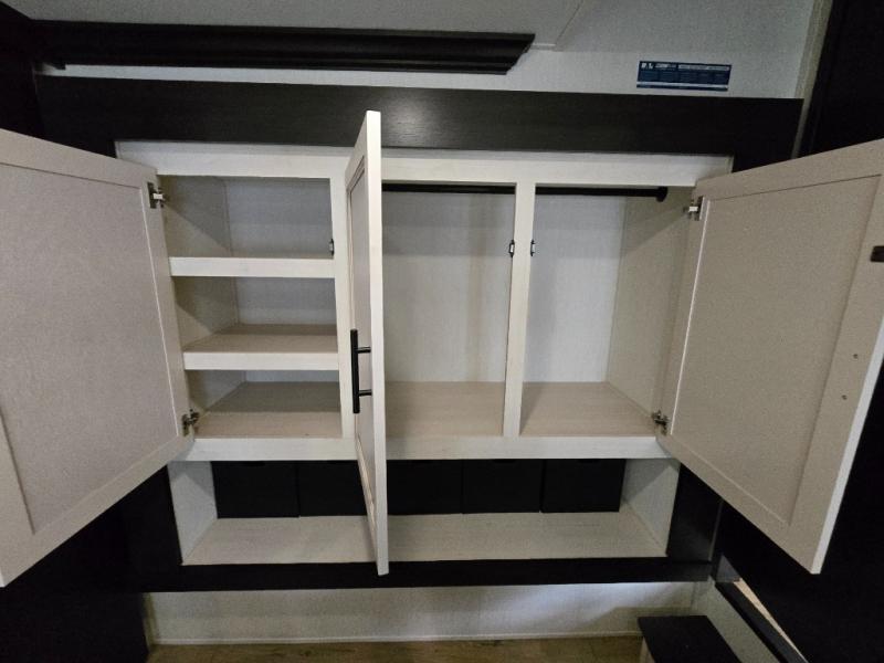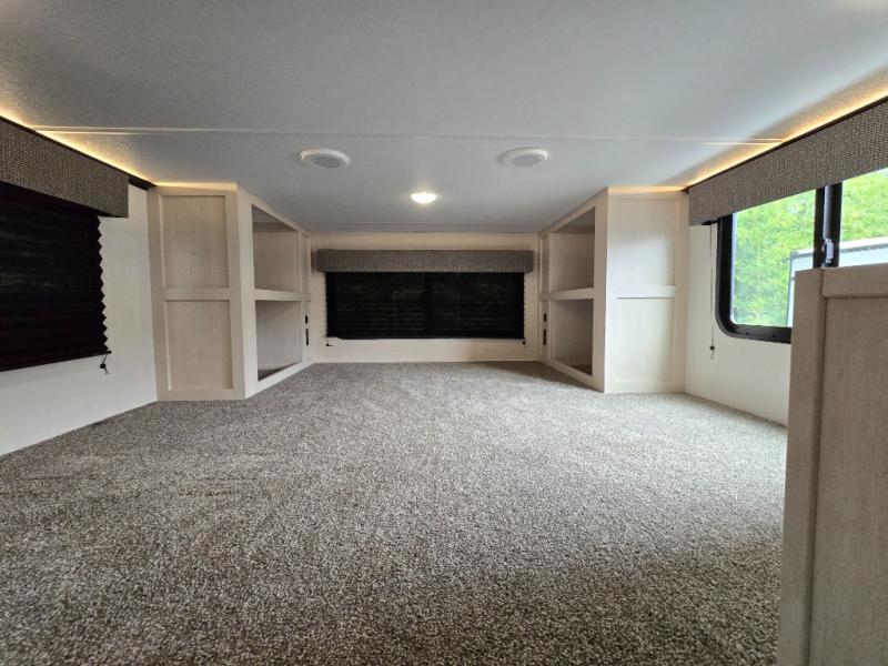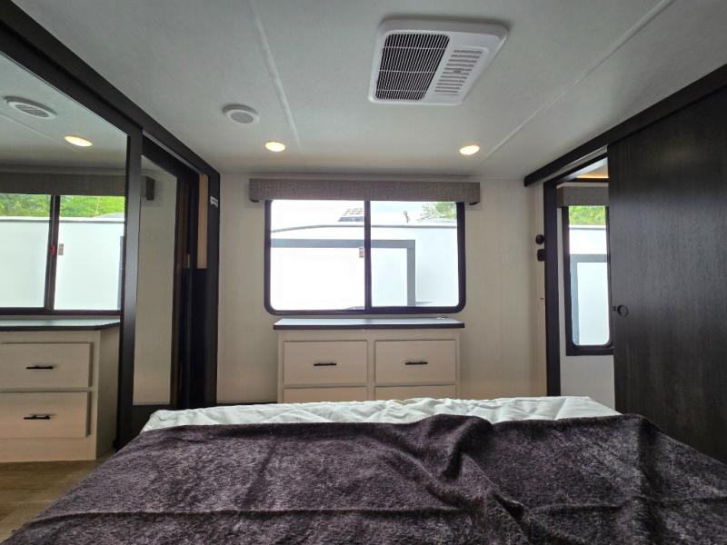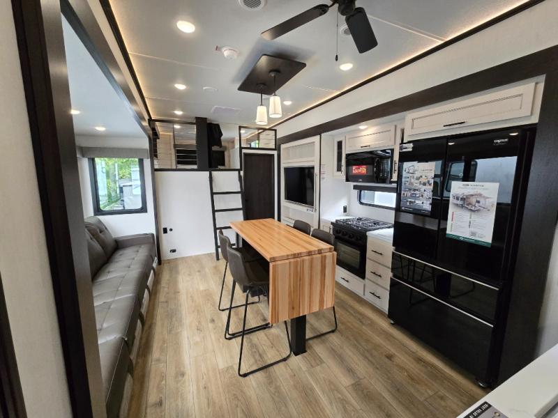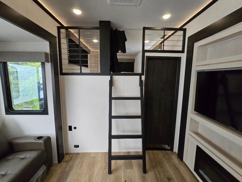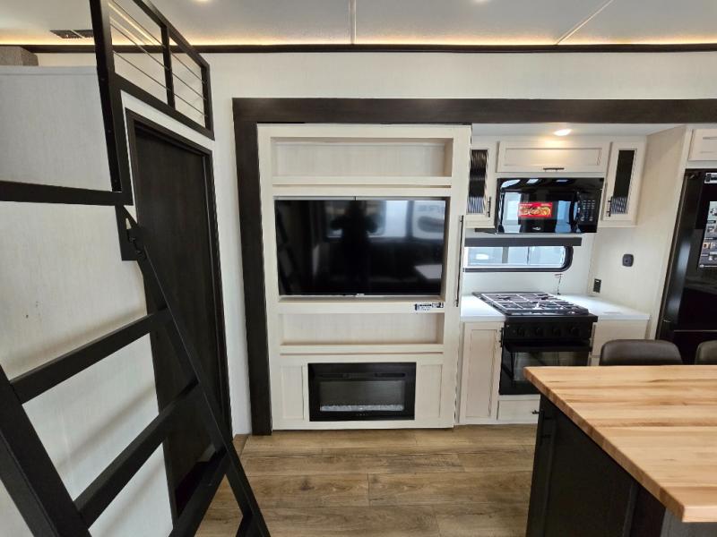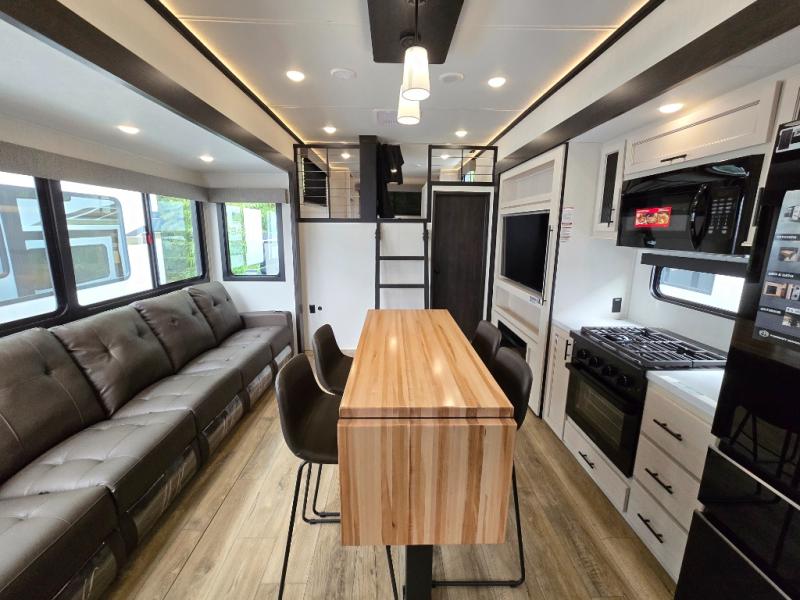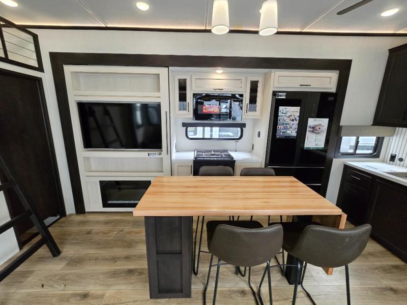 Are you looking for a fifth wheel where you can bring along your neighbor friends? You can do just that since there are two bedrooms in this unit, one of which includes a master bath with its own exterior entry door! The front bedroom is right next to the second full bath for convenience, and includes a camper king bed slide, a dresser, and front wardrobe. The rear master bedroom has a queen bed slide out across from a second slide for more floor space, and there is a loft above this room for more sleeping or storage space. Everyone can meet in the middle kitchen and living room since there are recliners, a ceiling fan, and kitchen island with four chairs. There is also storage below the island for kitchen necessities, and the hidden pantry behind the TV will be perfect for snacks, board games and more!