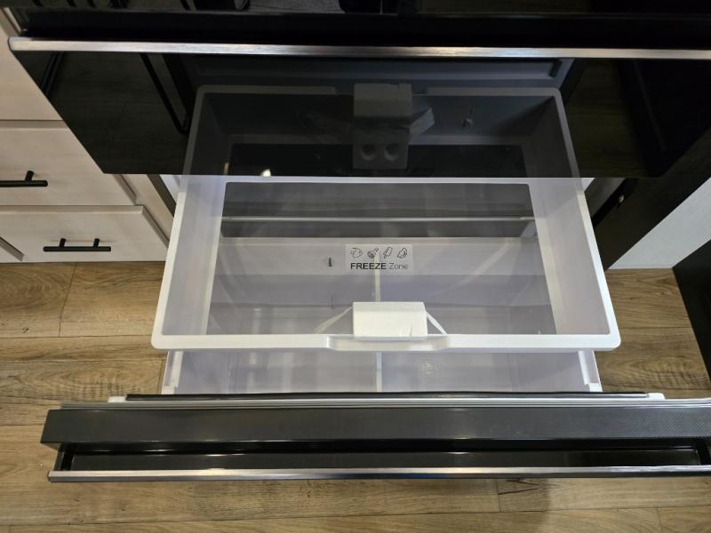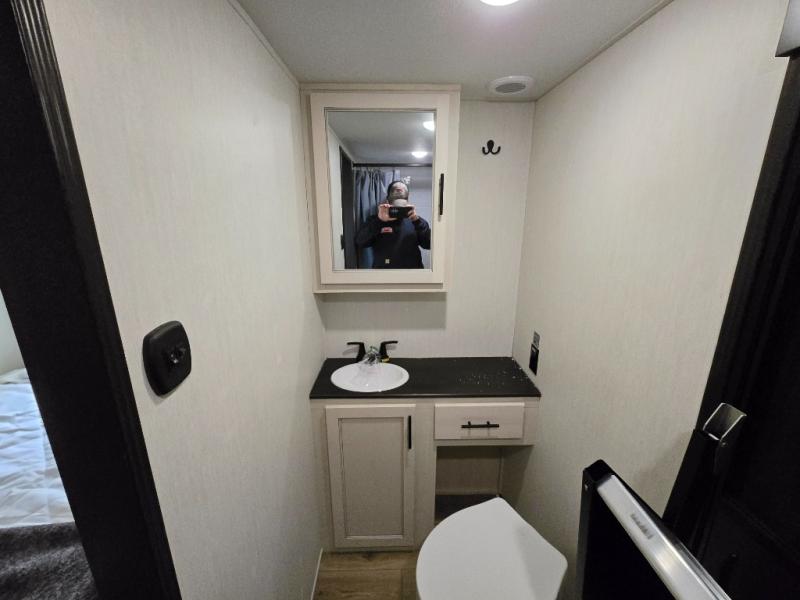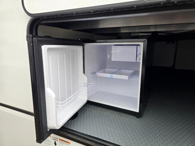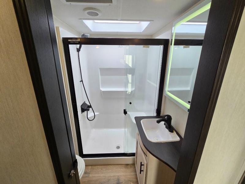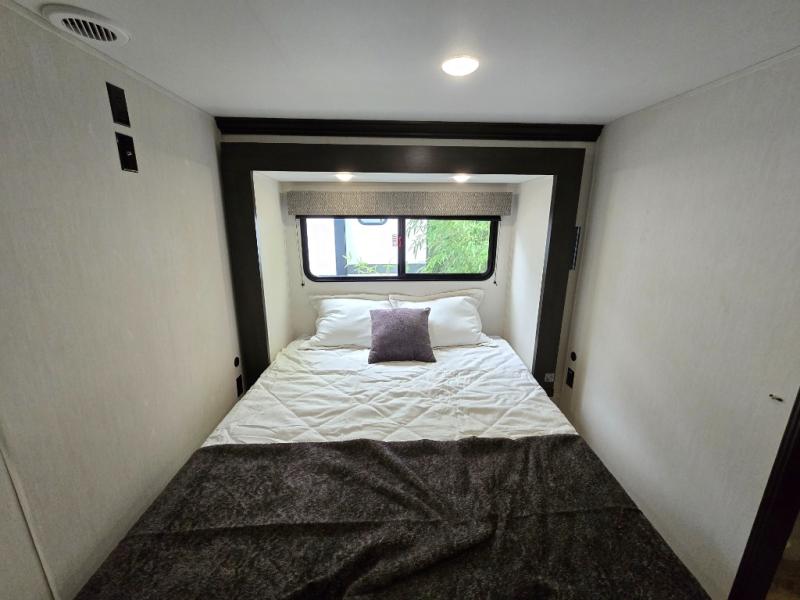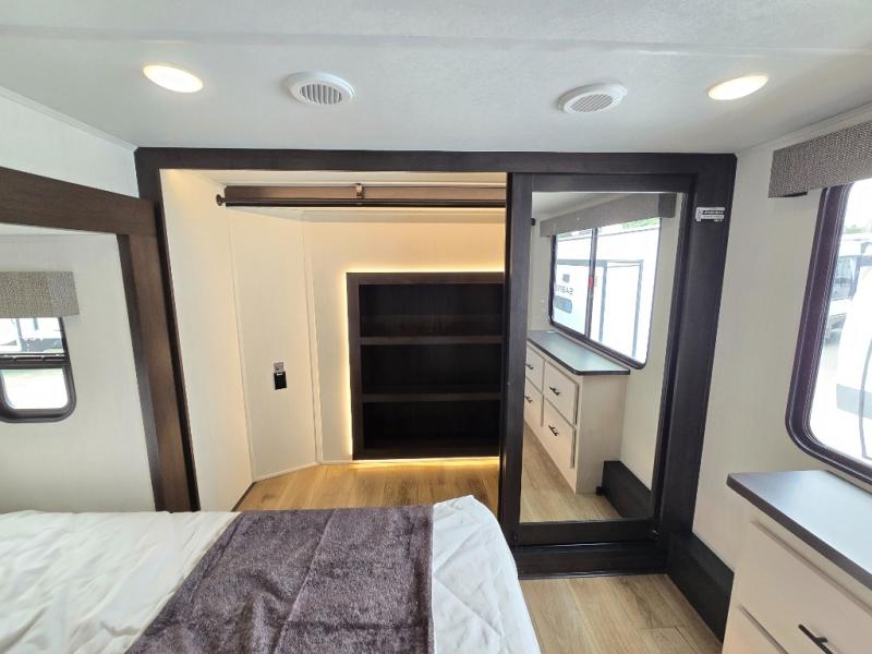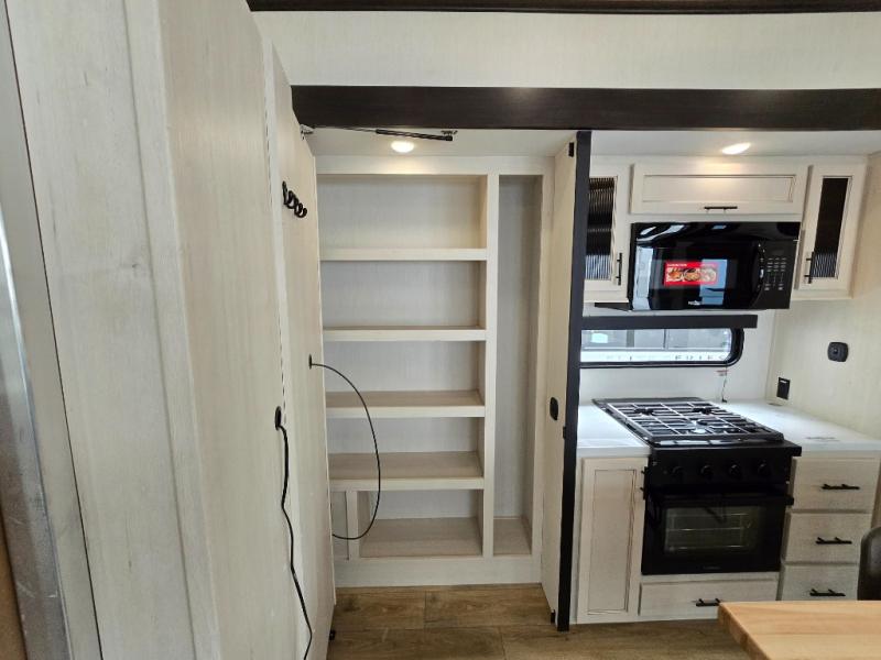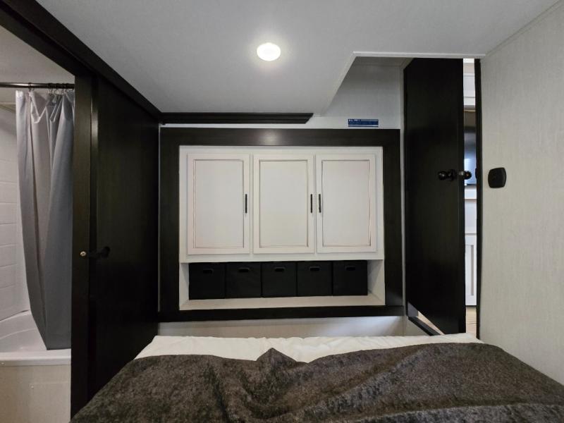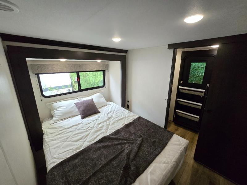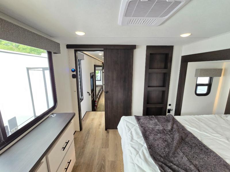 Are you looking for a fifth wheel where you can bring along your neighbor friends? You can do just that since there are two bedrooms in this unit, one of which includes a master bath with its own exterior entry door! The front bedroom is right next to the second full bath for convenience, and includes a camper king bed slide, a dresser, and front wardrobe. The rear master bedroom has a queen bed slide out across from a second slide for more floor space, and there is a loft above this room for more sleeping or storage space. Everyone can meet in the middle kitchen and living room since there are recliners, a ceiling fan, and kitchen island with four chairs. There is also storage below the island for kitchen necessities, and the hidden pantry behind the TV will be perfect for snacks, board games and more!