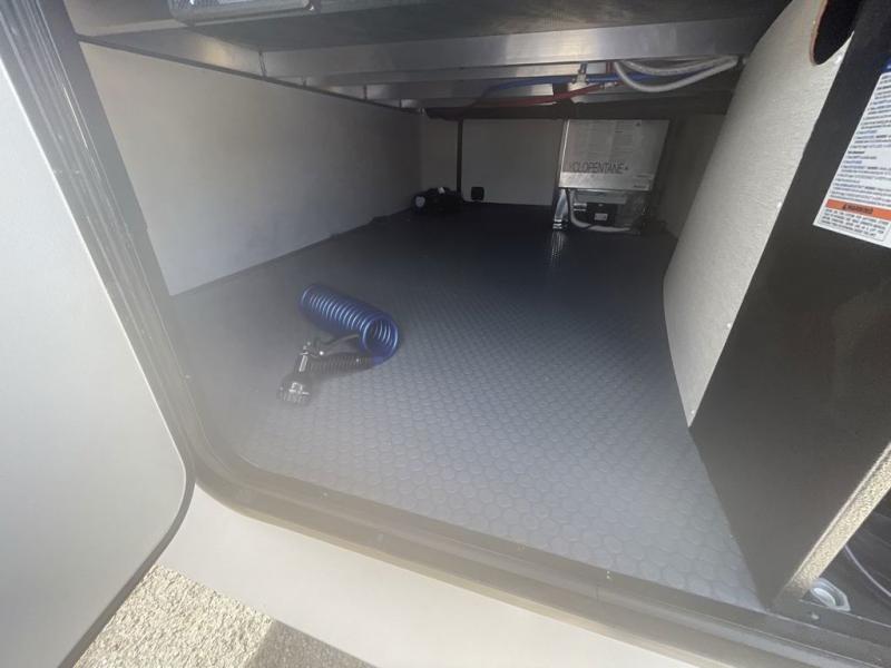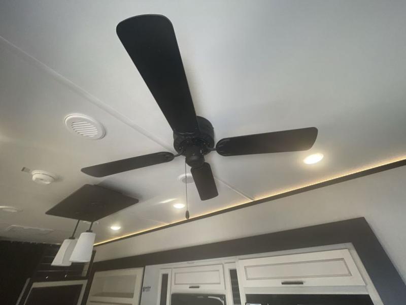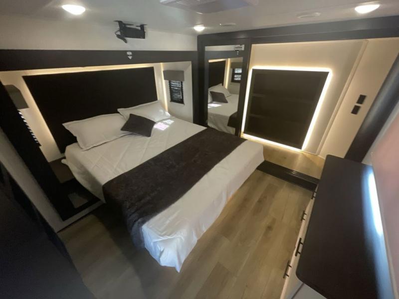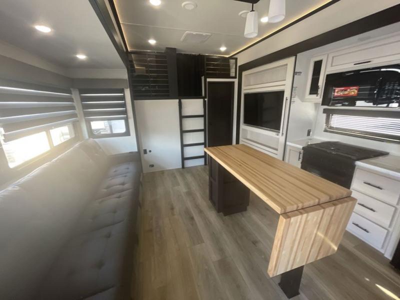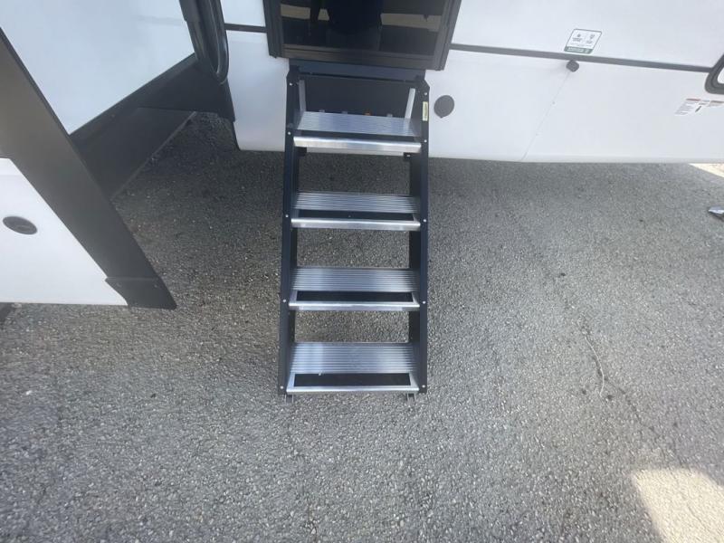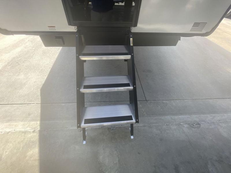 Are you looking for a fifth wheel where you can bring along your neighbor friends? You can do just that since there are two bedrooms in this unit, one of which includes a master bath with its own exterior entry door! The front bedroom is right next to the second full bath for convenience, and includes a camper king bed slide, a dresser, and front wardrobe. The rear master bedroom has a queen bed slide out across from a second slide for more floor space, and there is a loft above this room for more sleeping or storage space. Everyone can meet in the middle kitchen and living room since there are recliners, a ceiling fan, and kitchen island with four chairs. There is also storage below the island for kitchen necessities, and the hidden pantry behind the TV will be perfect for snacks, board games and more!