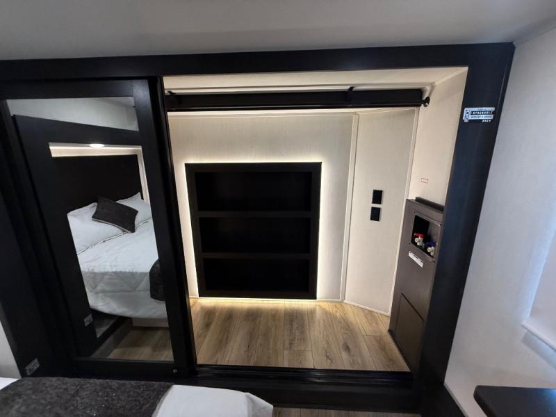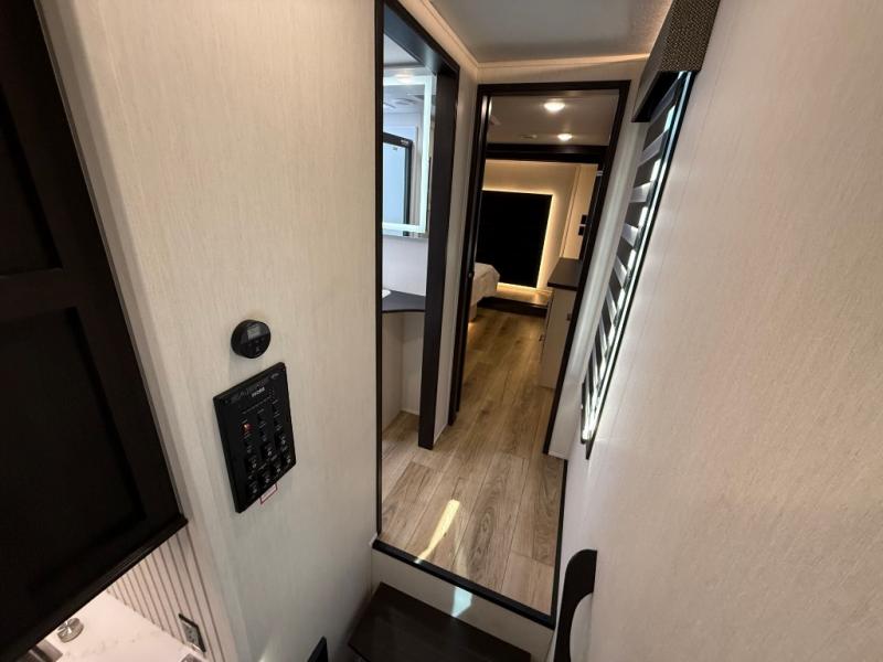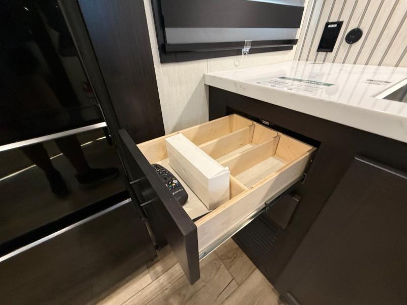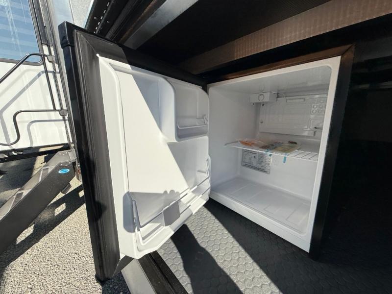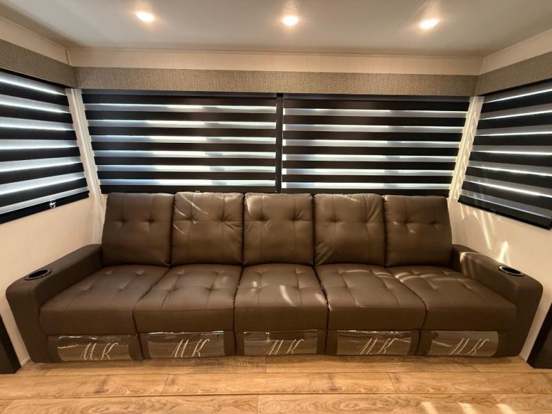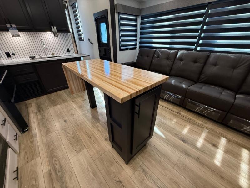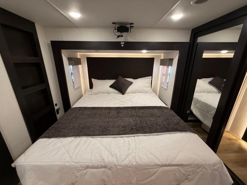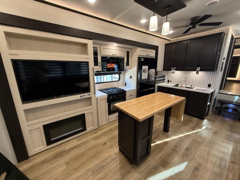 Are you looking for a fifth wheel where you can bring along your neighbor friends? You can do just that since there are two bedrooms in this unit, one of which includes a master bath with its own exterior entry door! The front bedroom is right next to the second full bath for convenience, and includes a camper king bed slide, a dresser, and front wardrobe. The rear master bedroom has a queen bed slide out across from a second slide for more floor space, and there is a loft above this room for more sleeping or storage space. Everyone can meet in the middle kitchen and living room since there are recliners, a ceiling fan, and kitchen island with four chairs. There is also storage below the island for kitchen necessities, and the hidden pantry behind the TV will be perfect for snacks, board games and more!