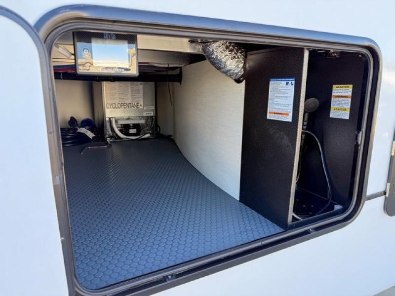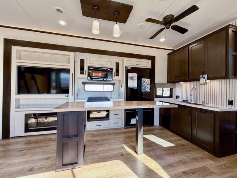 Are you looking for a fifth wheel where you can bring along your neighbor friends? You can do just that since there are two bedrooms in this unit, one of which includes a master bath with its own exterior entry door! The front bedroom is right next to the second full bath for convenience, and includes a camper king bed slide, a dresser, and front wardrobe. The rear master bedroom has a queen bed slide out across from a second slide for more floor space, and there is a loft above this room for more sleeping or storage space. Everyone can meet in the middle kitchen and living room since there are recliners, a ceiling fan, and kitchen island with four chairs. There is also storage below the island for kitchen necessities, and the hidden pantry behind the TV will be perfect for snacks, board games and more!