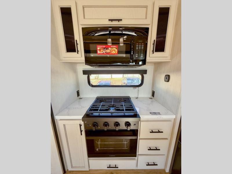 You will experience luxurious camping trips at an affordable price with any one of these Forest River Sabre fifth wheels! These models are durable and ready to travel anytime of the year thanks to features like the high-gloss gel-coat front cap with LED lighting, the PVC roof membrane, and the forced air underbelly with enclosed gate valves. The electric auto-leveling system makes setting up easy and safe, and the adjustable power awning with LED lighting will create an inviting outdoor living space. Each model includes a universal docking station which includes a black tank flush and an outside shower, and adjustable stable steps for you to enter and exit the unit safely. Inside, you will love the design of the ambient accent lighting in the living area, the real wood lumbercore cabinetry, and the linoleum flooring!