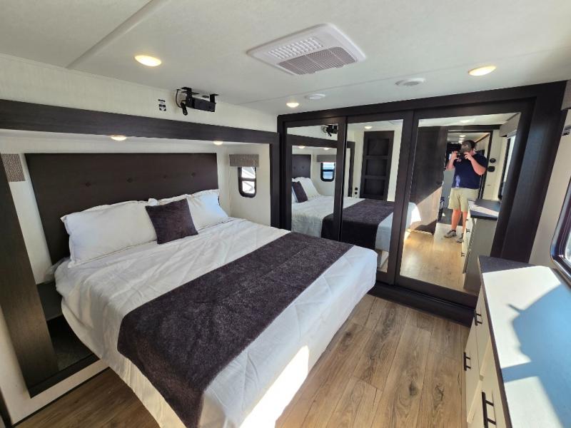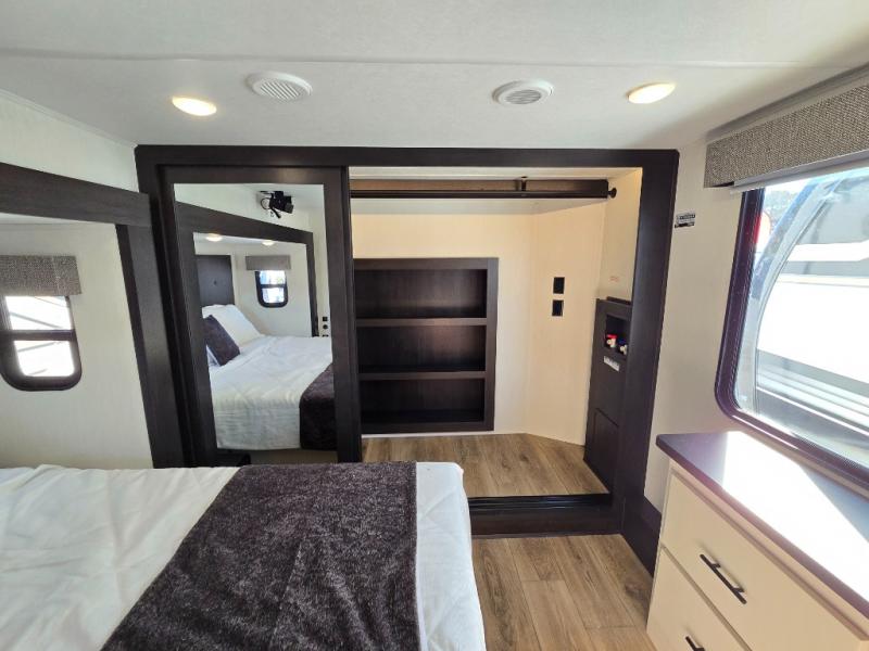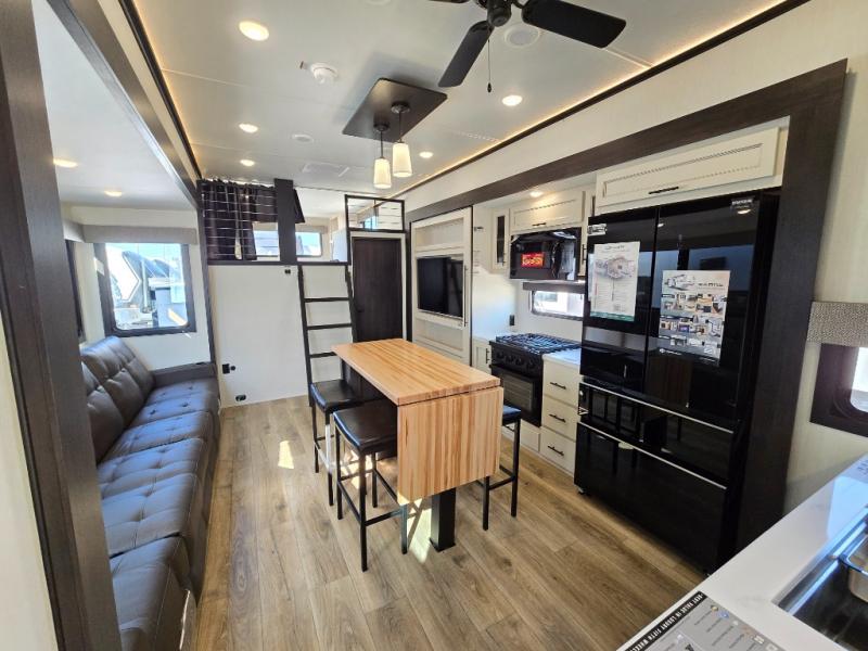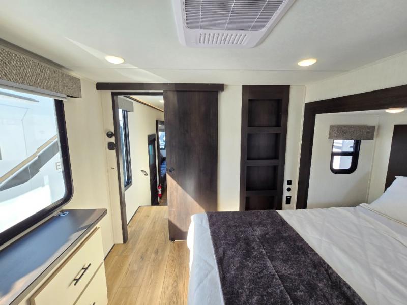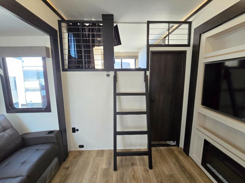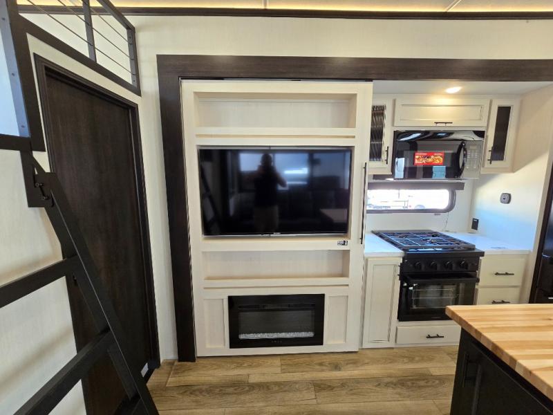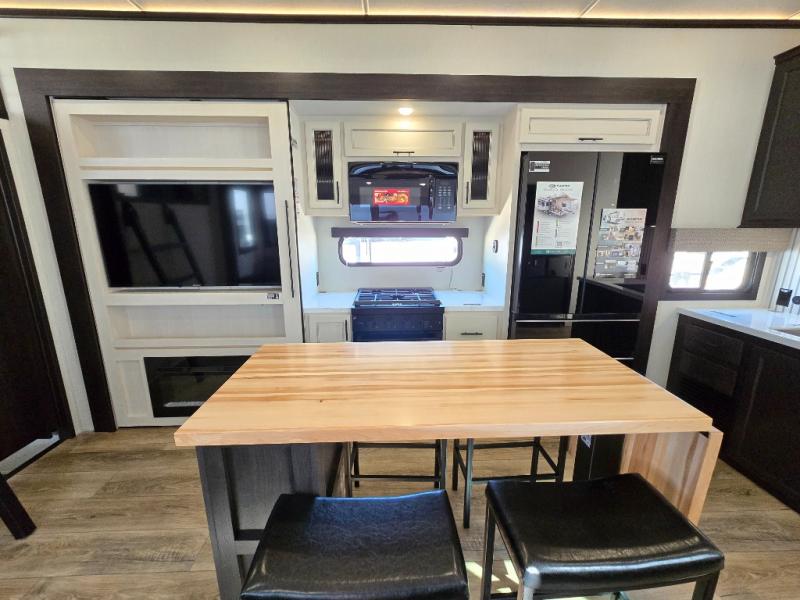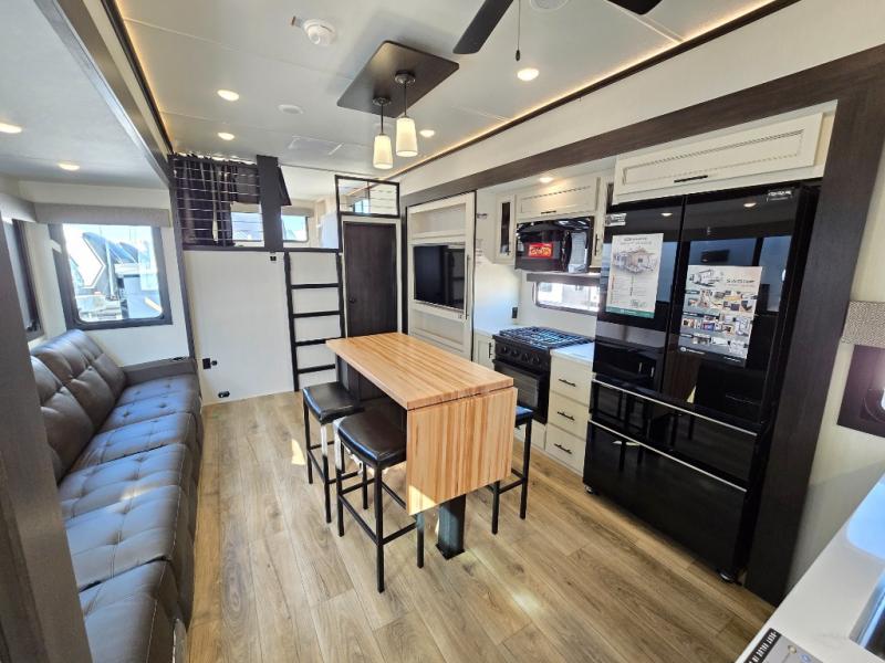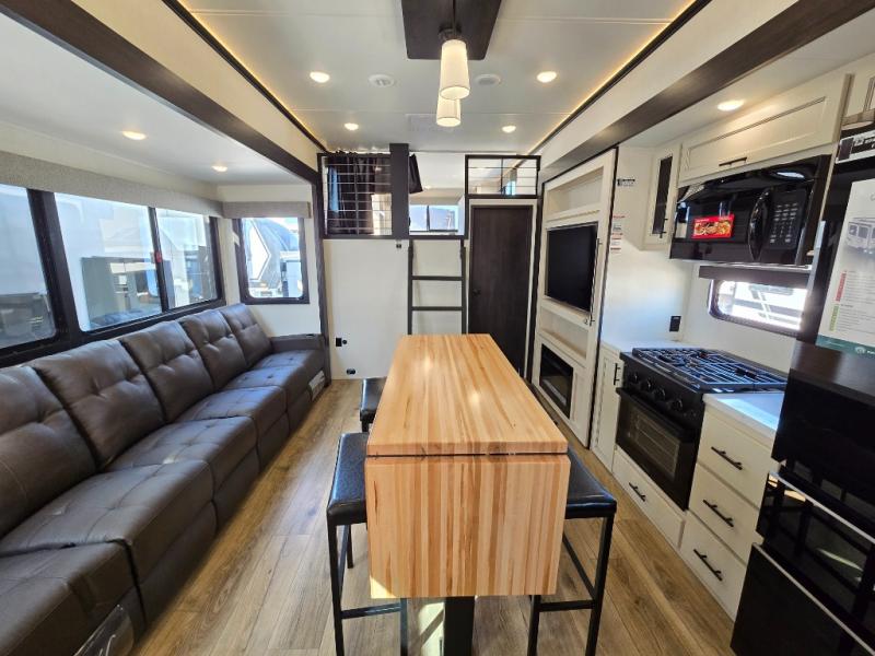Are you looking for a fifth wheel where you can bring along your neighbor friends? You can do just that since there are two bedrooms in this unit, one of which includes a master bath with its own exterior entry door! The front bedroom is right next to the second full bath for convenience, and includes a camper king bed slide, a dresser, and front wardrobe. The rear master bedroom has a queen bed slide out across from a second slide for more floor space, and there is a loft above this room for more sleeping or storage space. Everyone can meet in the middle kitchen and living room since there are recliners, a ceiling fan, and kitchen island with four chairs. There is also storage below the island for kitchen necessities, and the hidden pantry behind the TV will be perfect for snacks, board games and more!