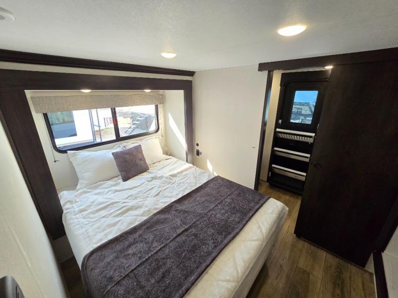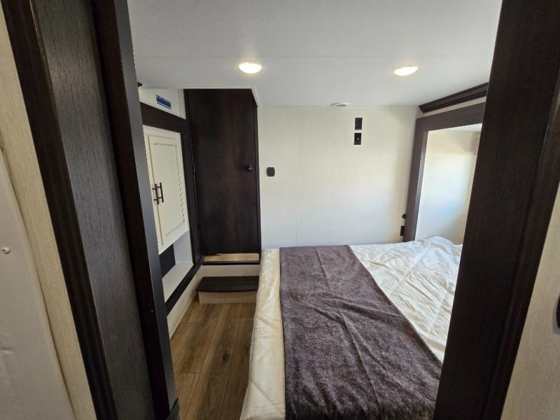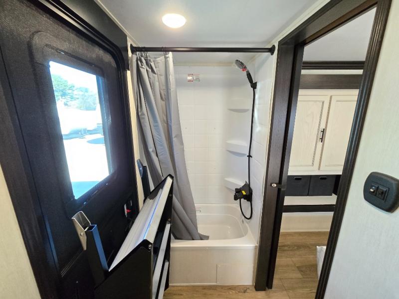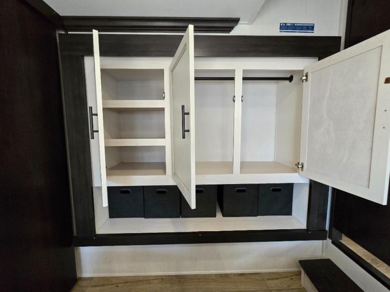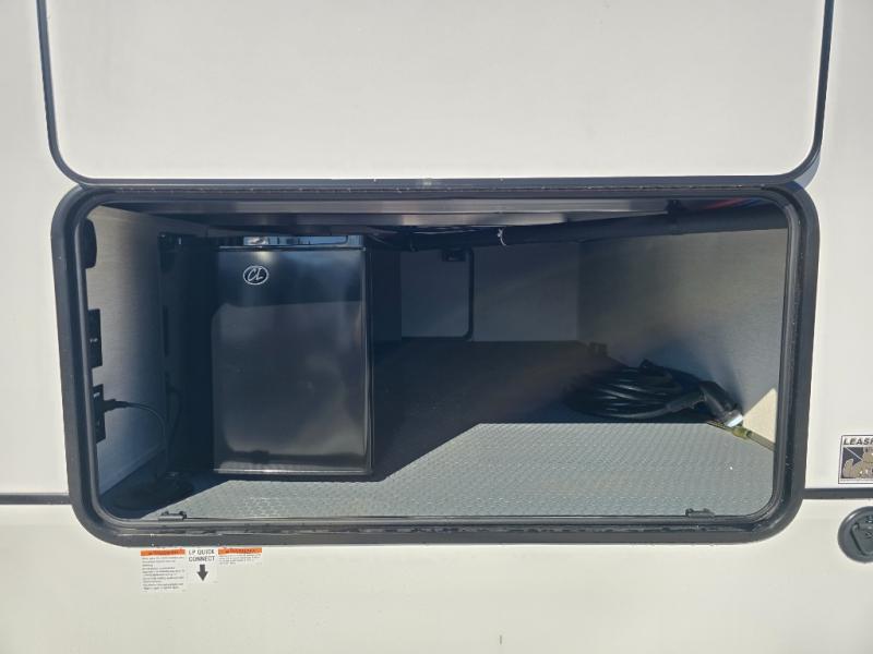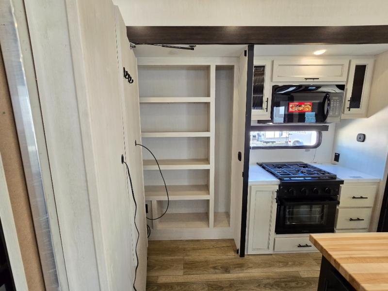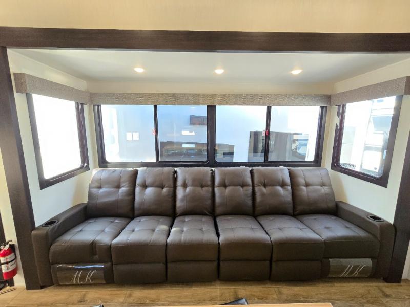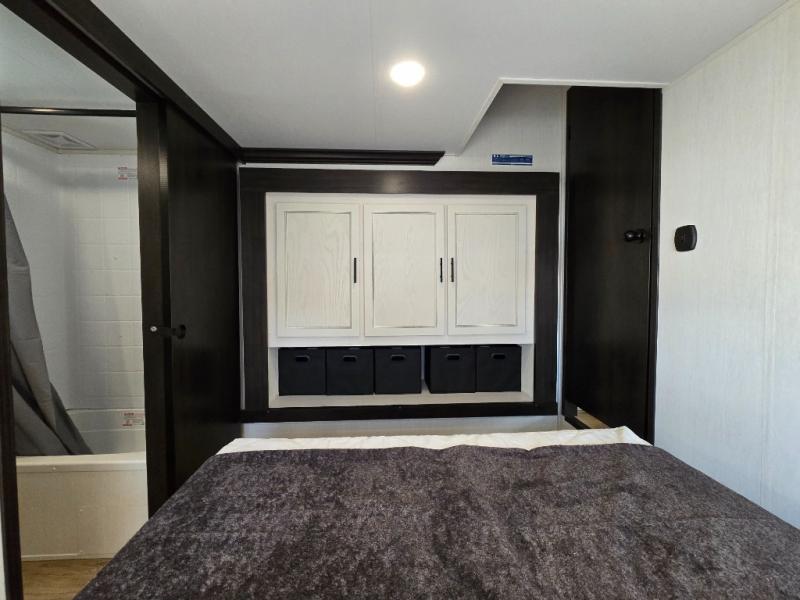 Are you looking for a fifth wheel where you can bring along your neighbor friends? You can do just that since there are two bedrooms in this unit, one of which includes a master bath with its own exterior entry door! The front bedroom is right next to the second full bath for convenience, and includes a camper king bed slide, a dresser, and front wardrobe. The rear master bedroom has a queen bed slide out across from a second slide for more floor space, and there is a loft above this room for more sleeping or storage space. Everyone can meet in the middle kitchen and living room since there are recliners, a ceiling fan, and kitchen island with four chairs. There is also storage below the island for kitchen necessities, and the hidden pantry behind the TV will be perfect for snacks, board games and more!