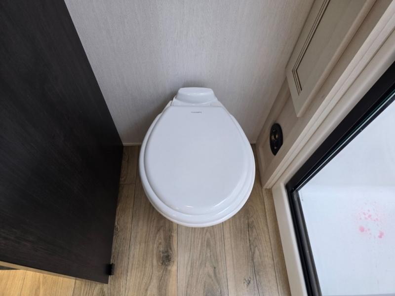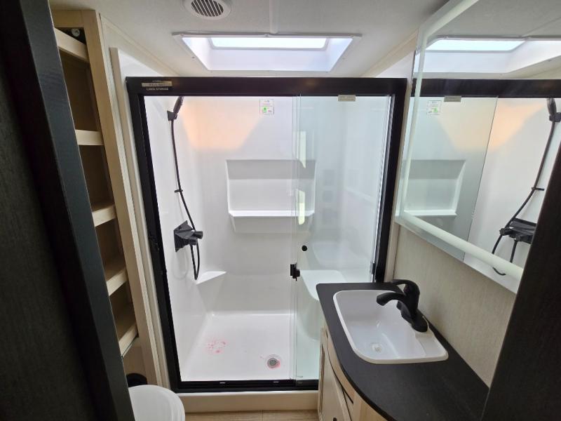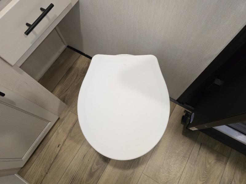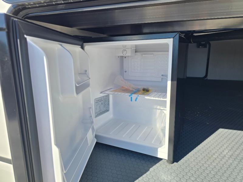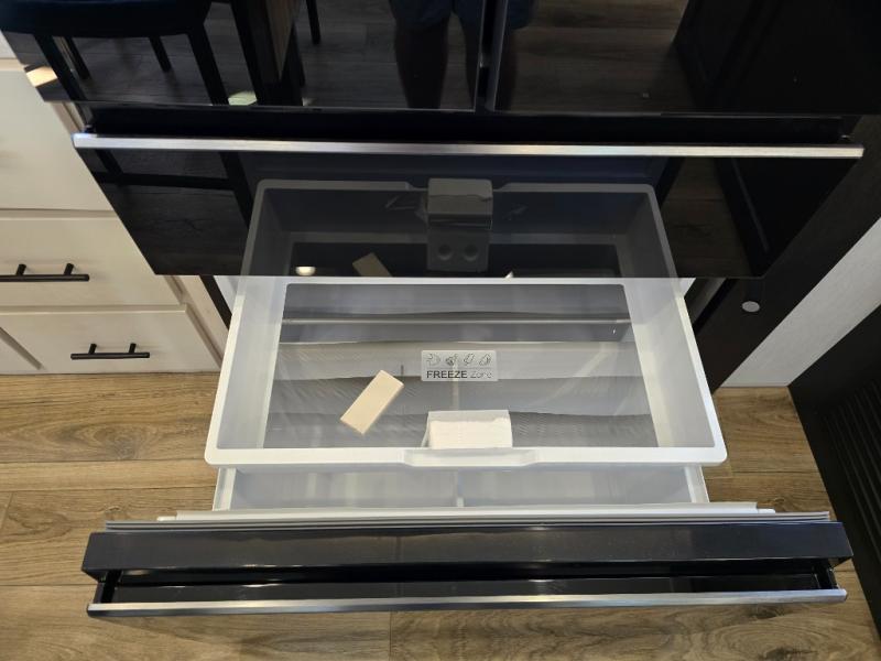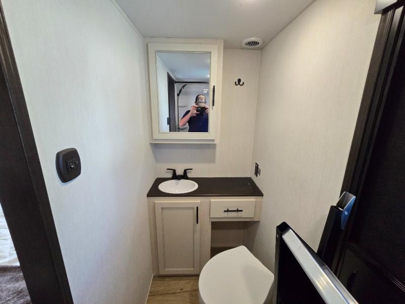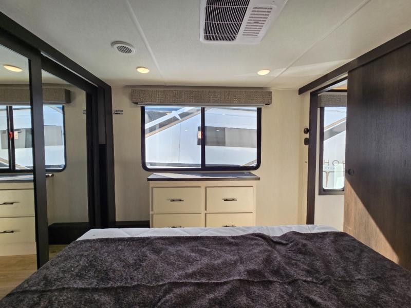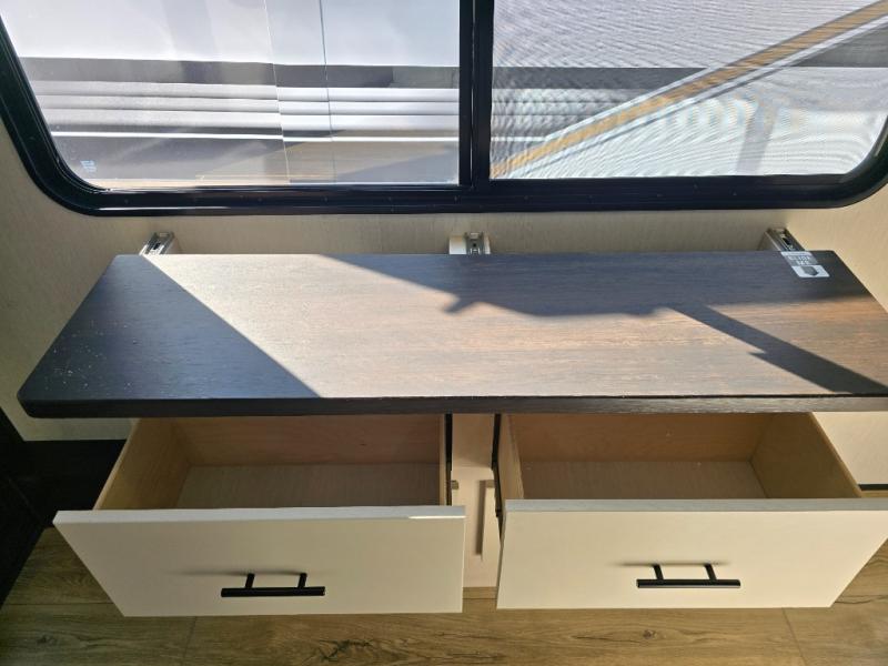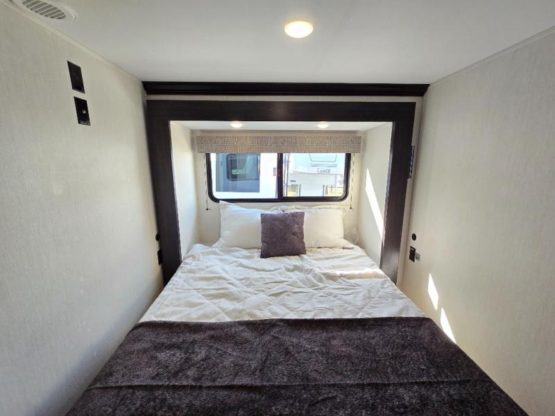 Are you looking for a fifth wheel where you can bring along your neighbor friends? You can do just that since there are two bedrooms in this unit, one of which includes a master bath with its own exterior entry door! The front bedroom is right next to the second full bath for convenience, and includes a camper king bed slide, a dresser, and front wardrobe. The rear master bedroom has a queen bed slide out across from a second slide for more floor space, and there is a loft above this room for more sleeping or storage space. Everyone can meet in the middle kitchen and living room since there are recliners, a ceiling fan, and kitchen island with four chairs. There is also storage below the island for kitchen necessities, and the hidden pantry behind the TV will be perfect for snacks, board games and more!