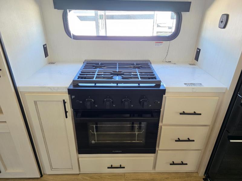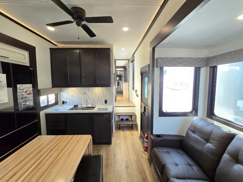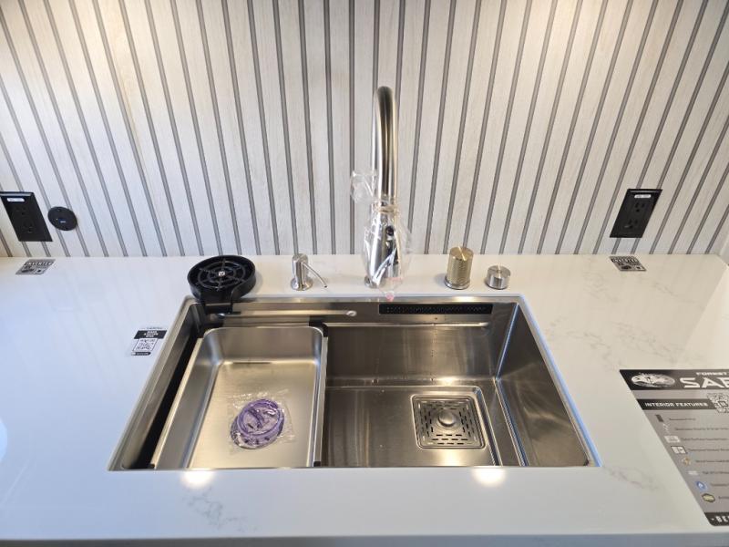 You will experience luxurious camping trips at an affordable price with any one of these Forest River Sabre fifth wheels! These models are durable and ready to travel anytime of the year thanks to features like the high-gloss gel-coat front cap with LED lighting, the PVC roof membrane, and the forced air underbelly with enclosed gate valves. The electric auto-leveling system makes setting up easy and safe, and the adjustable power awning with LED lighting will create an inviting outdoor living space. Each model includes a universal docking station which includes a black tank flush and an outside shower, and adjustable stable steps for you to enter and exit the unit safely. Inside, you will love the design of the ambient accent lighting in the living area, the real wood lumbercore cabinetry, and the linoleum flooring!