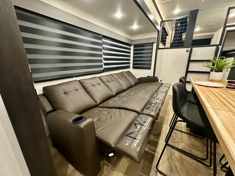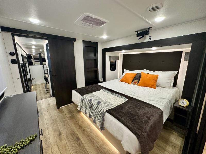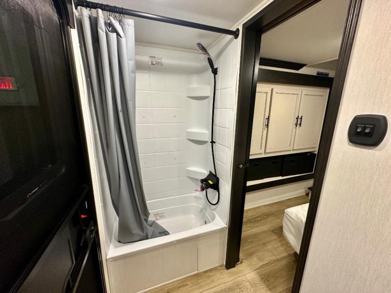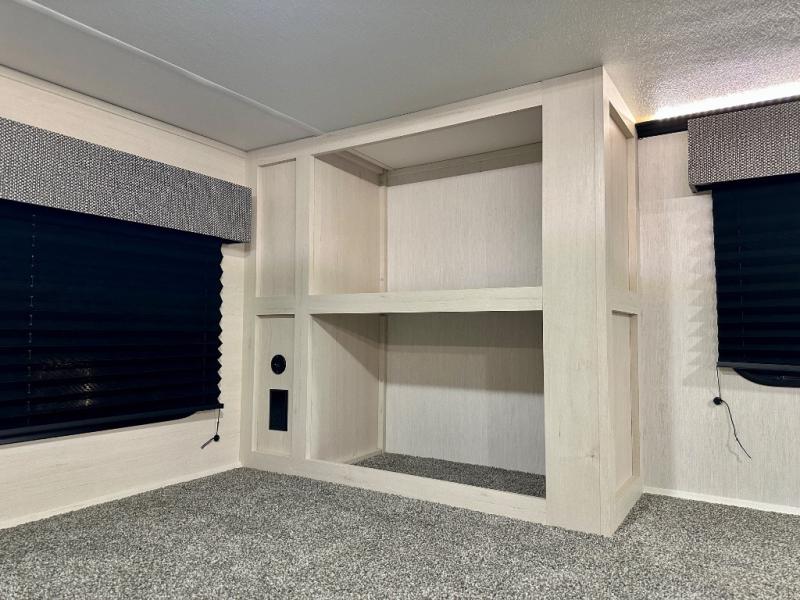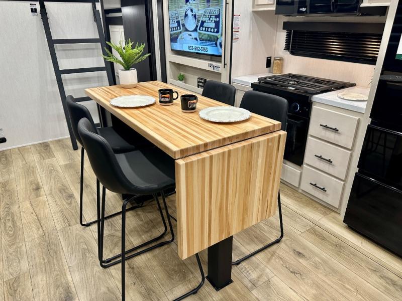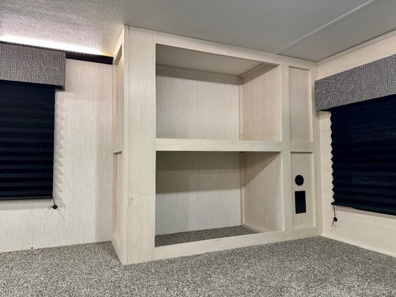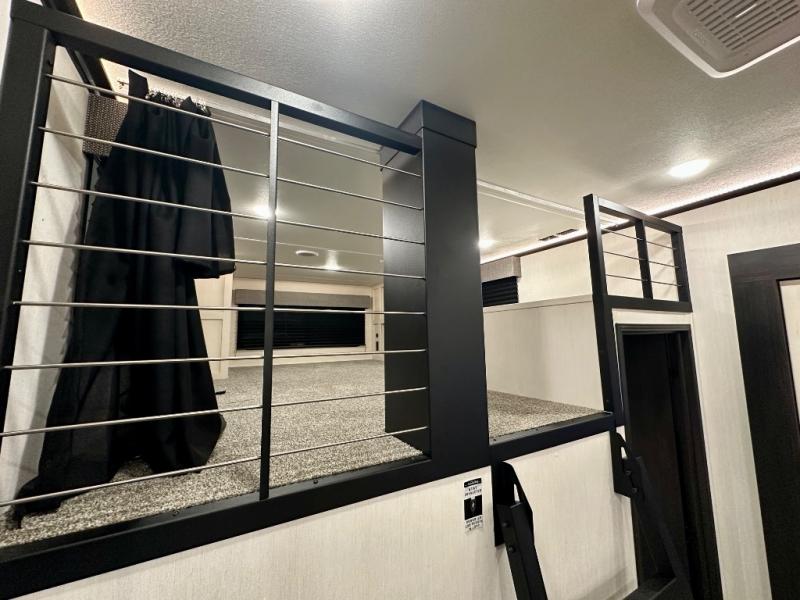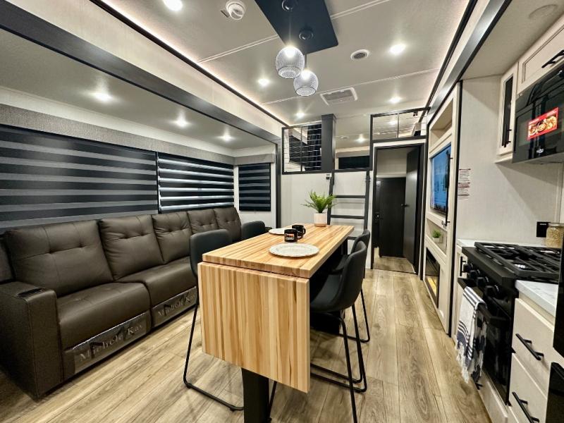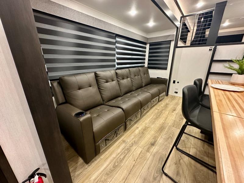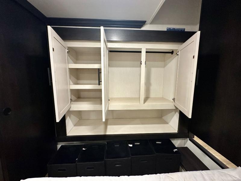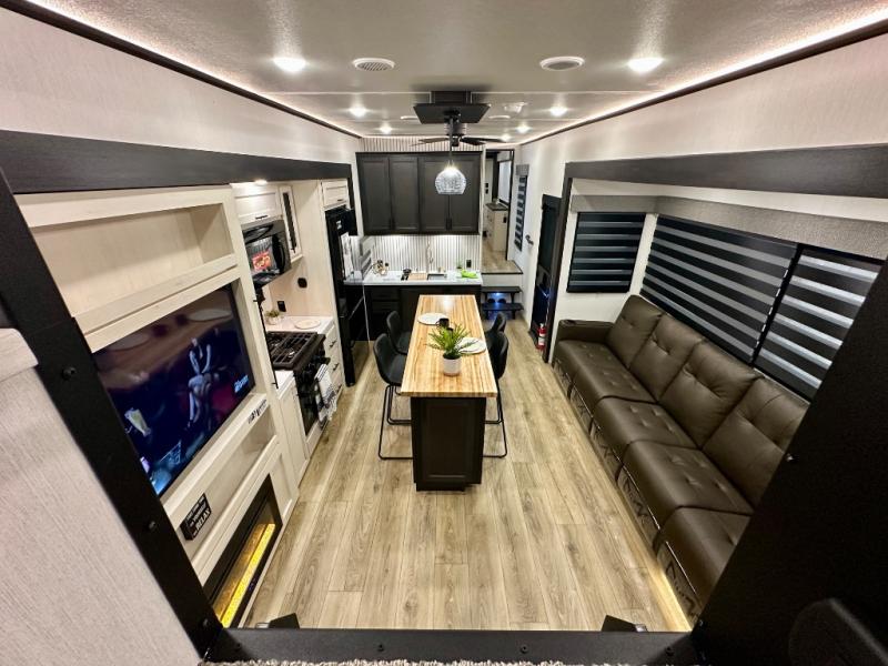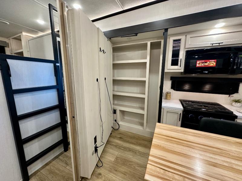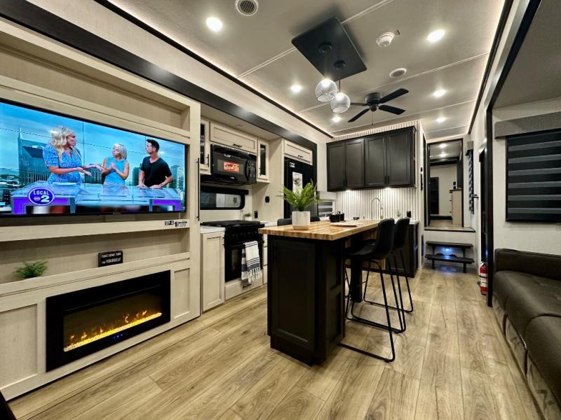 Are you looking for a fifth wheel where you can bring along your neighbor friends? You can do just that since there are two bedrooms in this unit, one of which includes a master bath with its own exterior entry door! The front bedroom is right next to the second full bath for convenience, and includes a camper king bed slide, a dresser, and front wardrobe. The rear master bedroom has a queen bed slide out across from a second slide for more floor space, and there is a loft above this room for more sleeping or storage space. Everyone can meet in the middle kitchen and living room since there are recliners, a ceiling fan, and kitchen island with four chairs. There is also storage below the island for kitchen necessities, and the hidden pantry behind the TV will be perfect for snacks, board games and more!