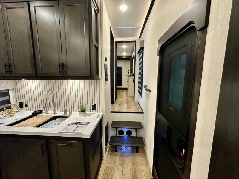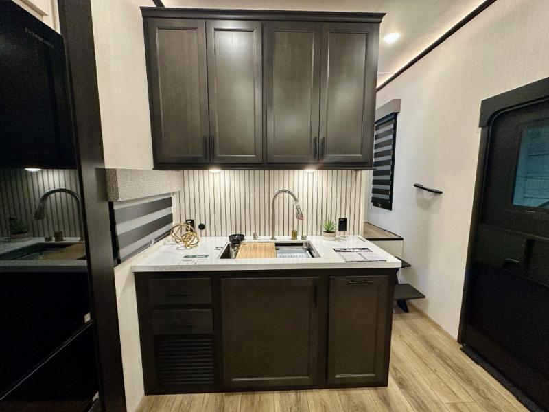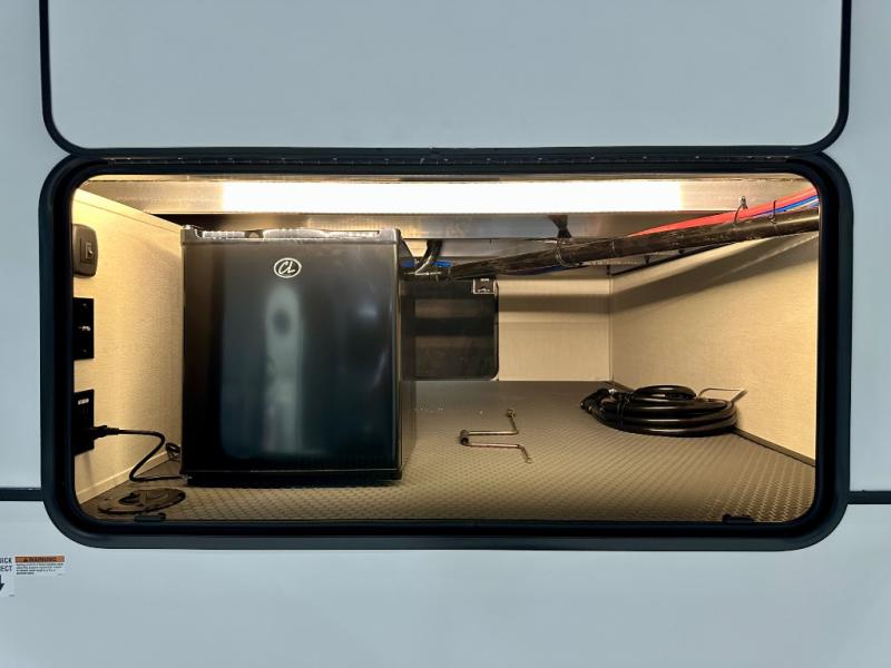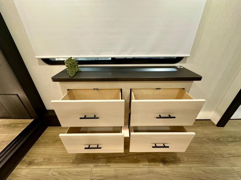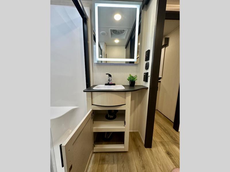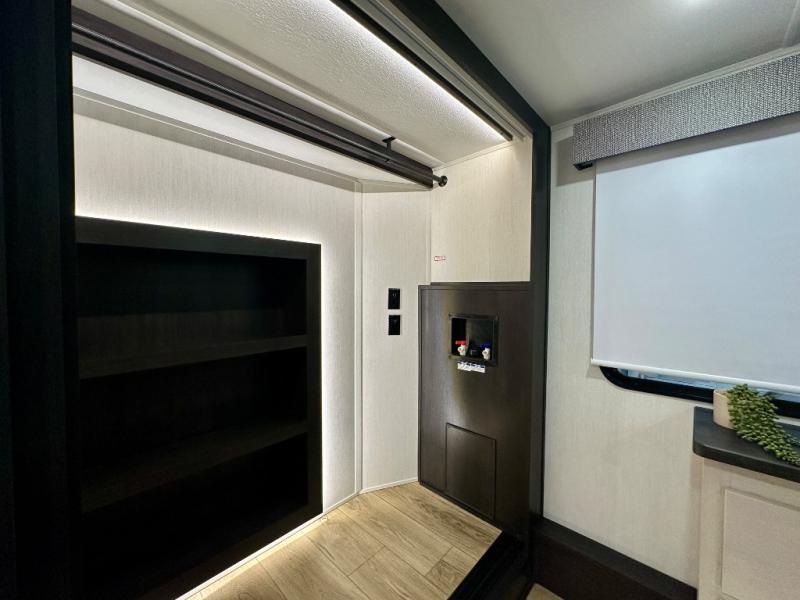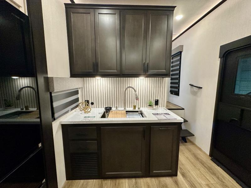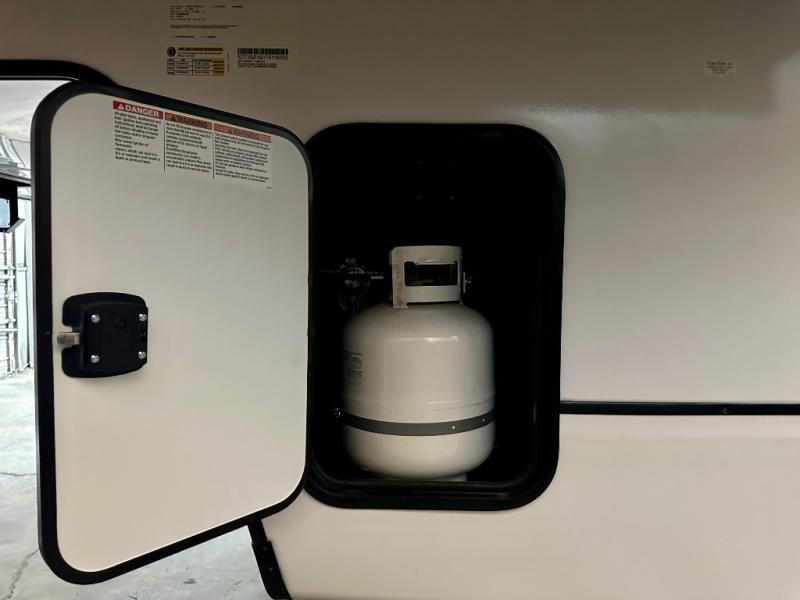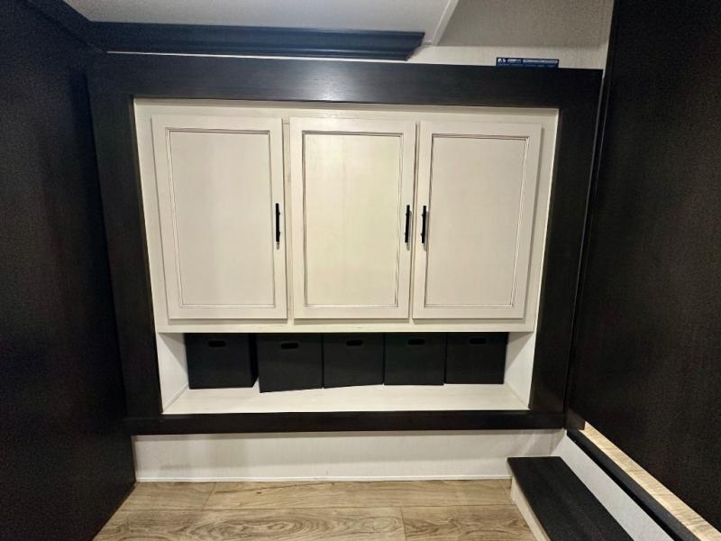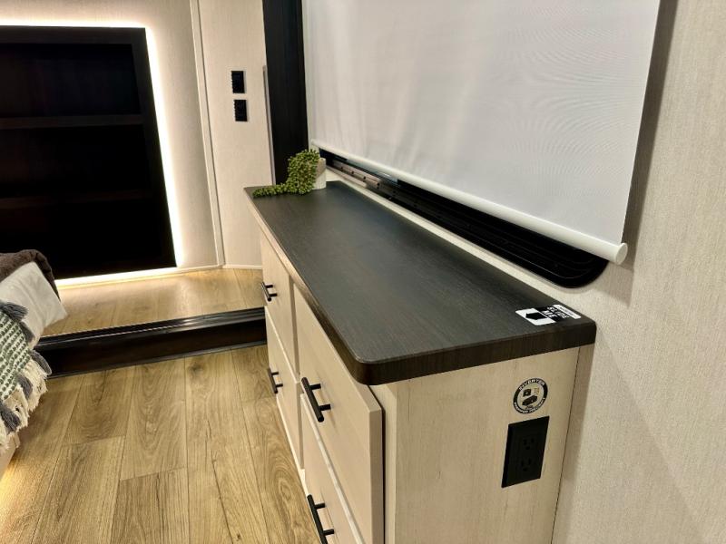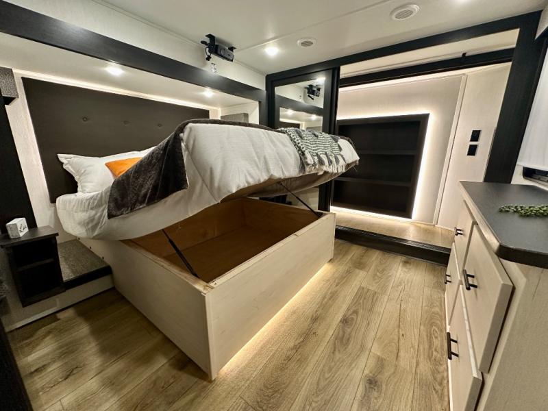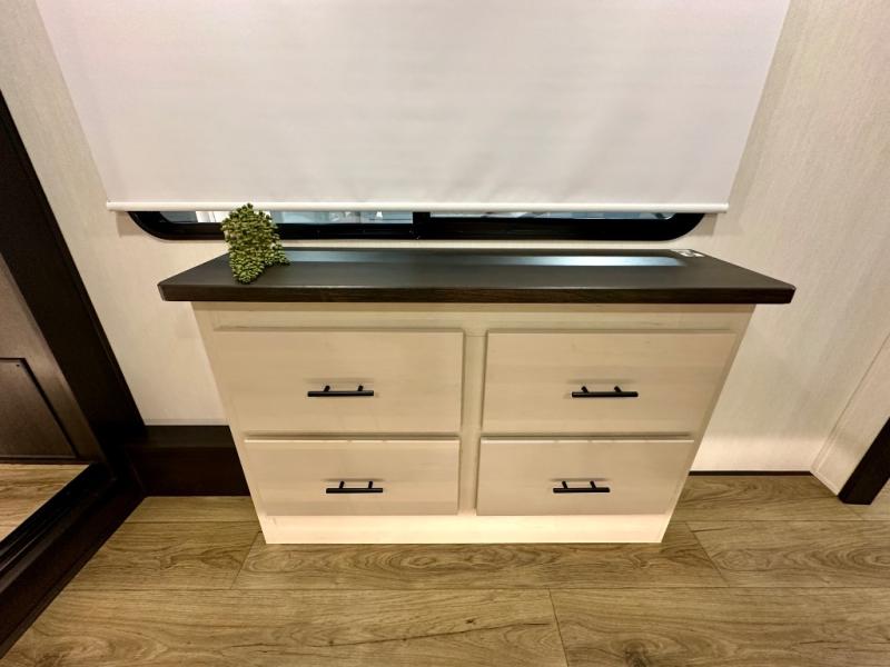 Are you looking for a fifth wheel where you can bring along your neighbor friends? You can do just that since there are two bedrooms in this unit, one of which includes a master bath with its own exterior entry door! The front bedroom is right next to the second full bath for convenience, and includes a camper king bed slide, a dresser, and front wardrobe. The rear master bedroom has a queen bed slide out across from a second slide for more floor space, and there is a loft above this room for more sleeping or storage space. Everyone can meet in the middle kitchen and living room since there are recliners, a ceiling fan, and kitchen island with four chairs. There is also storage below the island for kitchen necessities, and the hidden pantry behind the TV will be perfect for snacks, board games and more!