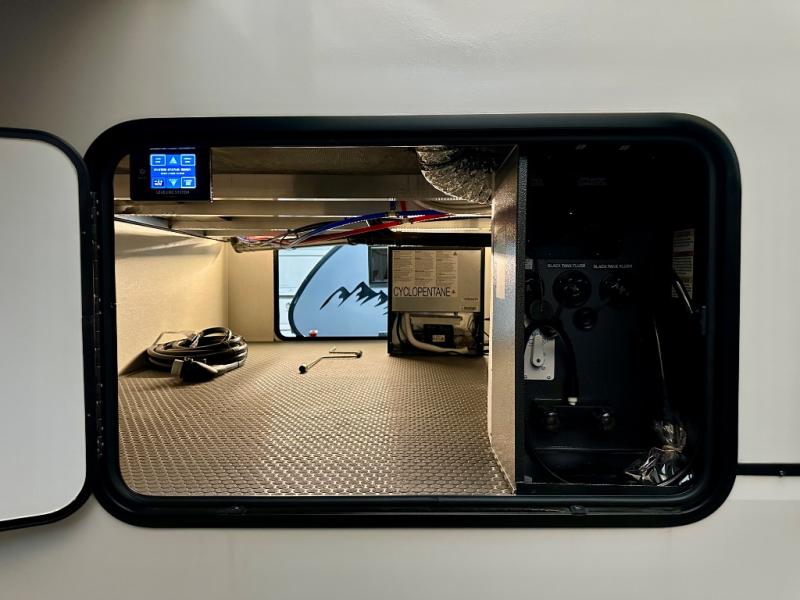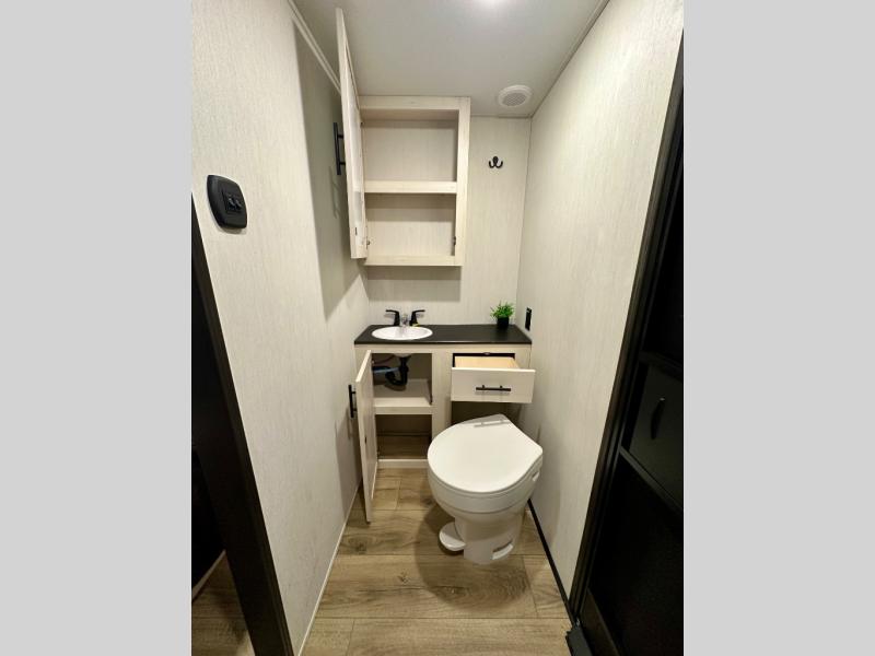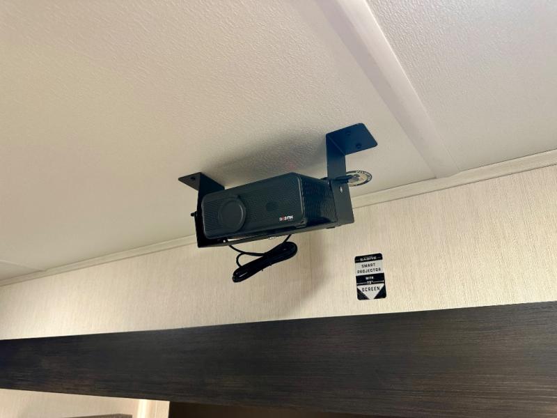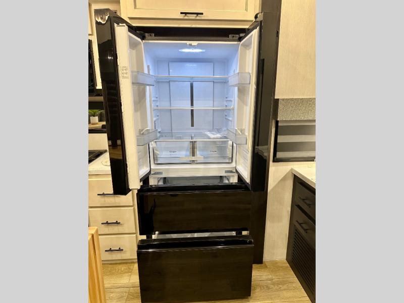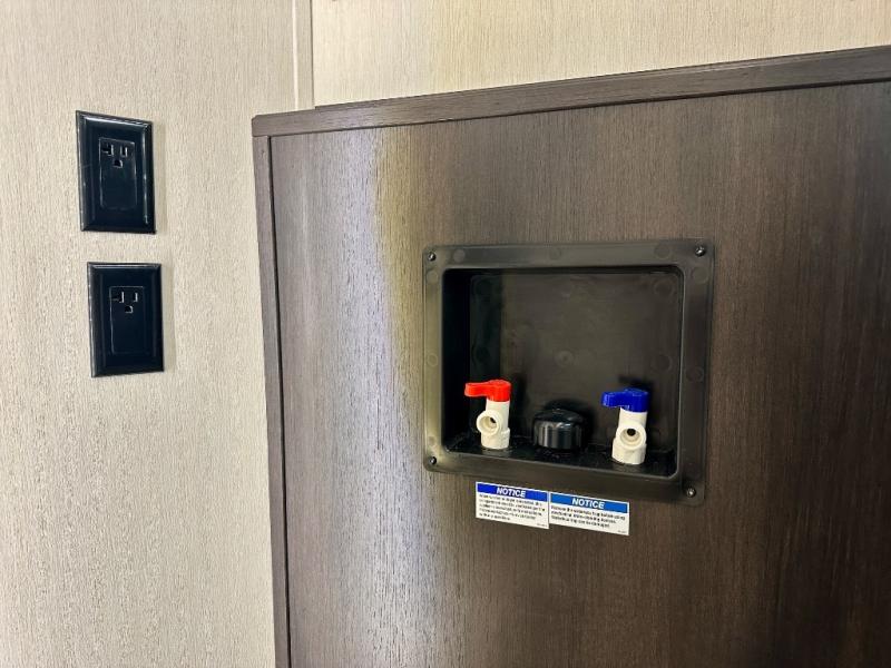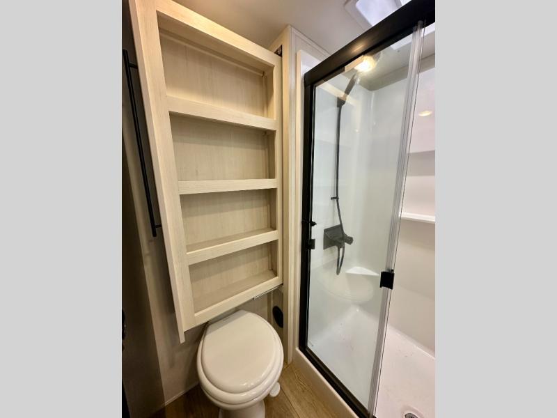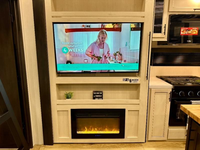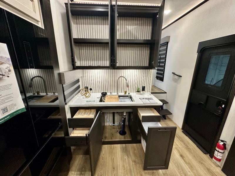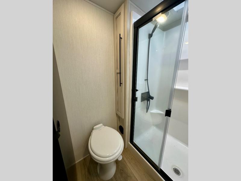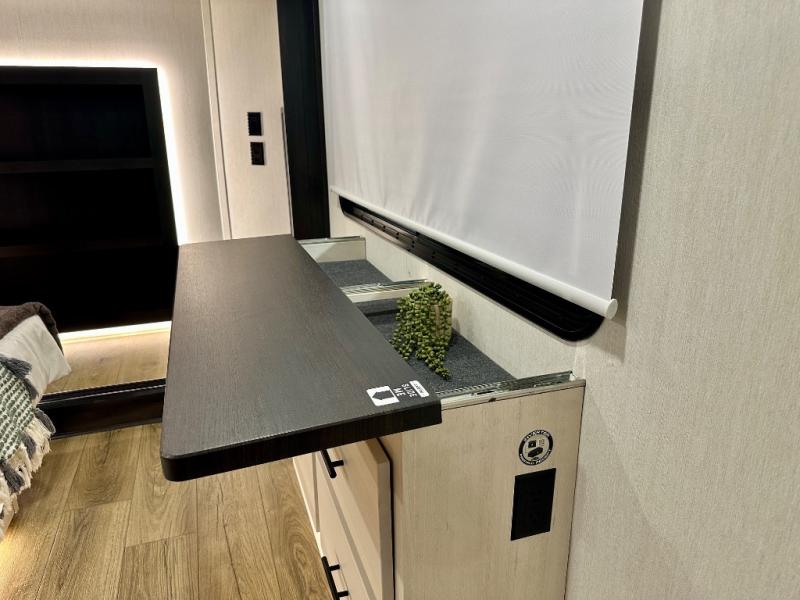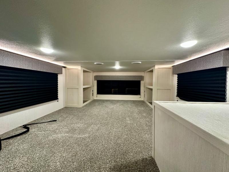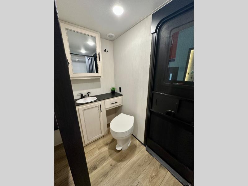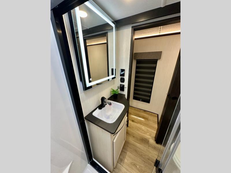 Are you looking for a fifth wheel where you can bring along your neighbor friends? You can do just that since there are two bedrooms in this unit, one of which includes a master bath with its own exterior entry door! The front bedroom is right next to the second full bath for convenience, and includes a camper king bed slide, a dresser, and front wardrobe. The rear master bedroom has a queen bed slide out across from a second slide for more floor space, and there is a loft above this room for more sleeping or storage space. Everyone can meet in the middle kitchen and living room since there are recliners, a ceiling fan, and kitchen island with four chairs. There is also storage below the island for kitchen necessities, and the hidden pantry behind the TV will be perfect for snacks, board games and more!