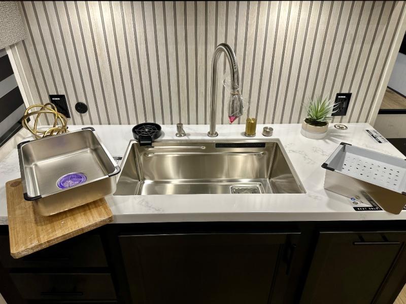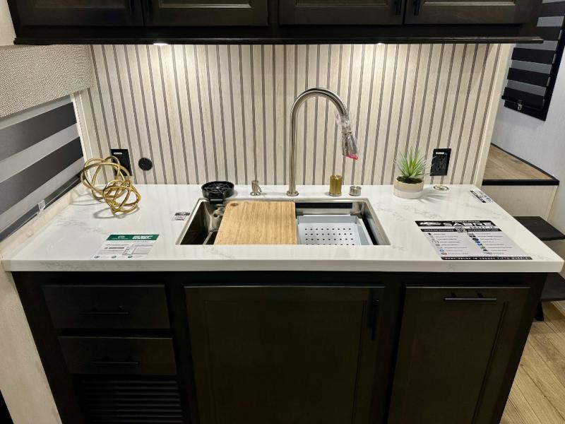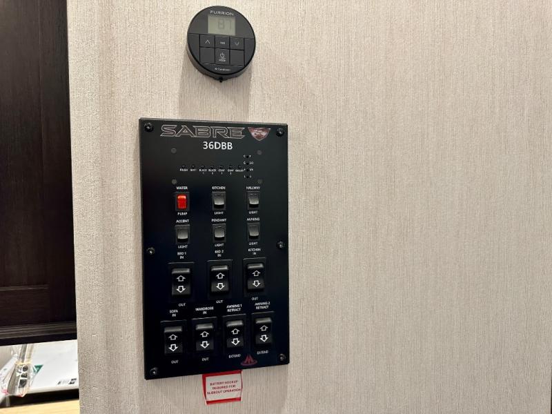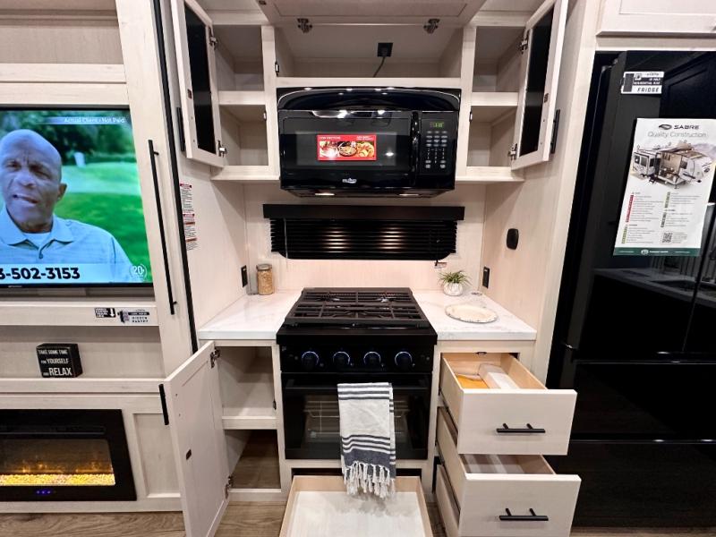 You will experience luxurious camping trips at an affordable price with any one of these Forest River Sabre fifth wheels! These models are durable and ready to travel anytime of the year thanks to features like the high-gloss gel-coat front cap with LED lighting, the PVC roof membrane, and the forced air underbelly with enclosed gate valves. The electric auto-leveling system makes setting up easy and safe, and the adjustable power awning with LED lighting will create an inviting outdoor living space. Each model includes a universal docking station which includes a black tank flush and an outside shower, and adjustable stable steps for you to enter and exit the unit safely. Inside, you will love the design of the ambient accent lighting in the living area, the real wood lumbercore cabinetry, and the linoleum flooring!