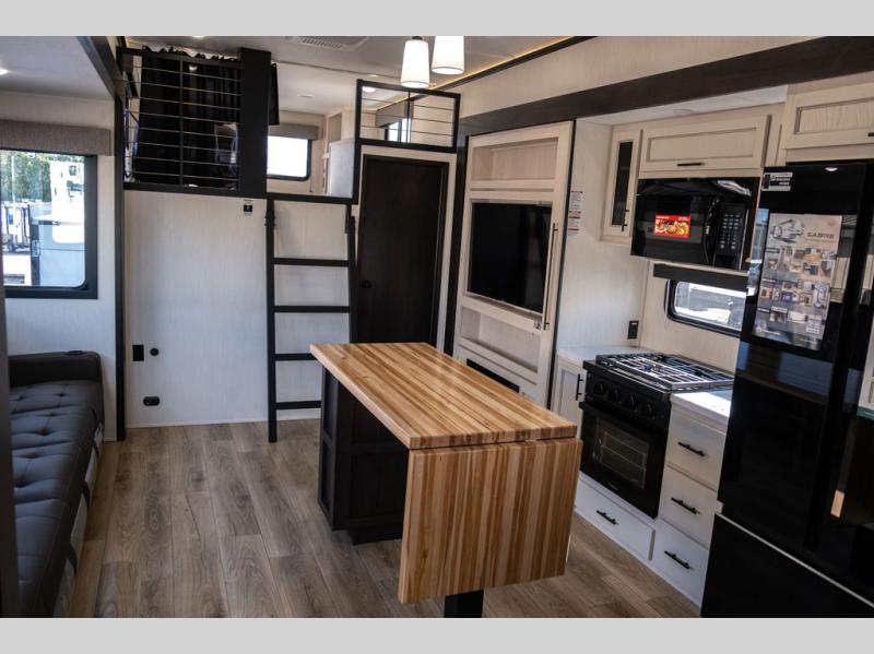 You will experience luxurious camping trips at an affordable price with any one of these Forest River Sabre fifth wheels! These models are durable and ready to travel anytime of the year thanks to features like the high-gloss gel-coat front cap with LED lighting, the PVC roof membrane, and the forced air underbelly with enclosed gate valves. The electric auto-leveling system makes setting up easy and safe, and the adjustable power awning with LED lighting will create an inviting outdoor living space. Each model includes a universal docking station which includes a black tank flush and an outside shower, and adjustable stable steps for you to enter and exit the unit safely. Inside, you will love the design of the ambient accent lighting in the living area, the real wood lumbercore cabinetry, and the linoleum flooring!