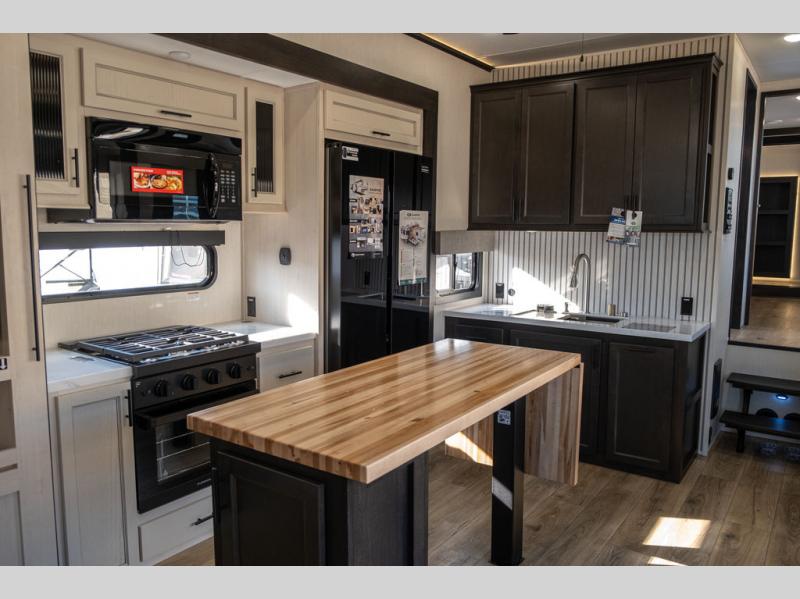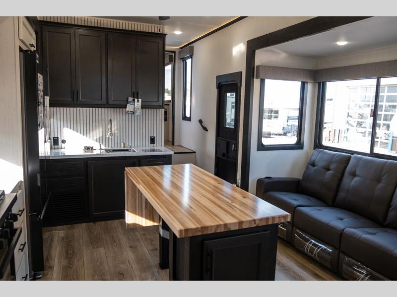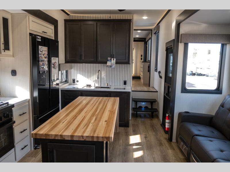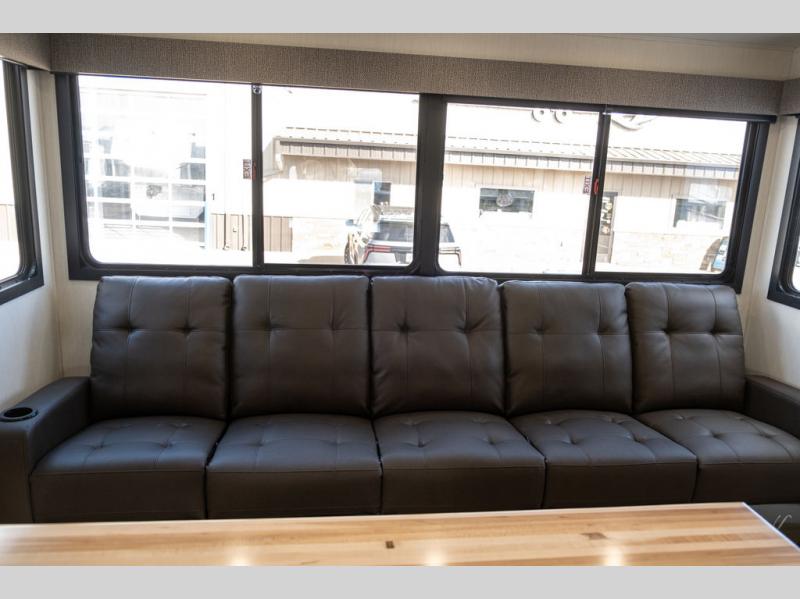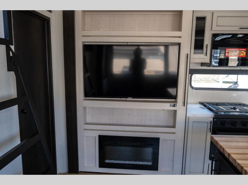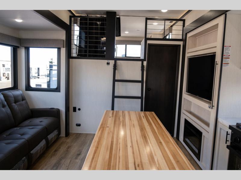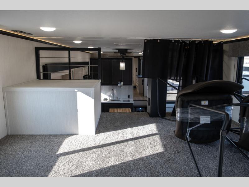 Are you looking for a fifth wheel where you can bring along your neighbor friends? You can do just that since there are two bedrooms in this unit, one of which includes a master bath with its own exterior entry door! The front bedroom is right next to the second full bath for convenience, and includes a camper king bed slide, a dresser, and front wardrobe. The rear master bedroom has a queen bed slide out across from a second slide for more floor space, and there is a loft above this room for more sleeping or storage space. Everyone can meet in the middle kitchen and living room since there are recliners, a ceiling fan, and kitchen island with four chairs. There is also storage below the island for kitchen necessities, and the hidden pantry behind the TV will be perfect for snacks, board games and more!