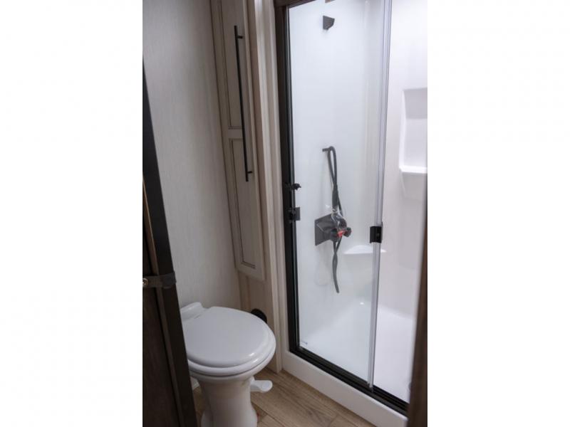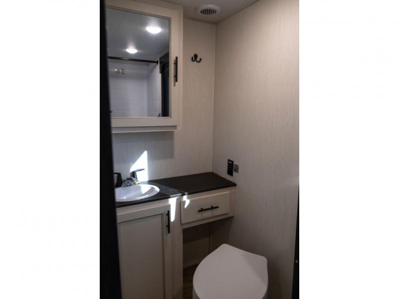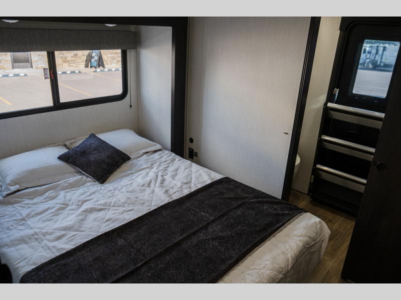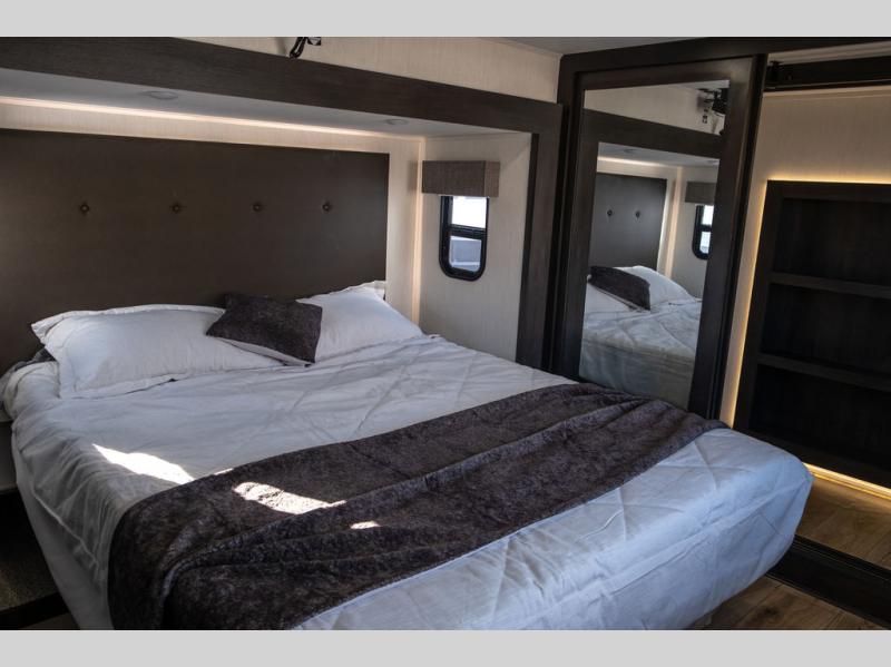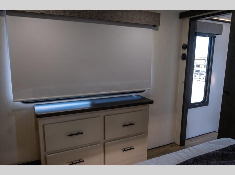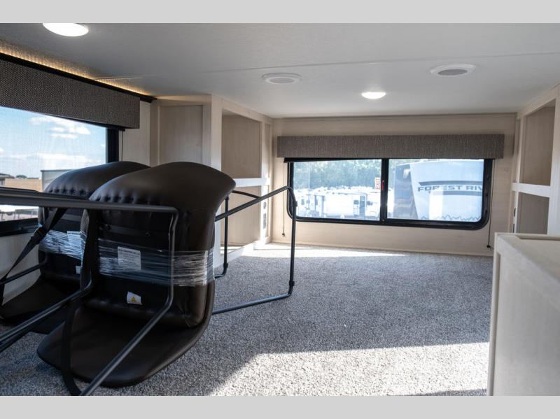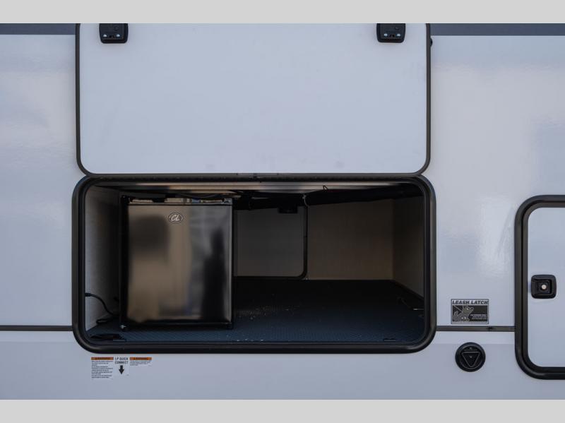 Are you looking for a fifth wheel where you can bring along your neighbor friends? You can do just that since there are two bedrooms in this unit, one of which includes a master bath with its own exterior entry door! The front bedroom is right next to the second full bath for convenience, and includes a camper king bed slide, a dresser, and front wardrobe. The rear master bedroom has a queen bed slide out across from a second slide for more floor space, and there is a loft above this room for more sleeping or storage space. Everyone can meet in the middle kitchen and living room since there are recliners, a ceiling fan, and kitchen island with four chairs. There is also storage below the island for kitchen necessities, and the hidden pantry behind the TV will be perfect for snacks, board games and more!