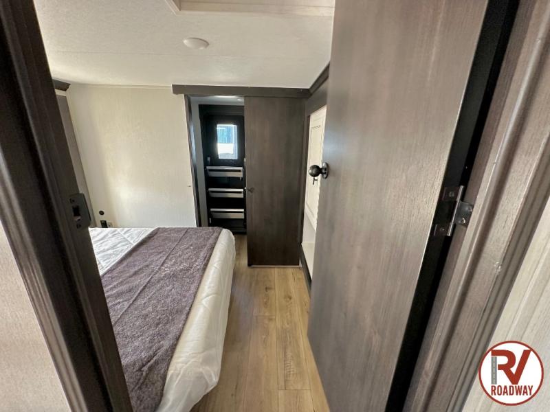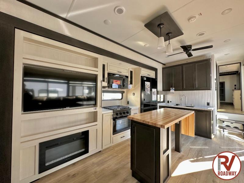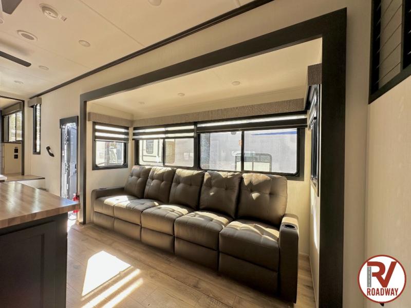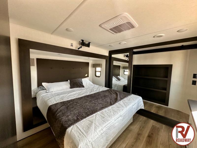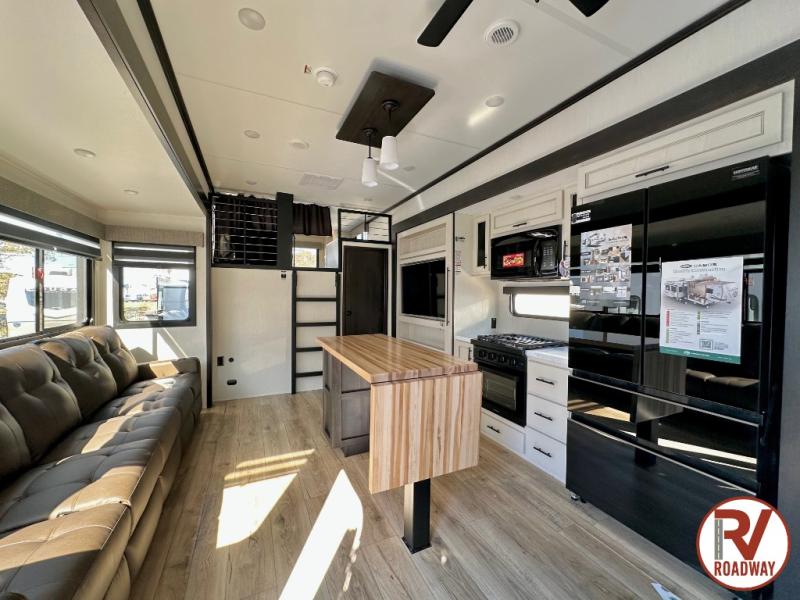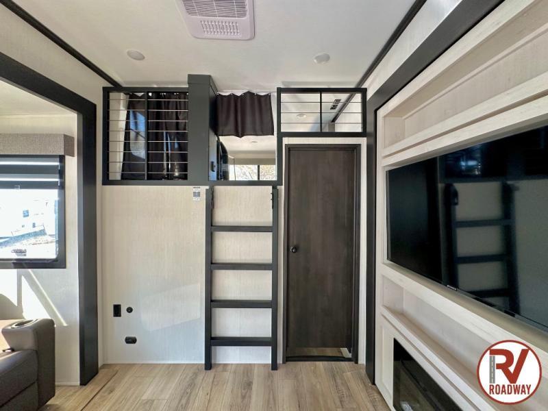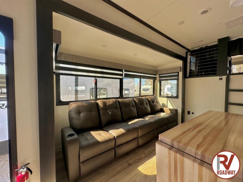 Are you looking for a fifth wheel where you can bring along your neighbor friends? You can do just that since there are two bedrooms in this unit, one of which includes a master bath with its own exterior entry door! The front bedroom is right next to the second full bath for convenience, and includes a camper king bed slide, a dresser, and front wardrobe. The rear master bedroom has a queen bed slide out across from a second slide for more floor space, and there is a loft above this room for more sleeping or storage space. Everyone can meet in the middle kitchen and living room since there are recliners, a ceiling fan, and kitchen island with four chairs. There is also storage below the island for kitchen necessities, and the hidden pantry behind the TV will be perfect for snacks, board games and more!