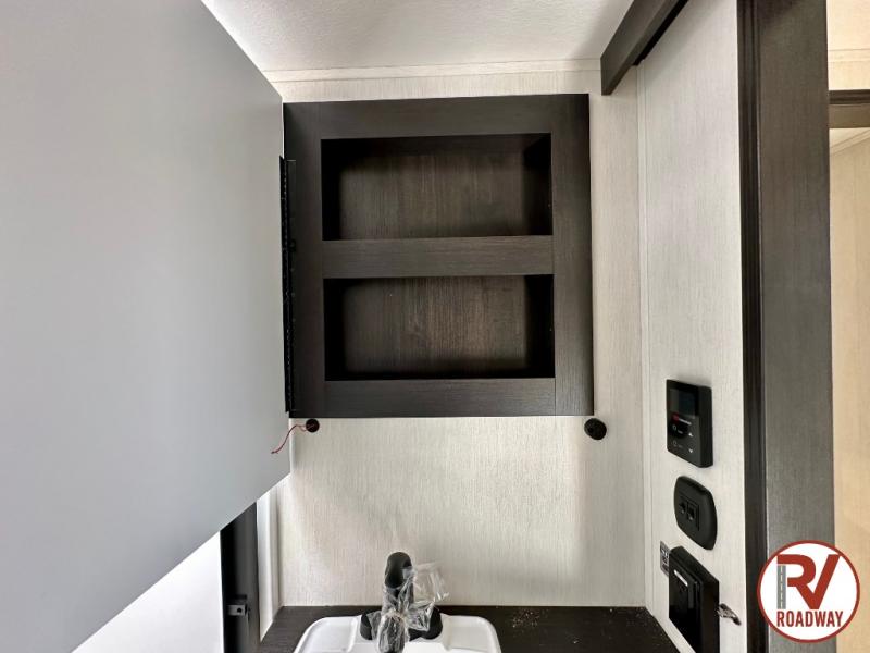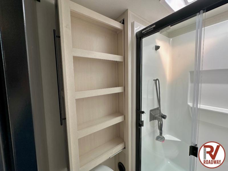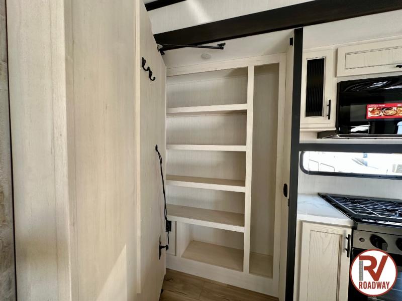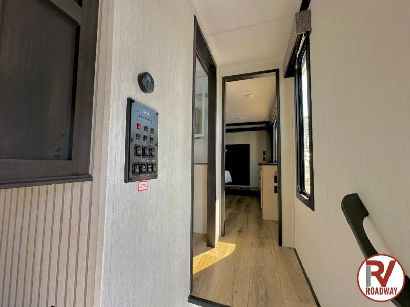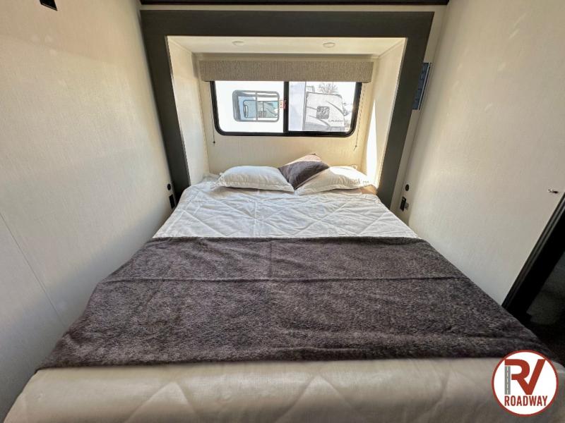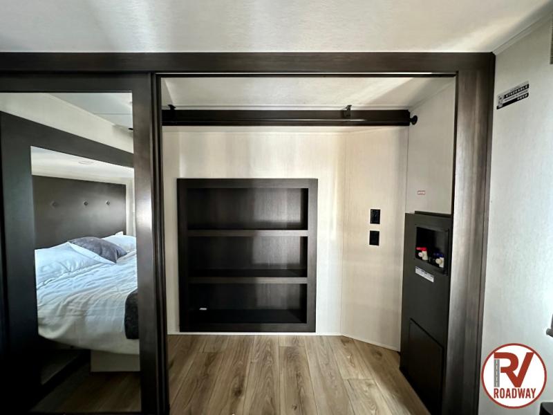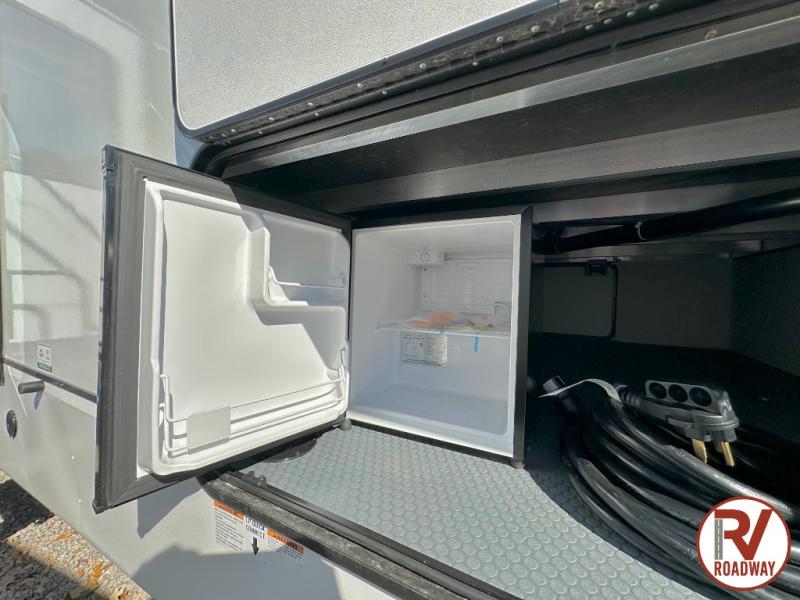 Are you looking for a fifth wheel where you can bring along your neighbor friends? You can do just that since there are two bedrooms in this unit, one of which includes a master bath with its own exterior entry door! The front bedroom is right next to the second full bath for convenience, and includes a camper king bed slide, a dresser, and front wardrobe. The rear master bedroom has a queen bed slide out across from a second slide for more floor space, and there is a loft above this room for more sleeping or storage space. Everyone can meet in the middle kitchen and living room since there are recliners, a ceiling fan, and kitchen island with four chairs. There is also storage below the island for kitchen necessities, and the hidden pantry behind the TV will be perfect for snacks, board games and more!