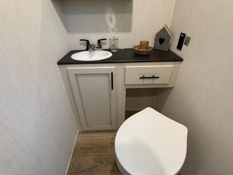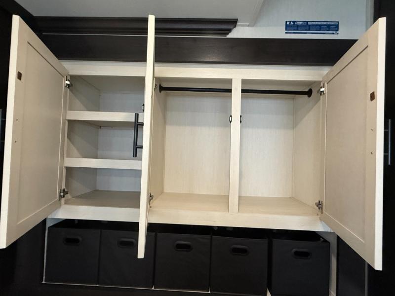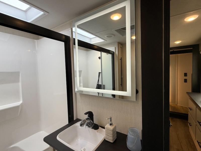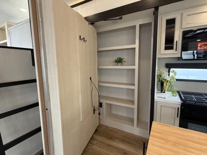 Are you looking for a fifth wheel where you can bring along your neighbor friends? You can do just that since there are two bedrooms in this unit, one of which includes a master bath with its own exterior entry door! The front bedroom is right next to the second full bath for convenience, and includes a camper king bed slide, a dresser, and front wardrobe. The rear master bedroom has a queen bed slide out across from a second slide for more floor space, and there is a loft above this room for more sleeping or storage space. Everyone can meet in the middle kitchen and living room since there are recliners, a ceiling fan, and kitchen island with four chairs. There is also storage below the island for kitchen necessities, and the hidden pantry behind the TV will be perfect for snacks, board games and more!
