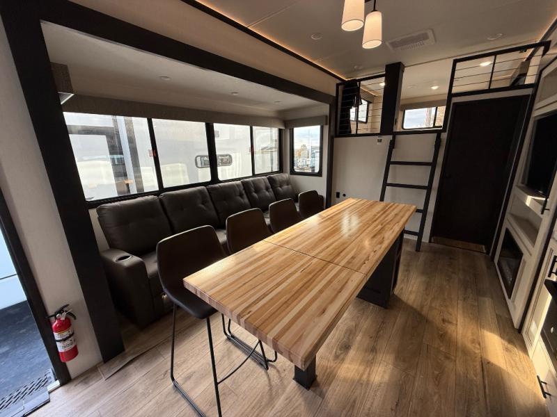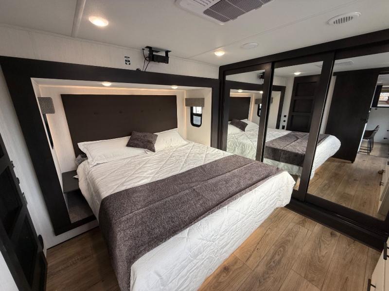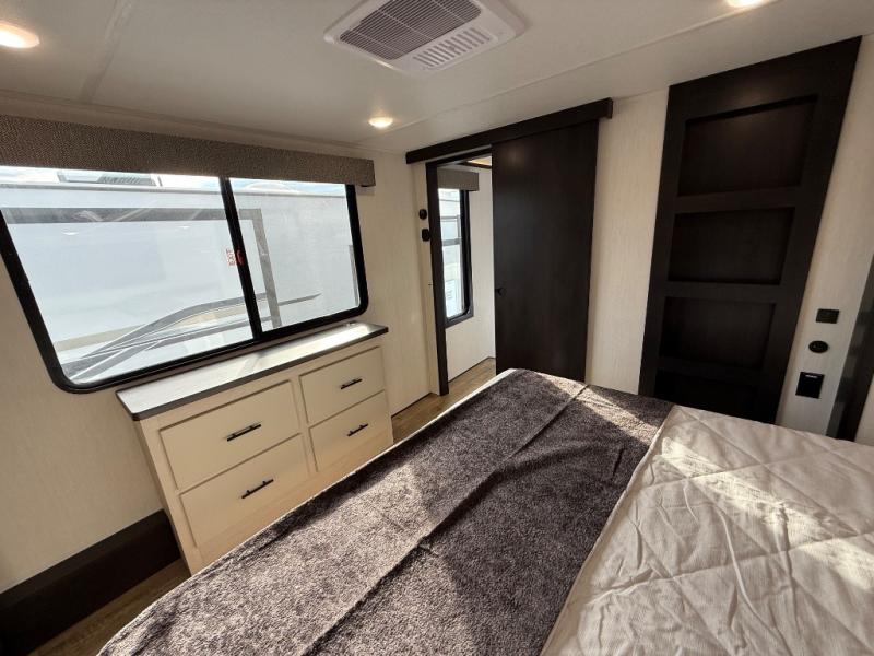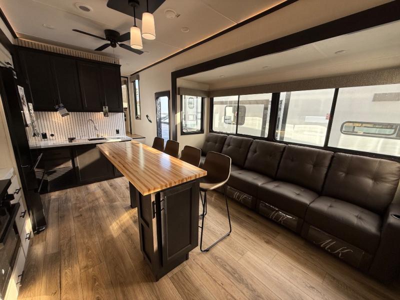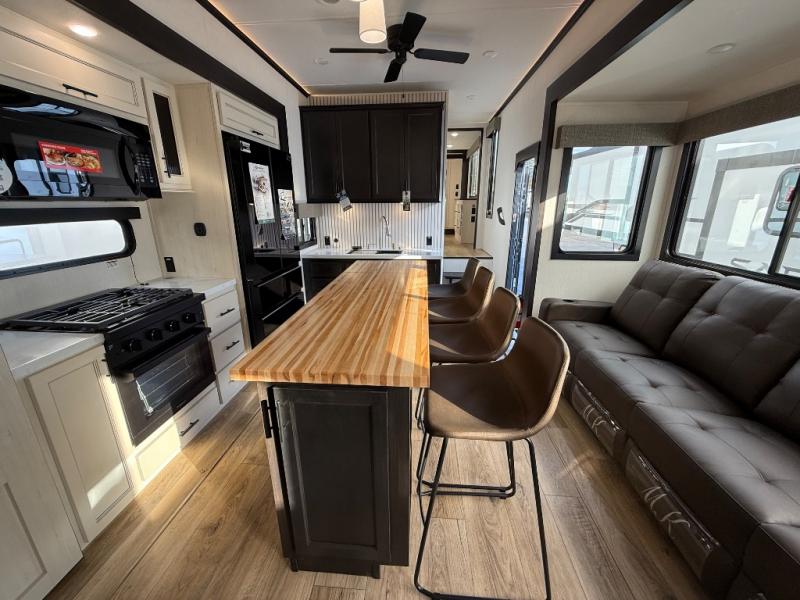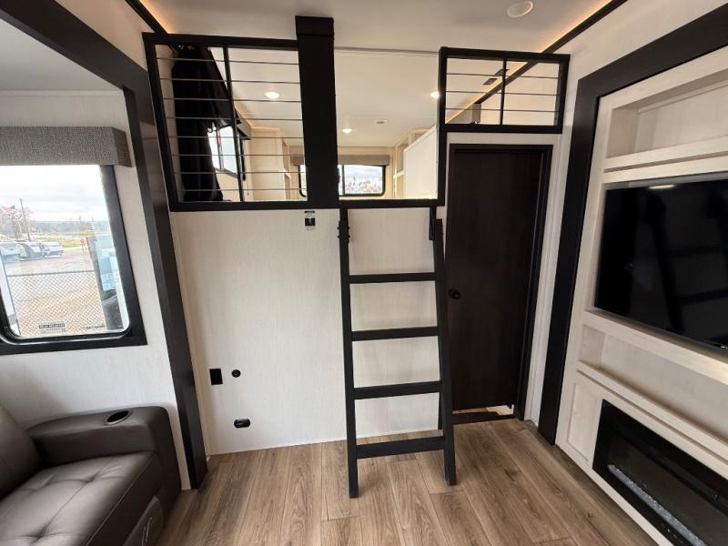 Are you looking for a fifth wheel where you can bring along your neighbor friends? You can do just that since there are two bedrooms in this unit, one of which includes a master bath with its own exterior entry door! The front bedroom is right next to the second full bath for convenience, and includes a camper king bed slide, a dresser, and front wardrobe. The rear master bedroom has a queen bed slide out across from a second slide for more floor space, and there is a loft above this room for more sleeping or storage space. Everyone can meet in the middle kitchen and living room since there are recliners, a ceiling fan, and kitchen island with four chairs. There is also storage below the island for kitchen necessities, and the hidden pantry behind the TV will be perfect for snacks, board games and more!