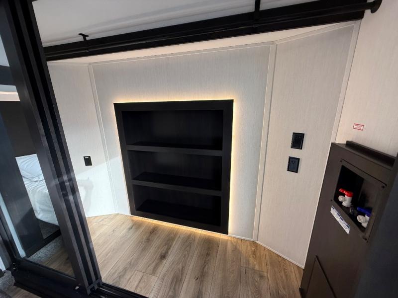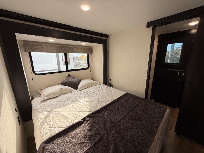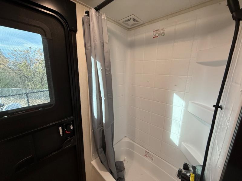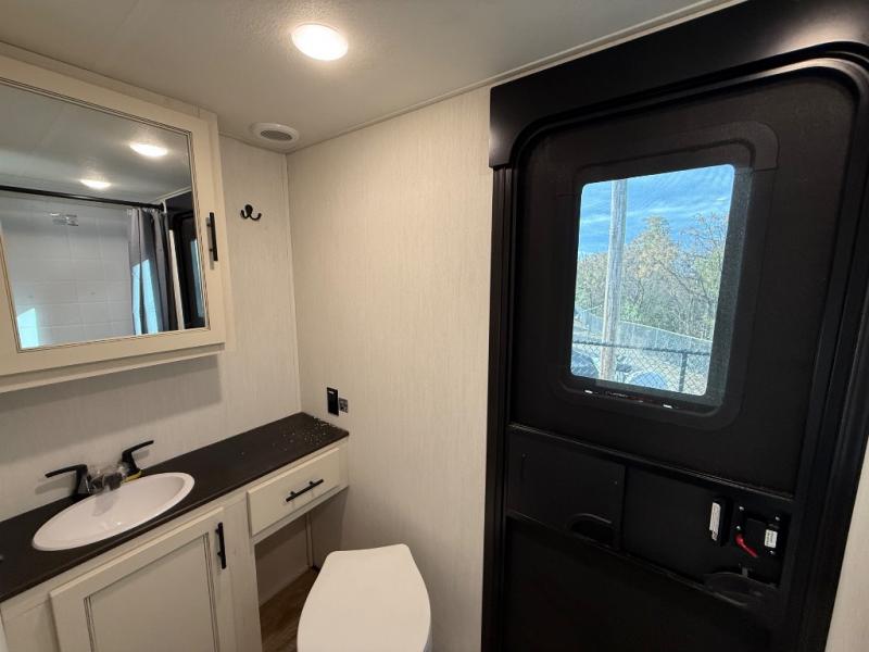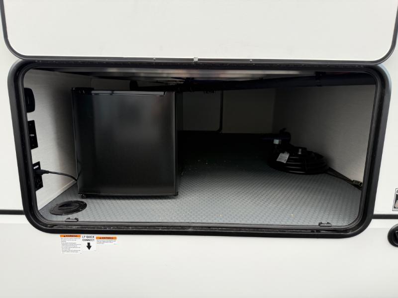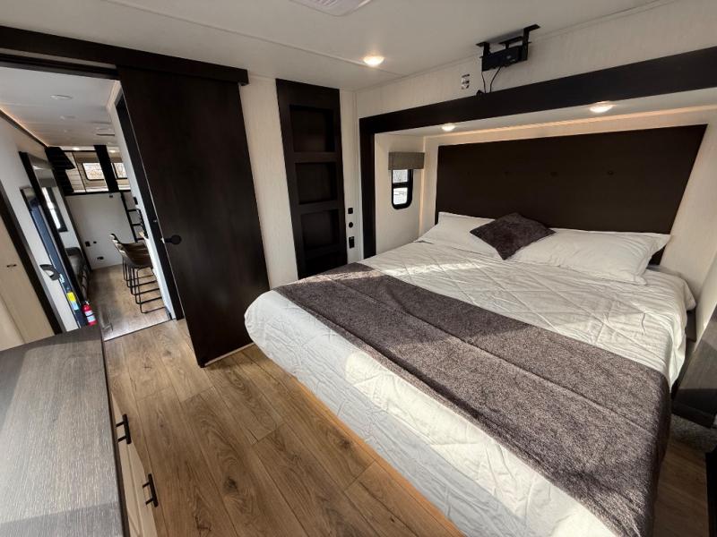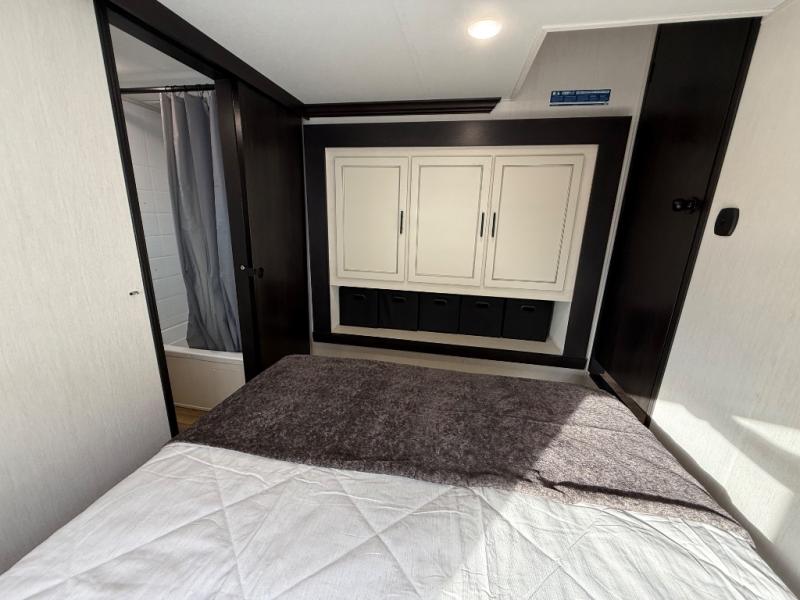 Are you looking for a fifth wheel where you can bring along your neighbor friends? You can do just that since there are two bedrooms in this unit, one of which includes a master bath with its own exterior entry door! The front bedroom is right next to the second full bath for convenience, and includes a camper king bed slide, a dresser, and front wardrobe. The rear master bedroom has a queen bed slide out across from a second slide for more floor space, and there is a loft above this room for more sleeping or storage space. Everyone can meet in the middle kitchen and living room since there are recliners, a ceiling fan, and kitchen island with four chairs. There is also storage below the island for kitchen necessities, and the hidden pantry behind the TV will be perfect for snacks, board games and more!