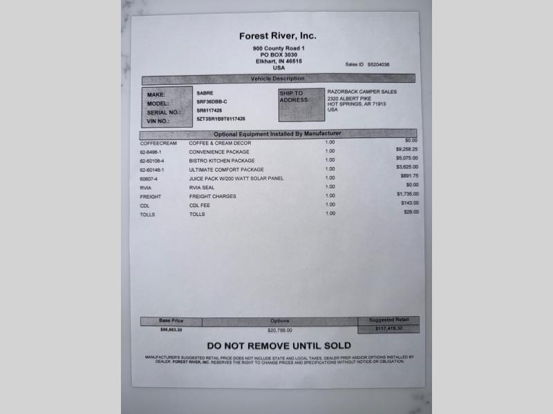 New 2026 Forest River RV Sabre 36DBB Fifth Wheel