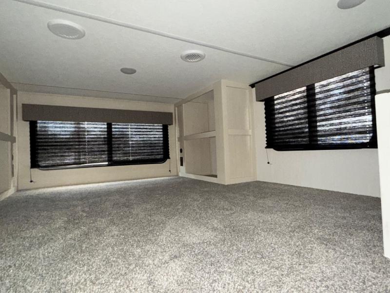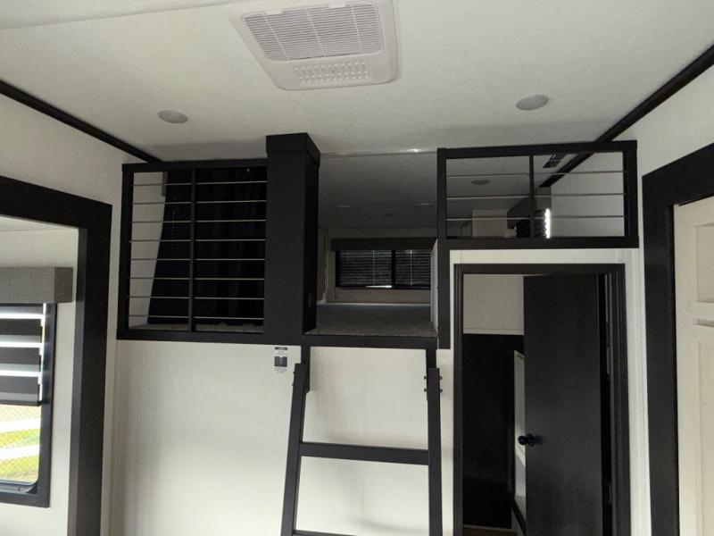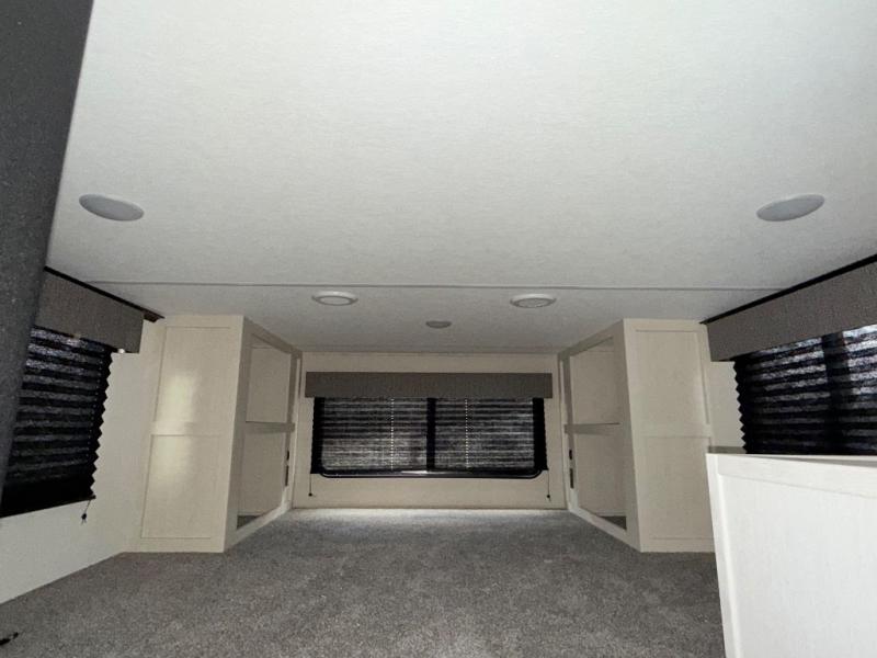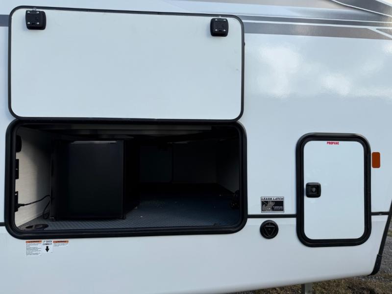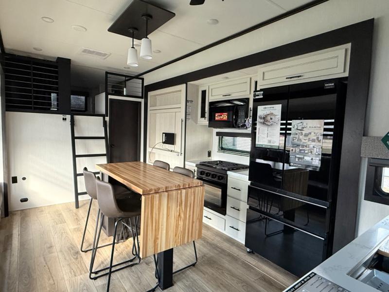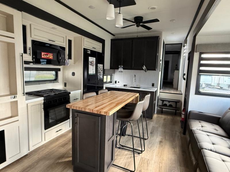 Are you looking for a fifth wheel where you can bring along your neighbor friends? You can do just that since there are two bedrooms in this unit, one of which includes a master bath with its own exterior entry door! The front bedroom is right next to the second full bath for convenience, and includes a camper king bed slide, a dresser, and front wardrobe. The rear master bedroom has a queen bed slide out across from a second slide for more floor space, and there is a loft above this room for more sleeping or storage space. Everyone can meet in the middle kitchen and living room since there are recliners, a ceiling fan, and kitchen island with four chairs. There is also storage below the island for kitchen necessities, and the hidden pantry behind the TV will be perfect for snacks, board games and more!